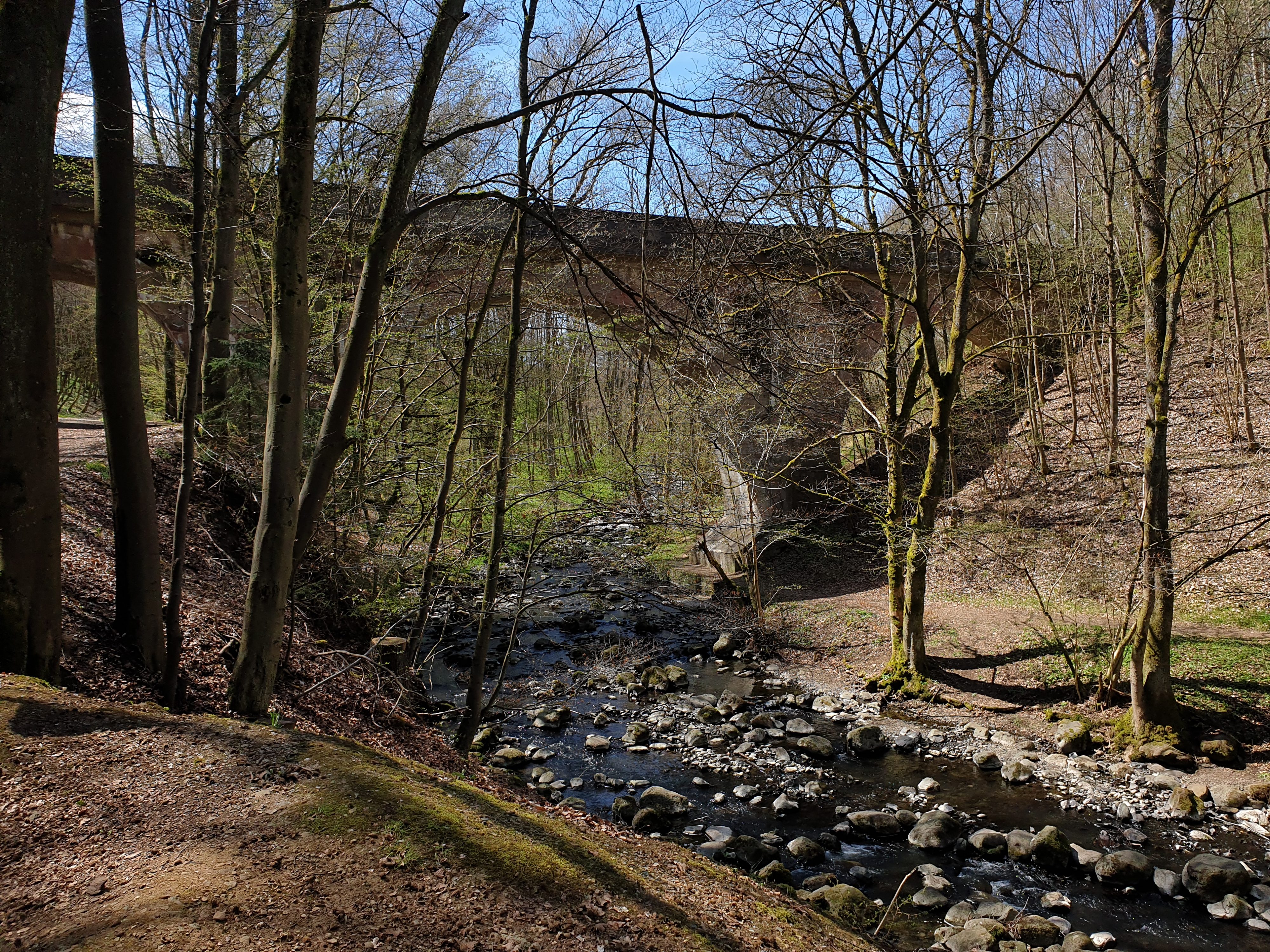 Wir starten vom Wanderparkplatz Wildweiberhäuschen aus. Es ist noch kalt aber sonnig. Es geht an einer Quelle vorbei zum Langenbacher Viadukt in das Aubachtal.