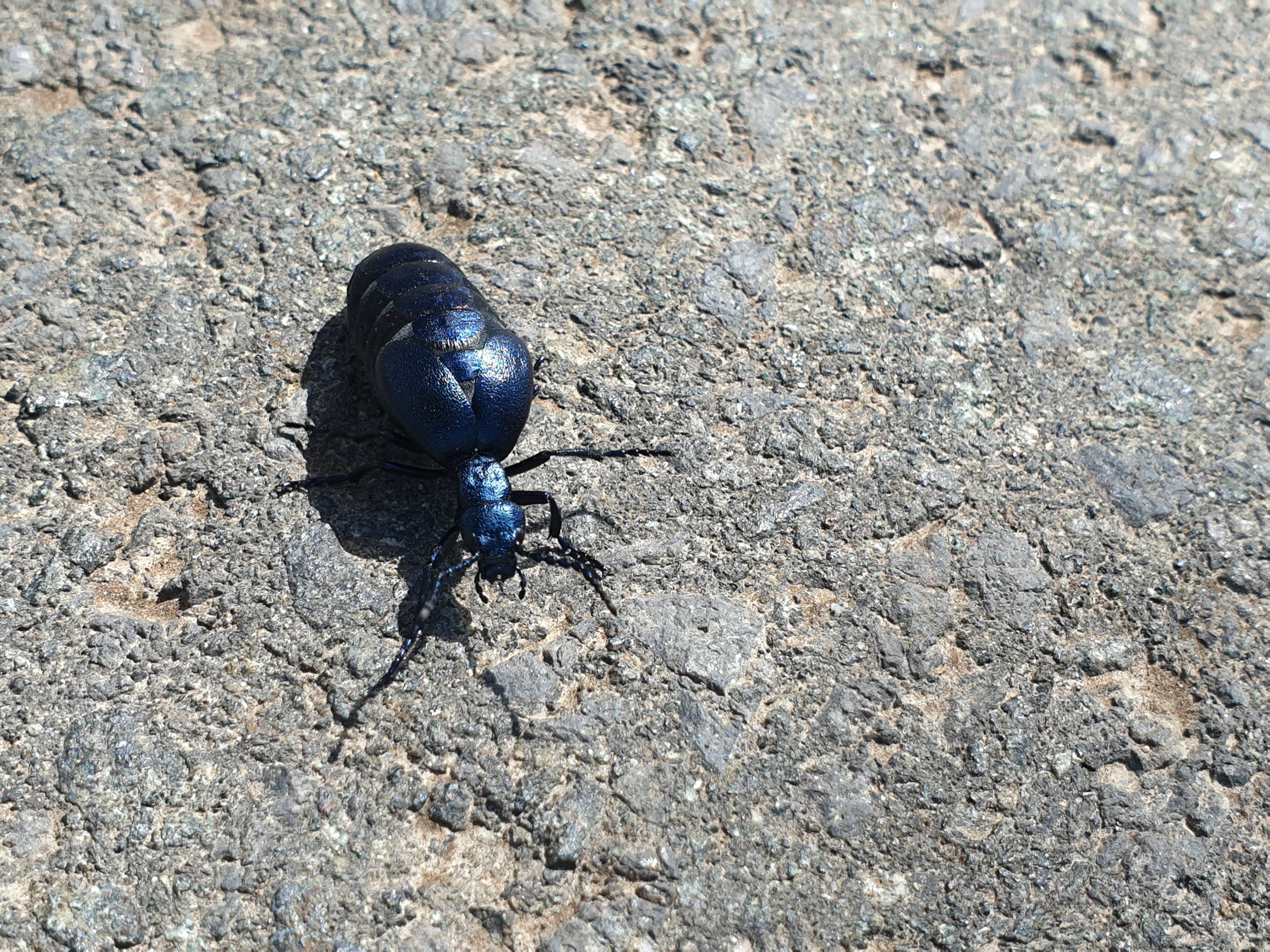 Unterwegs treffen wir auf diesen Käfer. Es handelt sich um einen Pflasterkäfer, Ölkäfer oder Maiwurm.