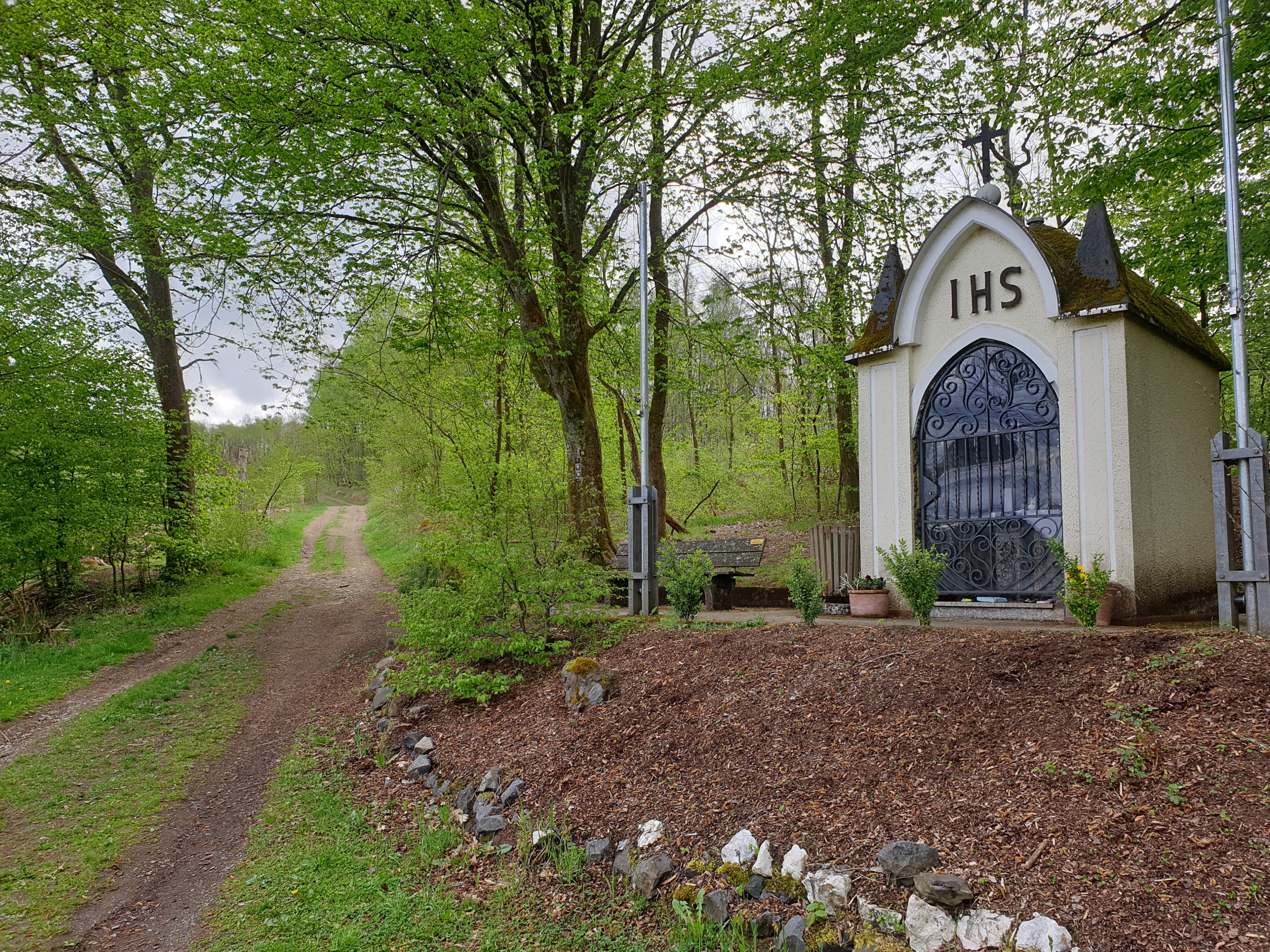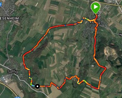 Für die zweite Etappe wurde auf den Wanderanhänger zu Gunsten eines mittelgroßen Rucksacks mit 2,5 Liter Wasser verzichtet. Es sollte ein höherer Laufanteil im Tempo um 8 Minuten pro Kilometer erreicht werden. Zusammen mit den Wanderanteilen bergauf sollten 10 Minuten pro Kilometer erreicht werden. Das hat auch funktioniert, wenn auch der Anblick des altersgebeugten Schlurfschritts bei den begegnenden Spaziergängern und Radfahrern Mitleidswellen ausgelöst haben dürften. Am Ende haben sich die Schmerzen in der Leistengegend, die aktuell auch beim Wandern auf den mangelnden körperlichen Zustand der beanspruchten Sehnen hinweisen, deutlich in den Vordergrund geschoben.