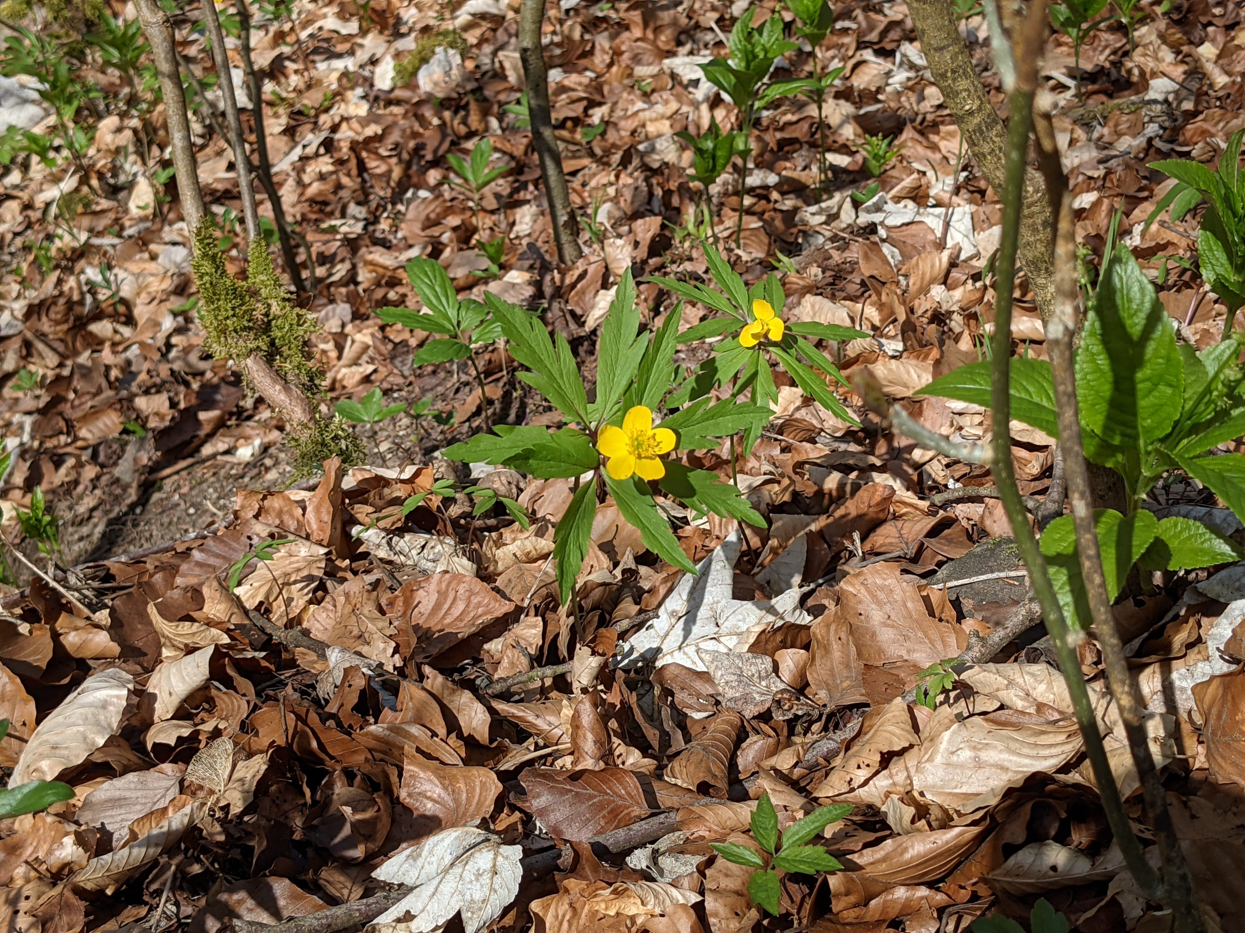 Der Wald im Aubachtal ist voller Frühlingsblüher. Wir entdecken sogar gelbe Buschwindröschen.