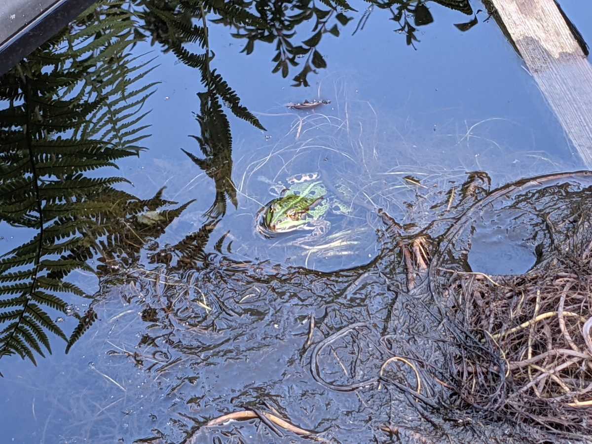 - Seit diesem Jahr gibt es einen wunderschönen grünen Teichfrosch im Garten, der allerdings auch schon mal zum Teich der Nachbarn wechselt. Wenn er bei uns ist, liegt er im Sonnenschein auf dem Seerosen-Wurzelballen, um Fliegen zu fangen.