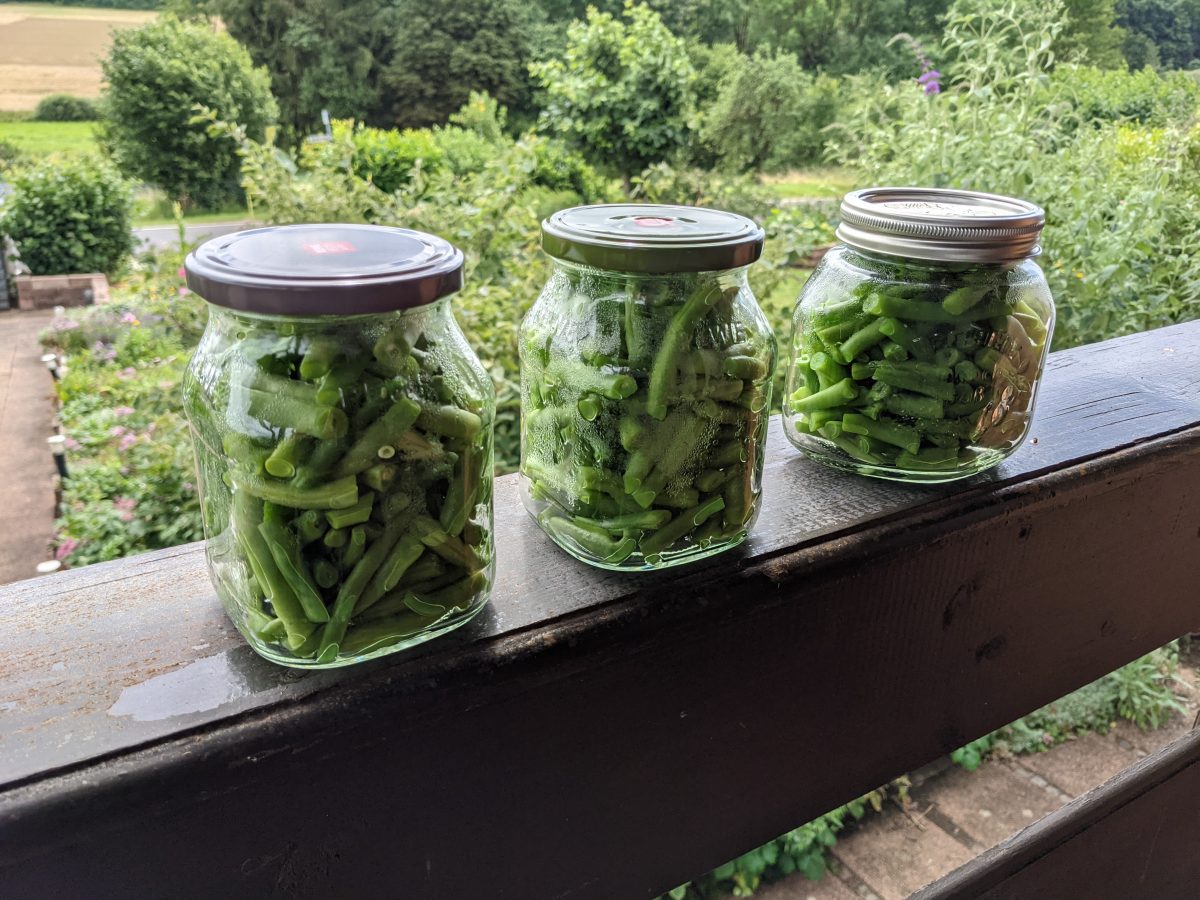 Nach dem kühlen Frühjahr war der Sommer insgesamt sehr feucht. Trotzdem konnte im Garten viel Gemüse geerntet werden. Beendet ist nun die Ernte der Buschbohnen. Sie werden nicht eingekocht sondern eingefroren. Um aber keine Plastiktüten zu verwenden, wird das Gemüse ab diesem Jahr in Einkochgläser oder Gurkengläser eingefroren. Dadurch benötigt man nur etwas mehr Platz in der Gefriertruhe, vermeidet langfristig aber viel Plastikmüll.