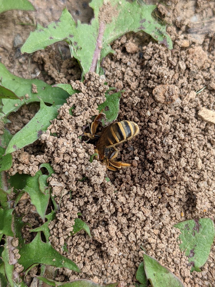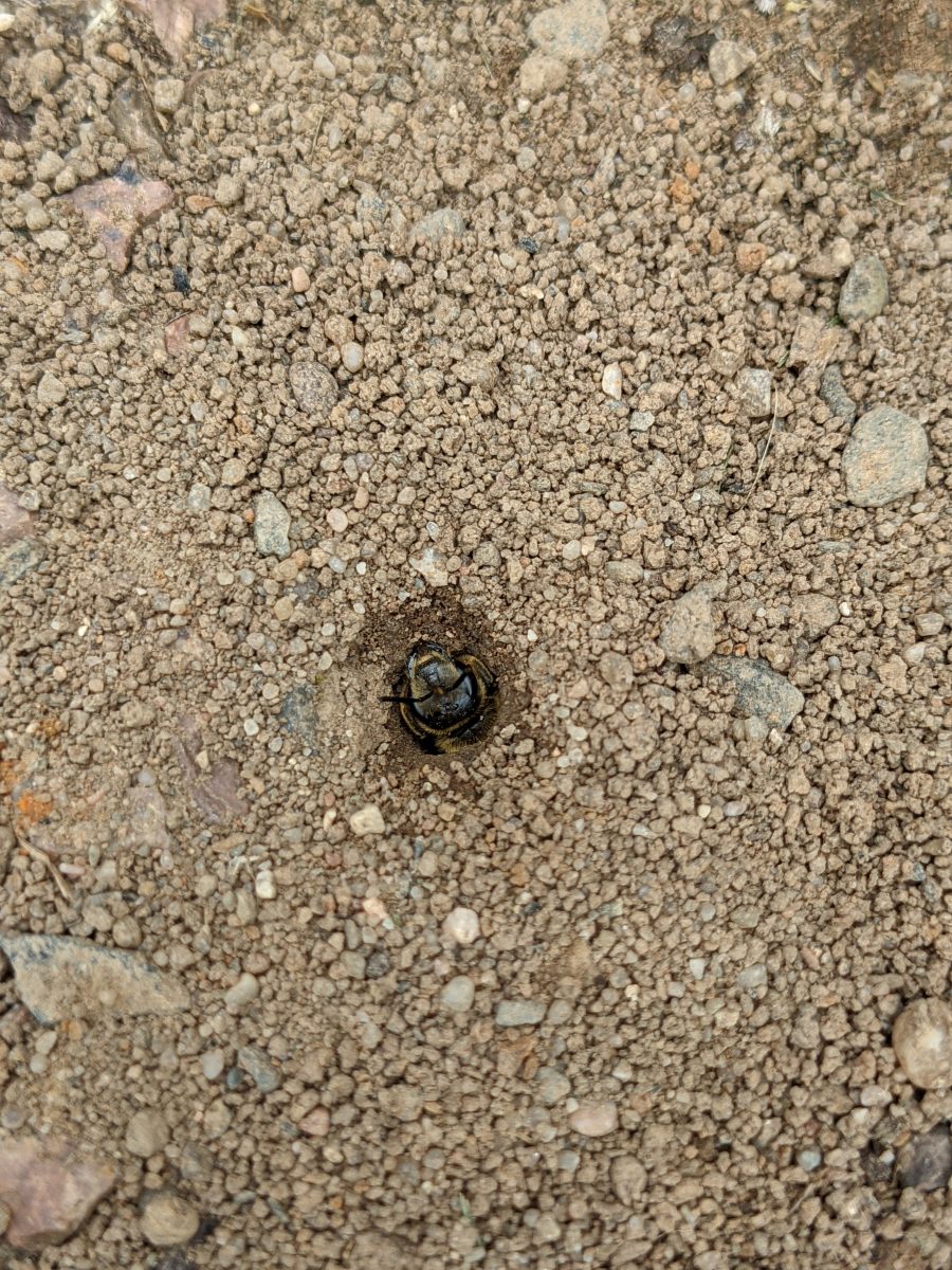 - Zum ersten Mal konnten wir die Nester von Sandbienen zwischen Wegplatten entdecken. Es schaut immer eine Biene aus einem Nest heraus.