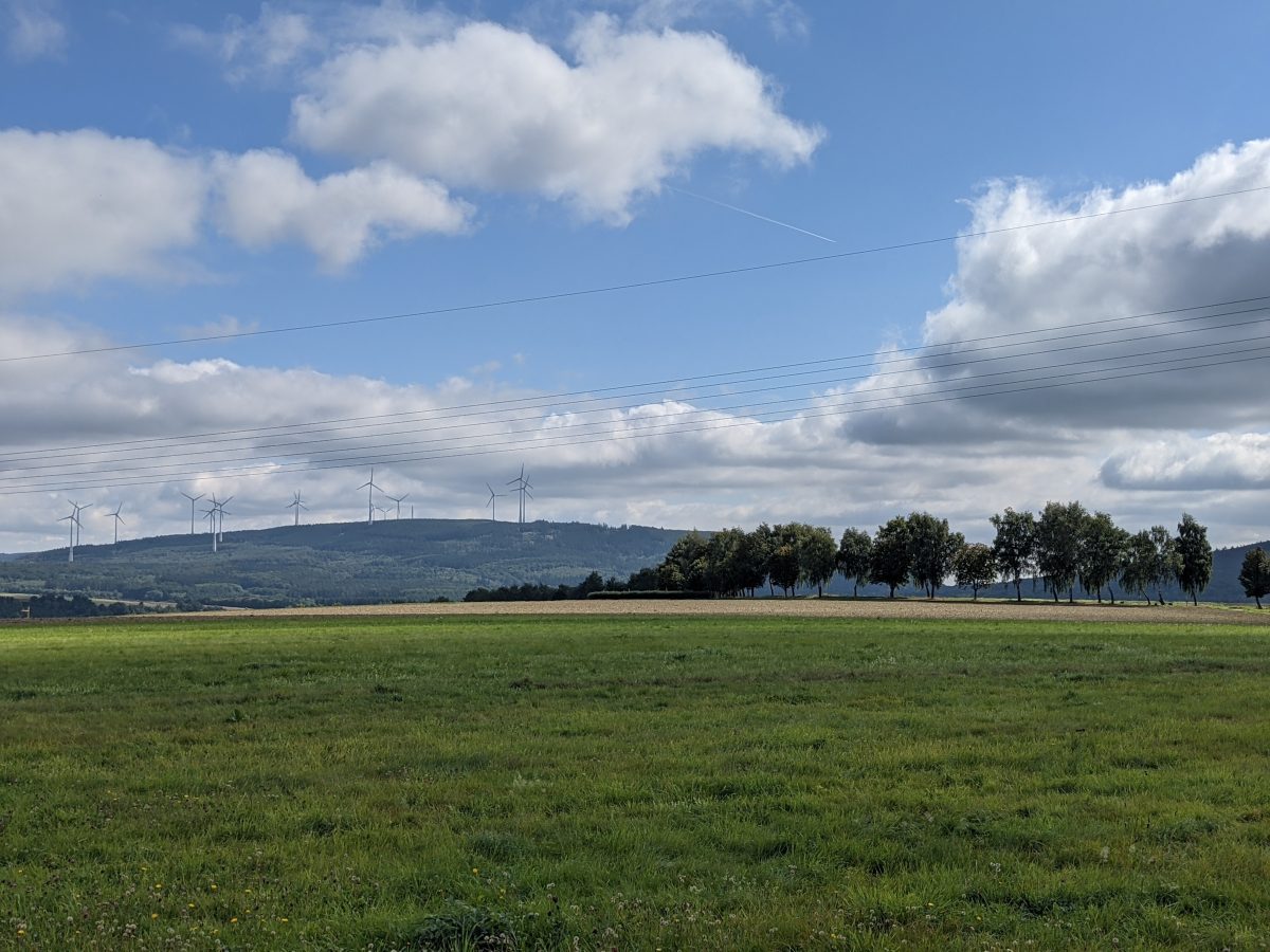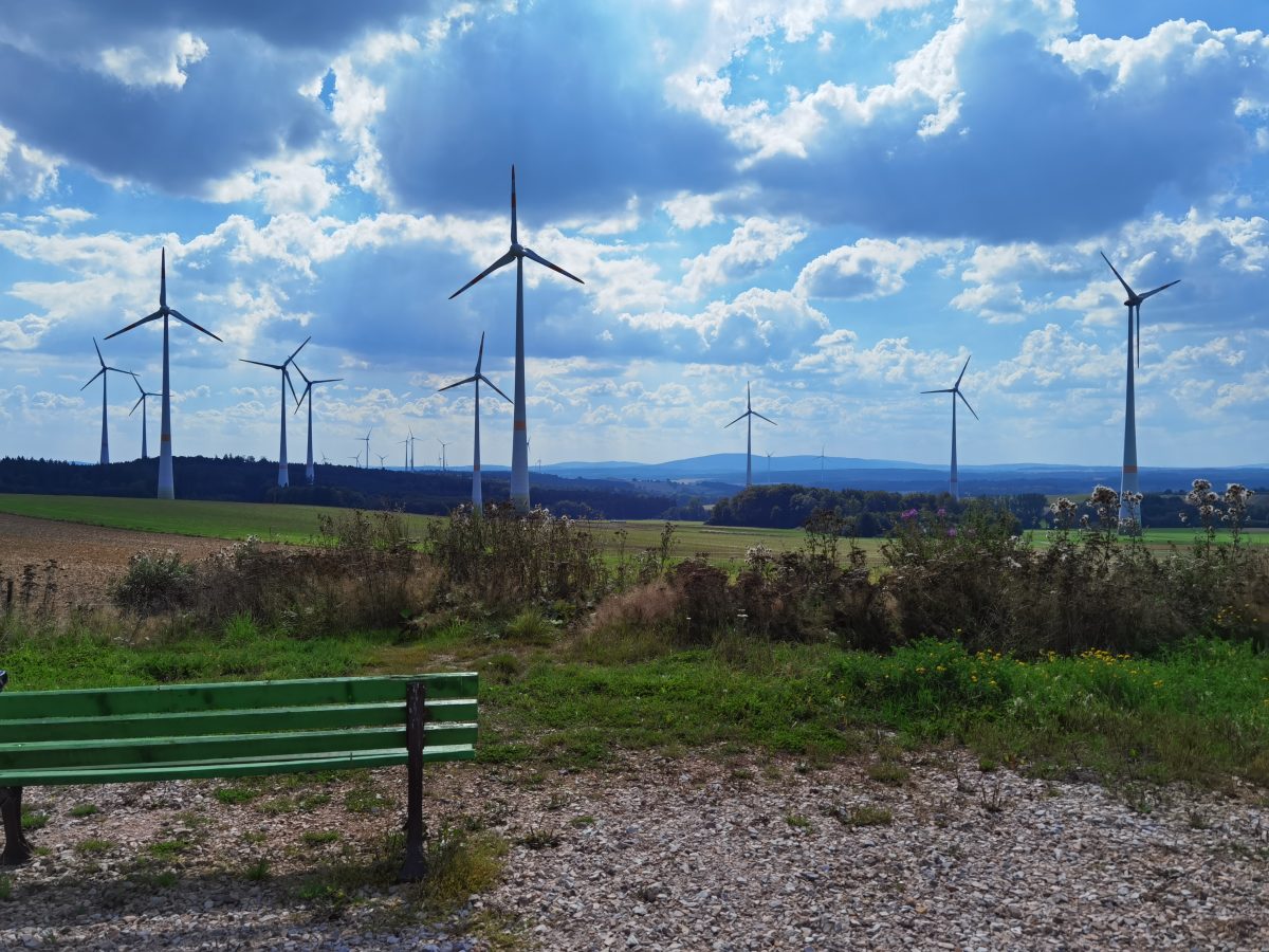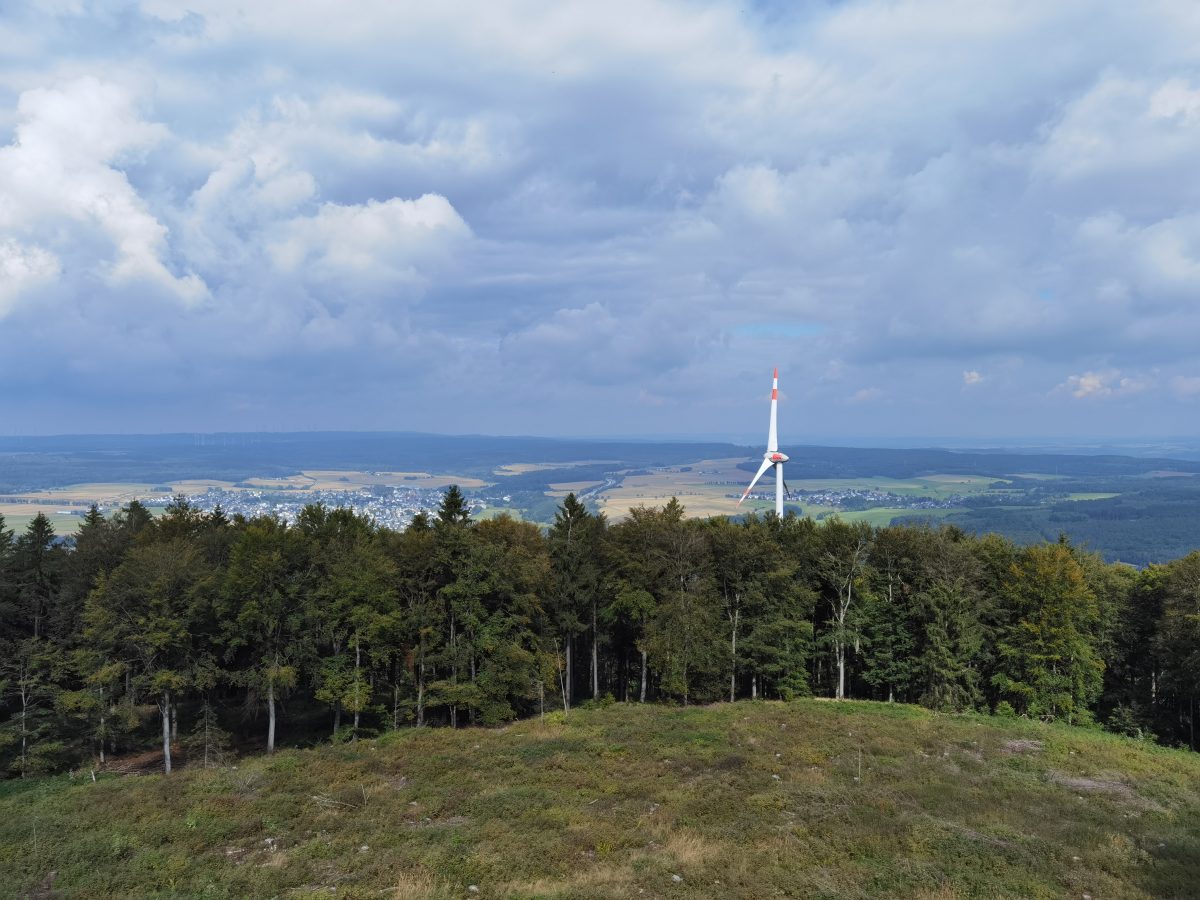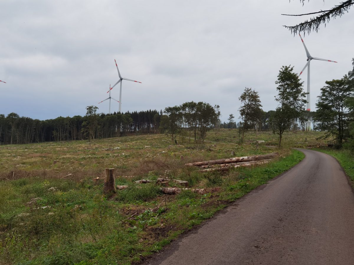 Dieses Mal fahren wir in den Soonwald und starten vom Parkplatz Schanzenkopf die Hochsteinrunde. Es geht an ganz vielen Windrädern vorbei. Insgesamt scheint es im Hunsrück eine viel größere Anzahl an Windrädern zu geben als im Westerwald.