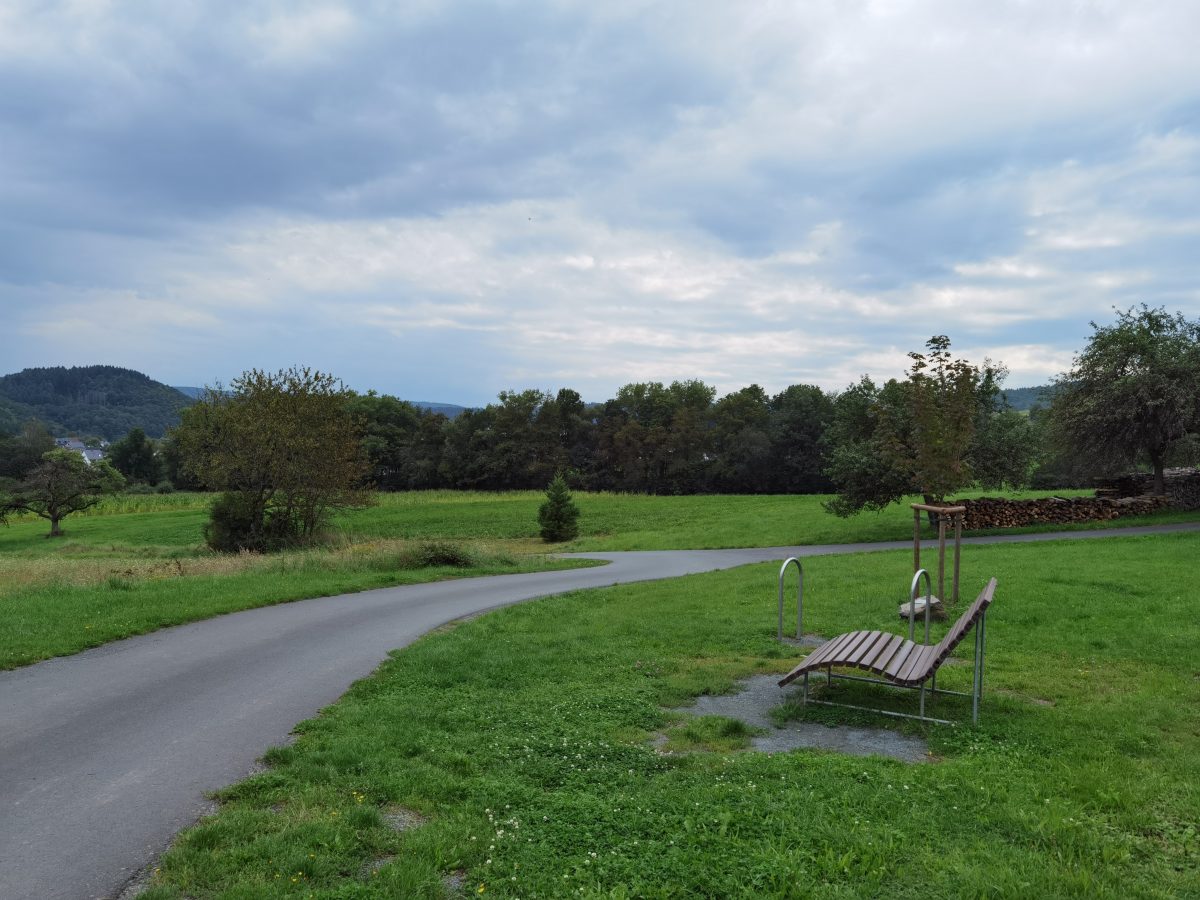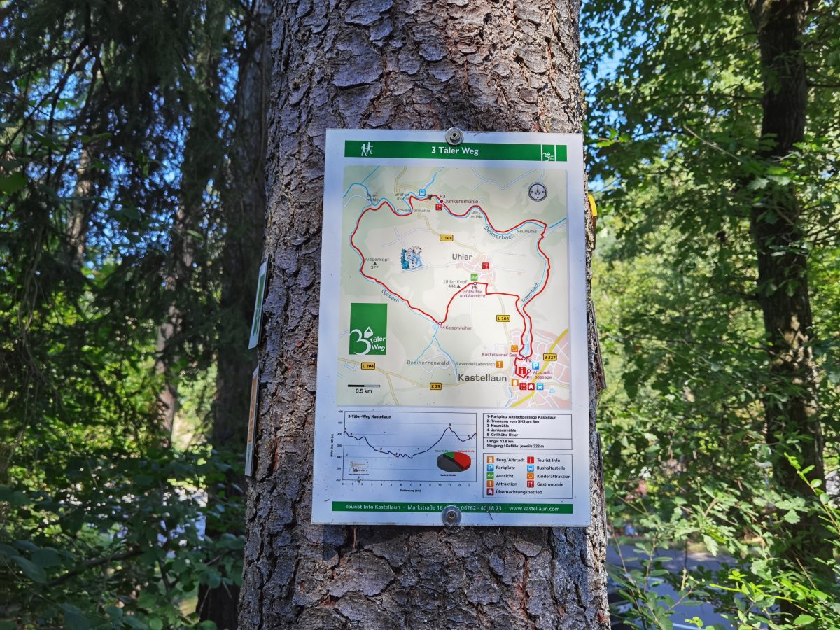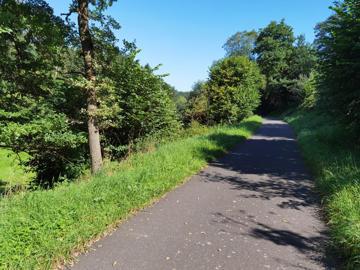 Die 3-Tälertour starten wir vom Campingplatz aus. Da die Tour insgesamt 16 km lang ist, wird sie zu einer kombinierte Lauf- und Radschieberunde. Gerade die erste Hälfte der Tour verläuft entlang geteerter Fahrradwege und somit kann Kunigunde diese Strecken mit dem Faltrad (Tern Link D7i) fahren und Kunibert joggt dazu. Bergauf geht es langsamer und schiebend voran.