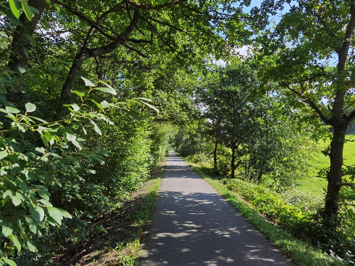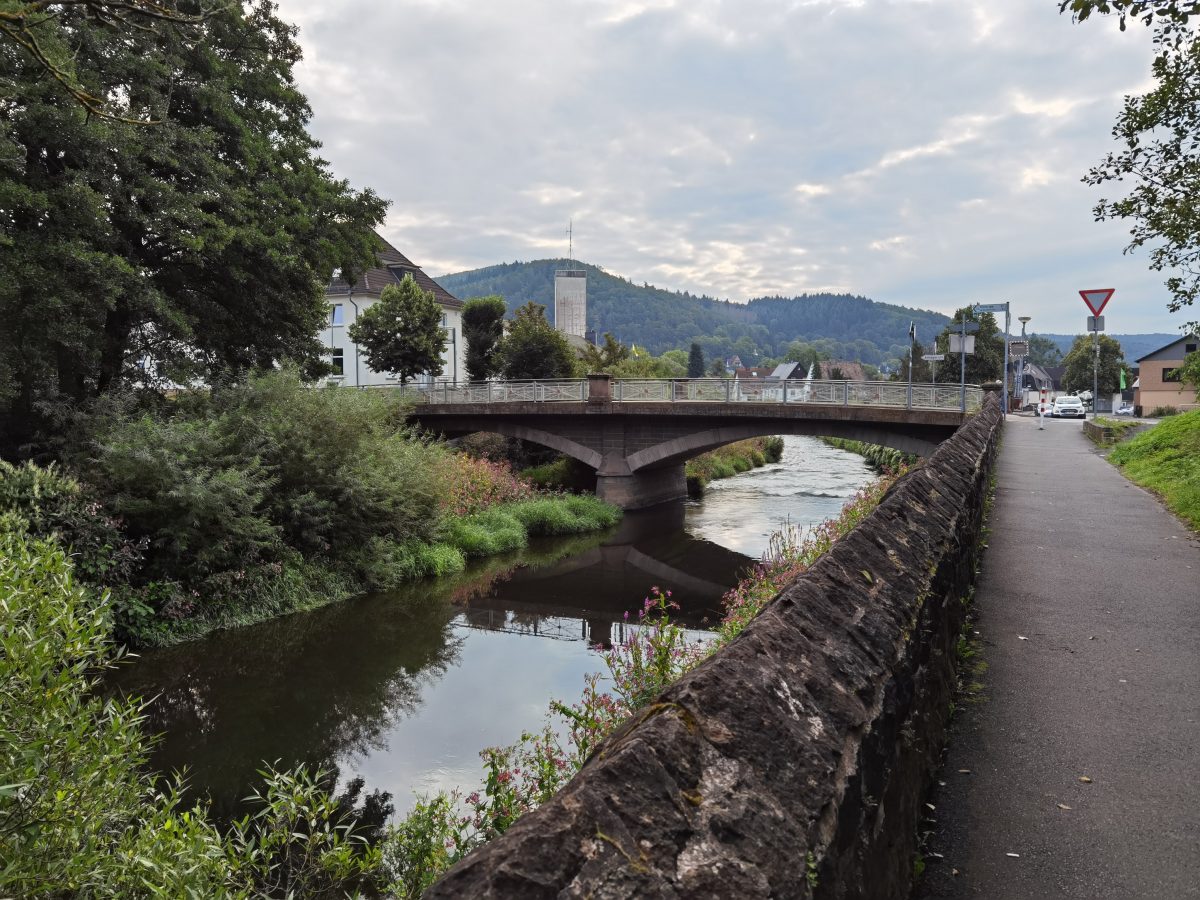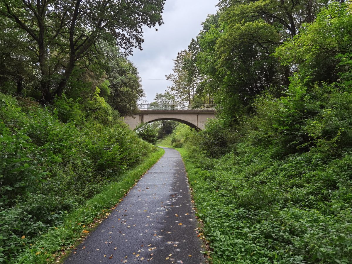 Die 3-Tälertour starten wir vom Campingplatz aus. Da die Tour insgesamt 16 km lang ist, wird sie zu einer kombinierte Lauf- und Radschieberunde. Gerade die erste Hälfte der Tour verläuft entlang geteerter Fahrradwege und somit kann Kunigunde diese Strecken mit dem Faltrad (Tern Link D7i) fahren und Kunibert joggt dazu. Bergauf geht es langsamer und schiebend voran.