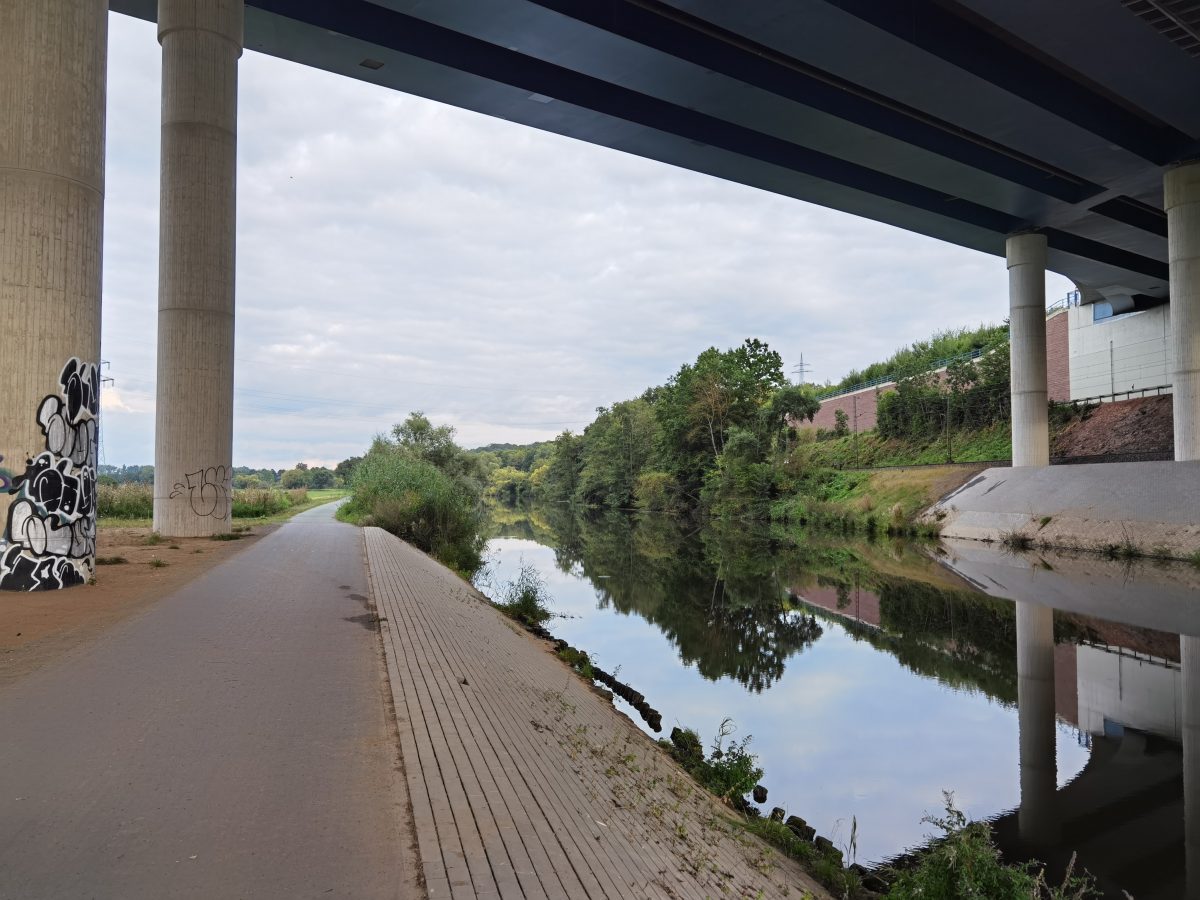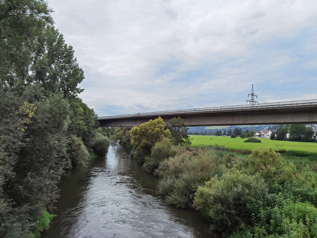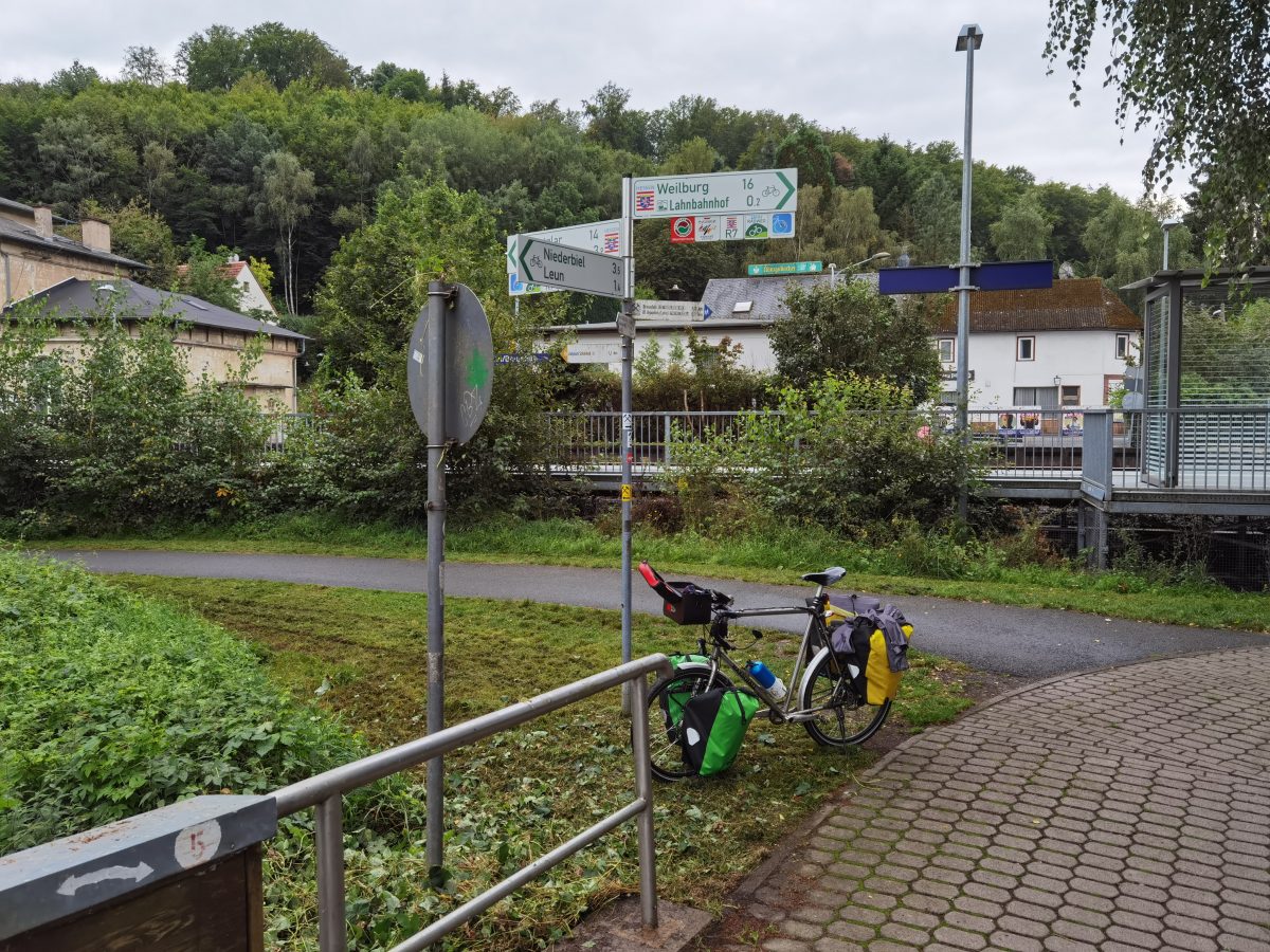 Die Lahn begrüßt nach wenigen Kilometern mit einer Umleitung, einen Weg steil hoch auf eine Halbinsel. Da kommen auch schon die ersten E-Bike bewaffneten Lahnradwegtouristen den Hang hinab und hinterlassen eine Ahnung von mitleidigen Bemerkungen. Ich schiebe an der Luftgrenze und komme irgendwie oben an. Doch diese kleinen Herausforderungen sind erst mal nicht das Problem. Jetzt kommen 80 Kilometer Flachgelände und das soll dem untrainierten Halteapparat bestehend aus Hand, Arm, Nacken, Schultern und Rücken erheblich zusetzen.
