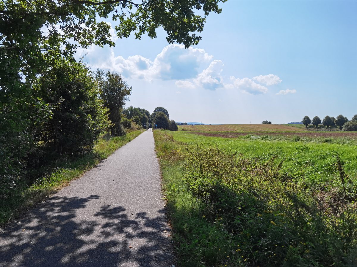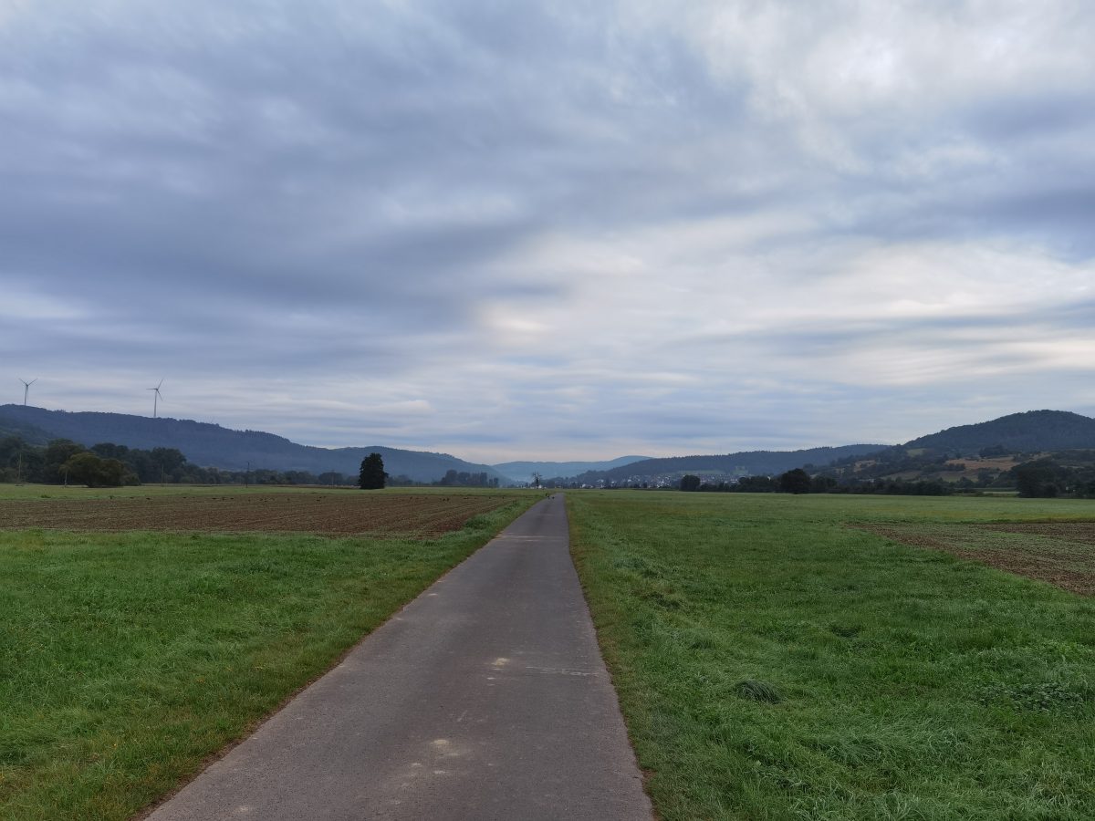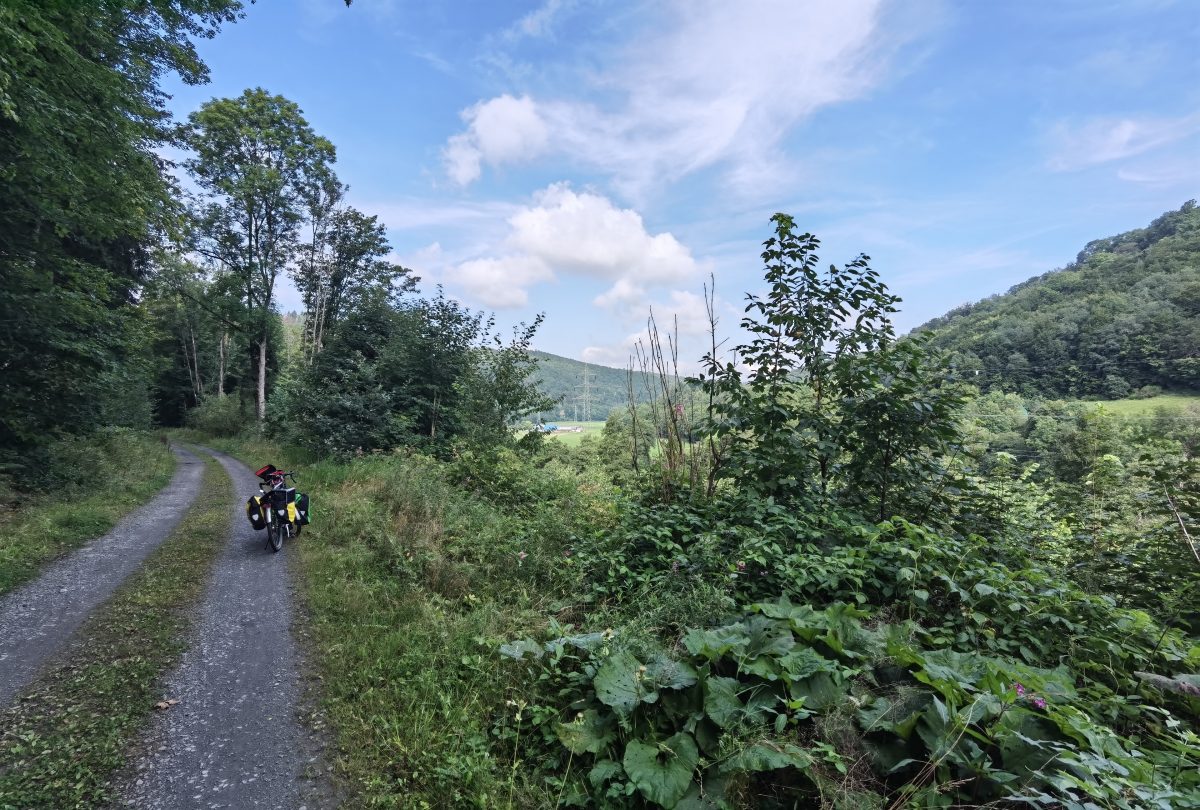 Der Anstieg zum Knoten ist mit den 19 Zähnen und 26″ Reifen an der Rohloff Nabe zu bewältigen. Reisegenuss auf dem Ulmtalradweg mit der dunklen Ahnung, es wird nicht so bleiben.