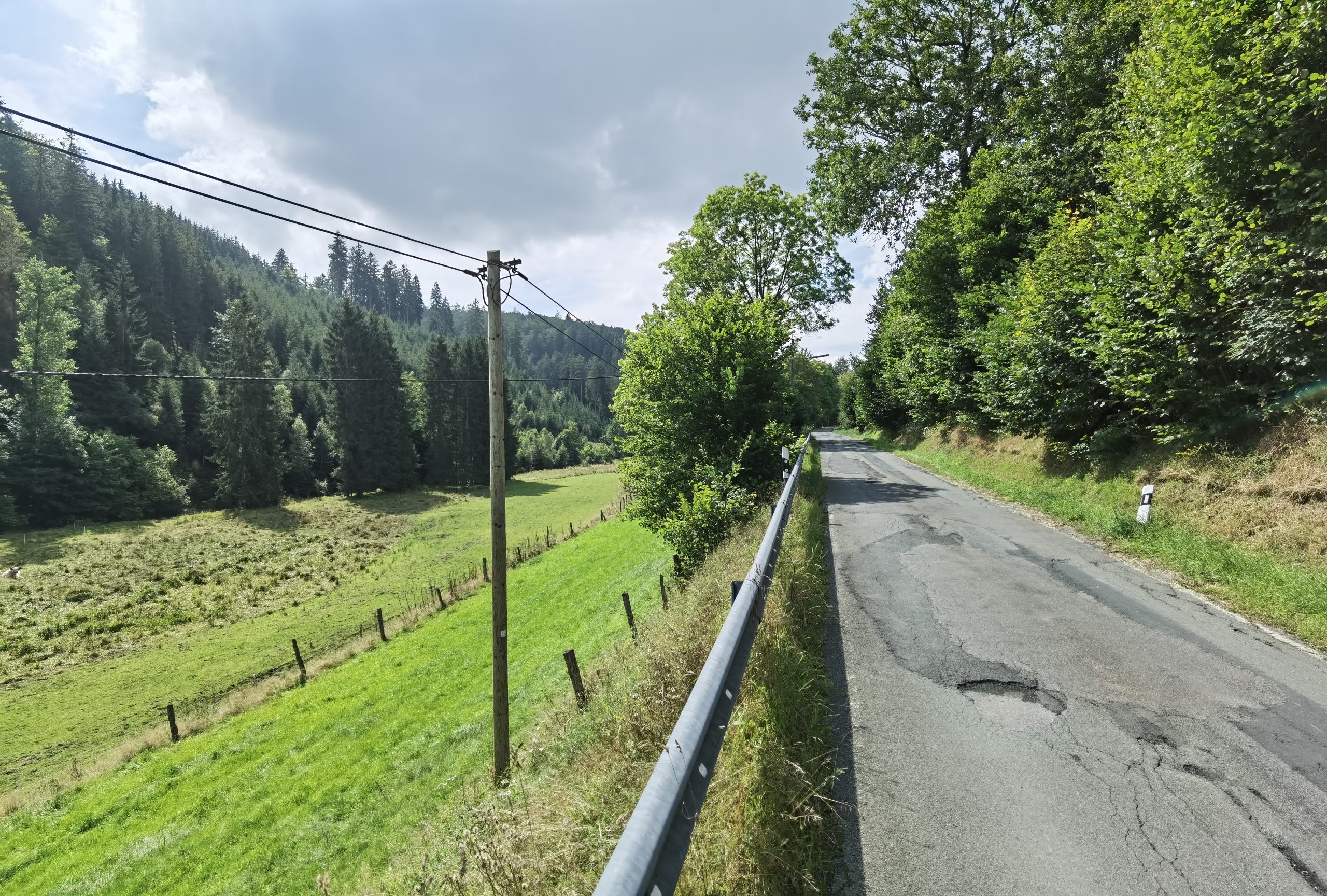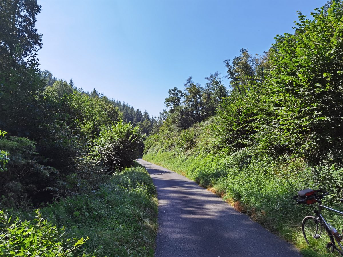 So ein bisschen ist das Gefühl wieder da. Unterwegs. Erst mal alles anziehen, was warm macht. Die SPD Sandalen mit dem Gore Socken bekommen Regenüberzüge, die Jacke bekommt eine Jacke angezogen und Handschuhe finde ich auch in einem der Kleidungspackbeutel. Der Tagesproviant mit 4,5 Liter Wasser und 4 blegten Brötchen ist vertilgt, am letzten Ort vor der Passhöhe wird nachgefüllt. Dann geht es wirklich ein wenig wie in den Bergen, das Tal wird enger, die Hügel nebenan höher. Und es wird auch steiler. Der Radweg führt auch gern einen Seitenhang hoch und dann wieder zurück ins Tal. Die Stimmung ist gut, das kann geschafft werden.