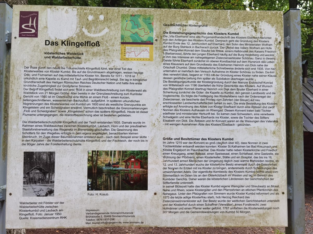Diese Traumschleife war bis jetzt eine der schönsten Wanderrouten. Auf einem Hinweisschild entlang der Tour hieß es: “Mitten in der reizvollen Hunsrücklandschaft wartet mit dem “Masdascher Burgherrenweg” eine traumhafte Rundtour zu verwunschenen Tälern, murmelden Bächen, tiefen Stollen und uralten Gemäuern aus Kelten-, Römer und Ritterzeiten darauf entdeckt zu werden.” Dem ist eigentlich nichts mehr hinzuzufügen. Auf der gesamten Wegstrecke gibt es viele Rastplätze und immer wieder Hinweistafeln zur Geschichte. Dieses Mal gibt es von der Tour keine Bilder sondern ein Video, das die Höhepunkte umfasst.