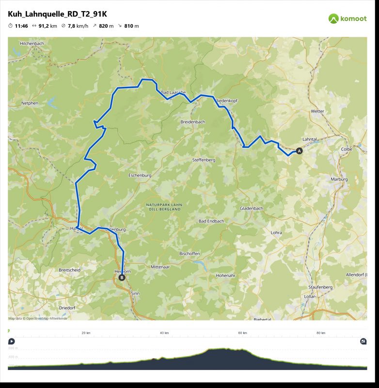 Rhein? Nein, zu weit bis zur Quelle. Saynbach? Nein, nicht weit genug bis zur Quelle. Lahn? Die wollte ich ja eigentlich in Etappen erwandern, aber der Mittellauf ist ist eher zersiedeltes Gebiet, da mit dem Rad auf Testfahrt durch ist wohl die bessere Idee. Also die Tour von Kunidorf zur Lahn über den Ulmtalradweg gesucht und den Lahntrack ab Biskirchen dran gehangen. Gut 200 Kilometer sollten als Testgrundlage ausreichen. Dann noch den Rückweg ins Dilltal drangehangen, denn an der Lahnquelle wartet schliesslich kein Schüttelbus, der einen müden Radler samt Gepäck nach Kunidorf zurück fährt. Im Dilltal in Herborn, bevor es wieder hoch in den Westerwald geht, ist das schon wahrscheinlicher.
