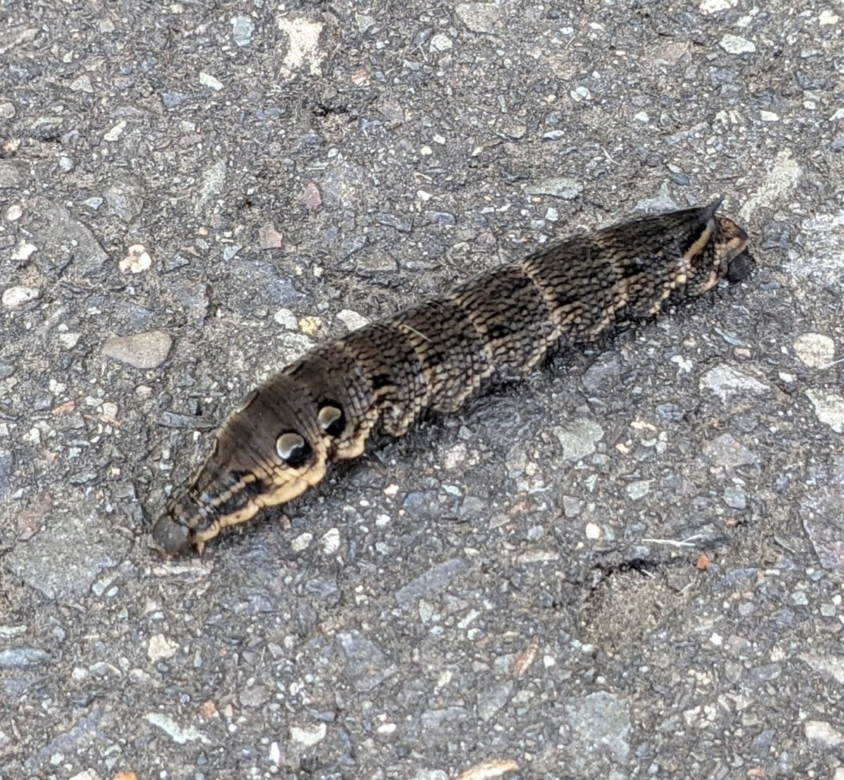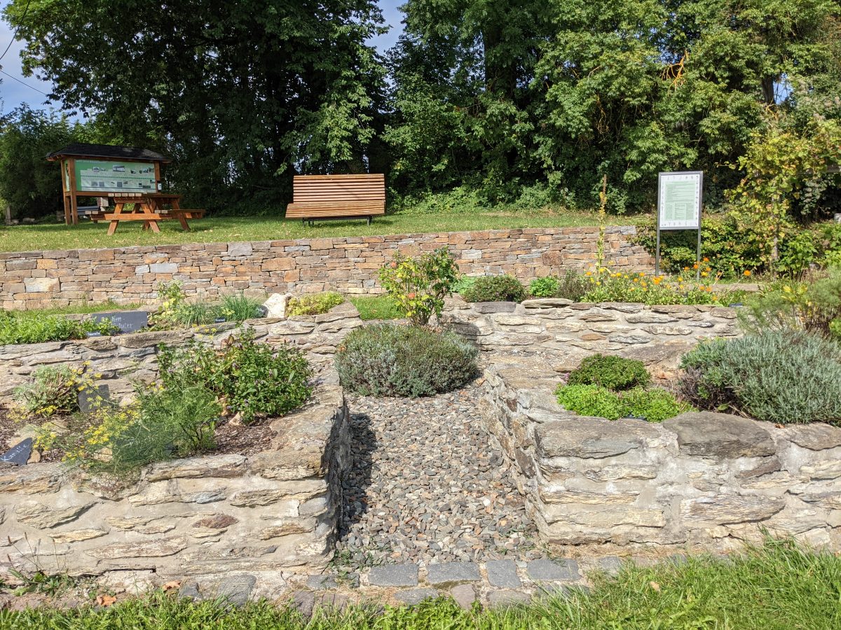 Nach so vielen Wanderungen und Radtouren soll es bei weiterhin spätsommerlichen Wetter eine kleine Joggingrunde geben. Dazu eignet sich aber nicht unbedingt eine Traumschleife, da diese zumeist nur auf wurzeligen Pfaden verlaufen mit steilen Bergab- und Berauf-Passagen. Somit hat Kunibert eine eigene Route auf breiten Forstwegen zusammengestellt, wobei aber zu Beginn der Runde zuerst der Bereich des ehemaligen Klosterkumbds besichtigt werden sollte. Von dem Kloster selbst sind keine Mauern mehr erhalten, es wurde aber eine Infotafel aufgestellt und ein kleiner Kräutergarten angelegt. Auf unserer Joggingrunde haben wir dann auf einem Weg auch eine sehr große Raupe entdeckt. Es scheint die Raupe des Mittleren Weinschwärmers zu sein. Eine wirklich große und beeindruckende Raupe.