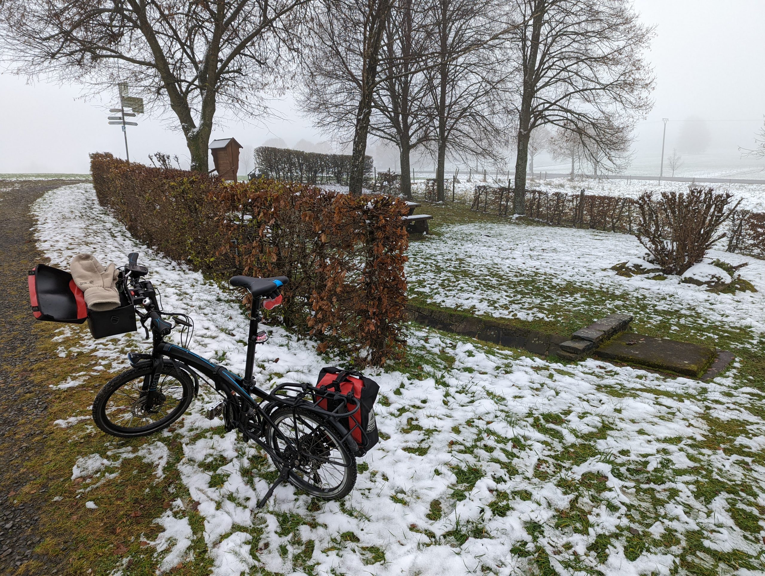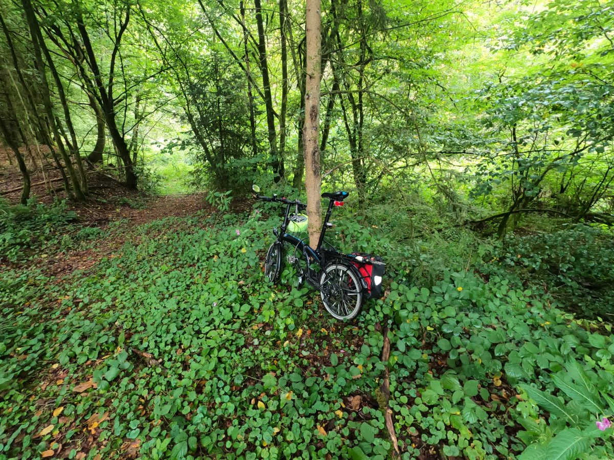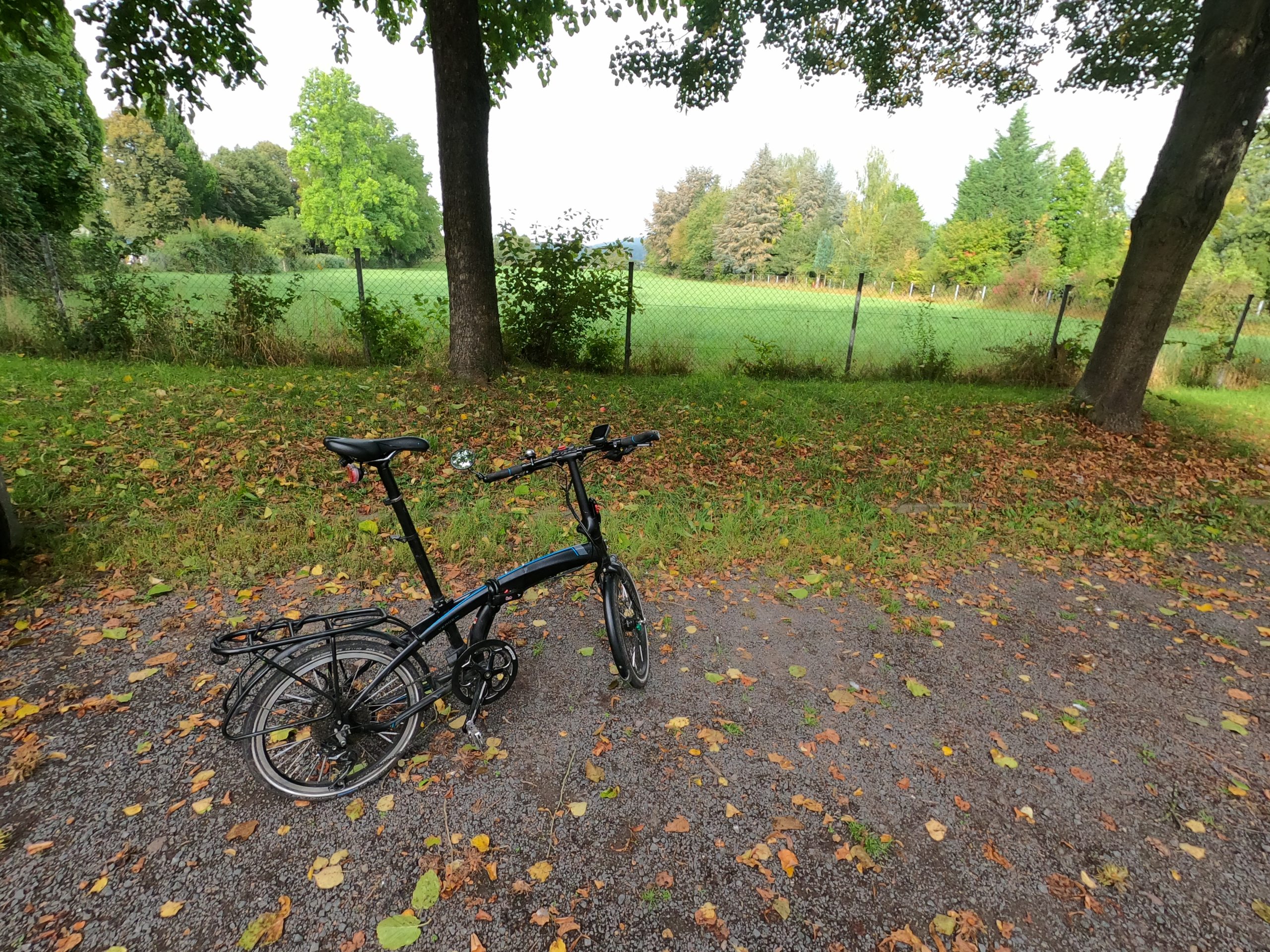Mein Rad ist ein Tern Faltrad, damit für die Anfahrt auch der Smart mit E-Antrieb oder für die weiter entfernten Strecken unser e-208 genutzt werden konnte. Das passt in beide Fahrzeuge ohne Fahrradträger in das Heckabteil.