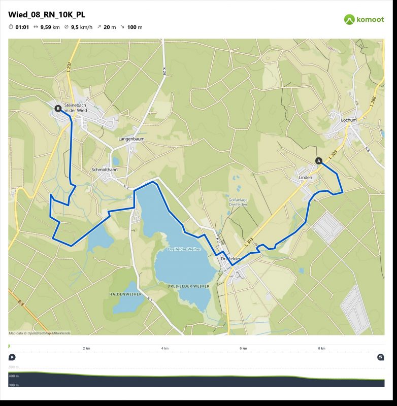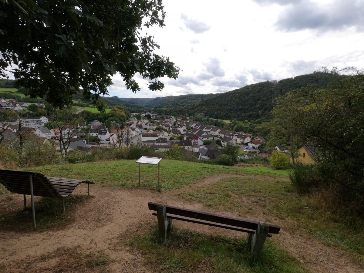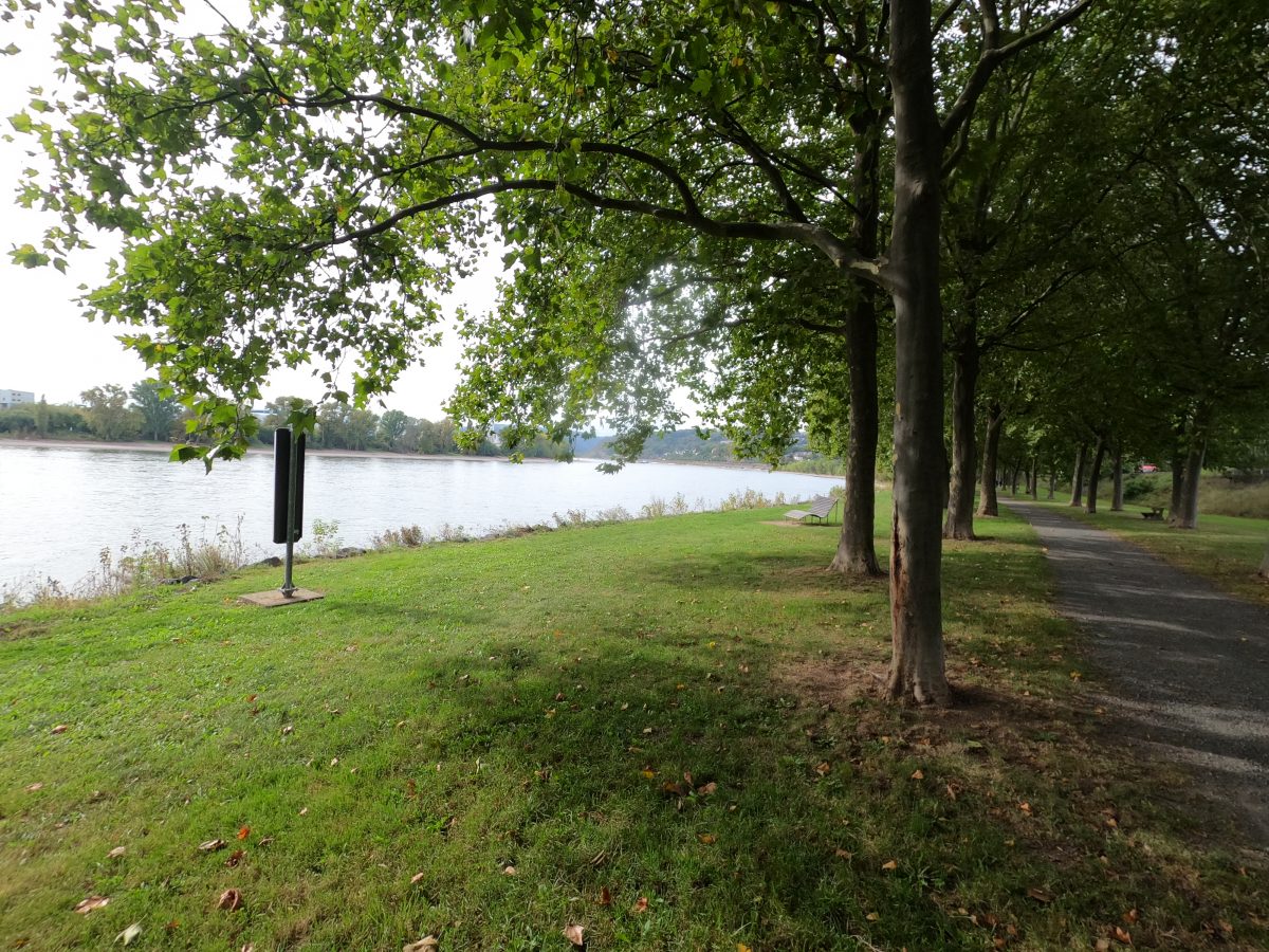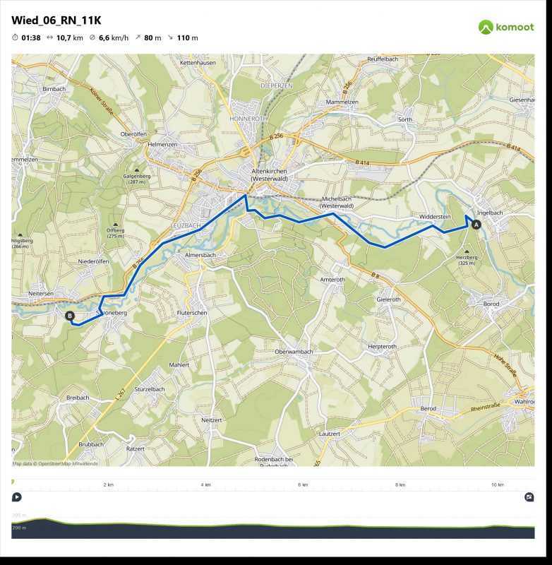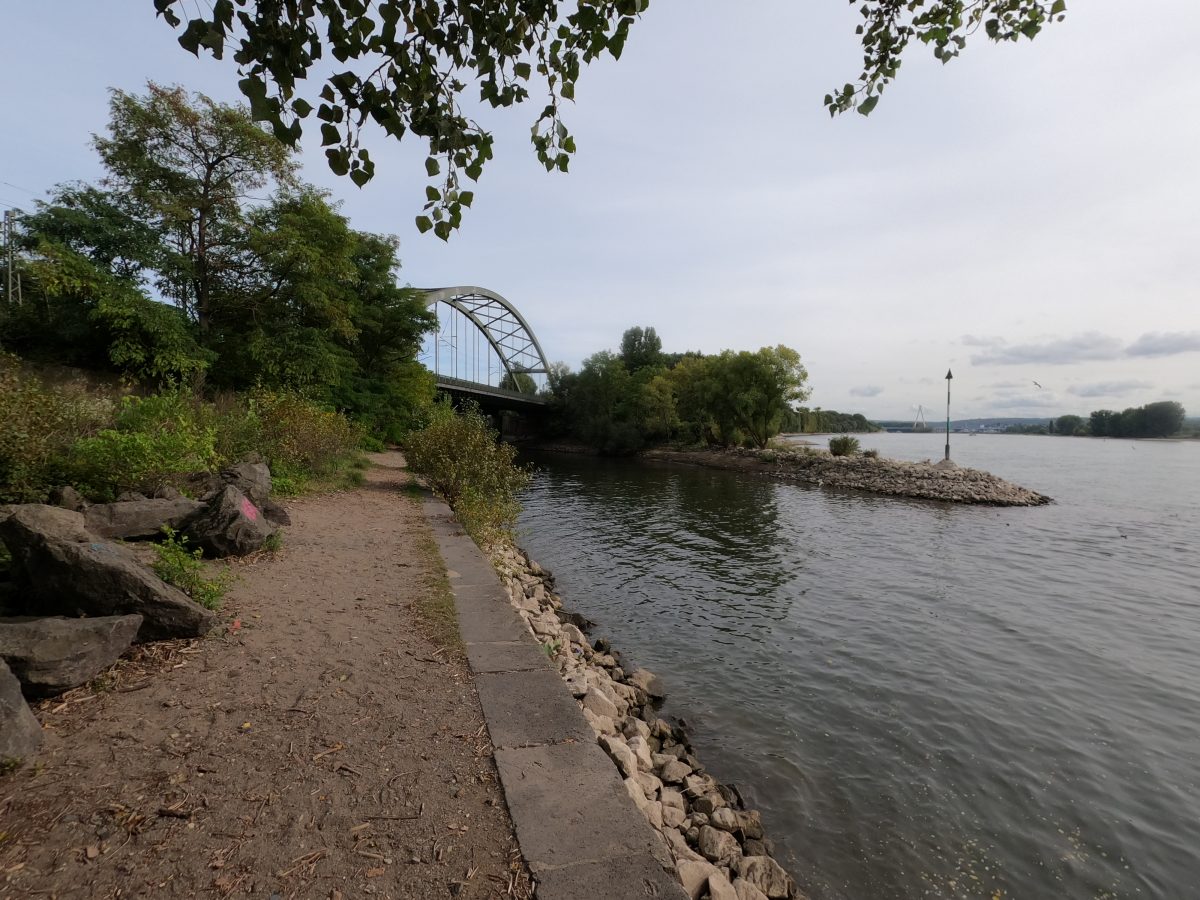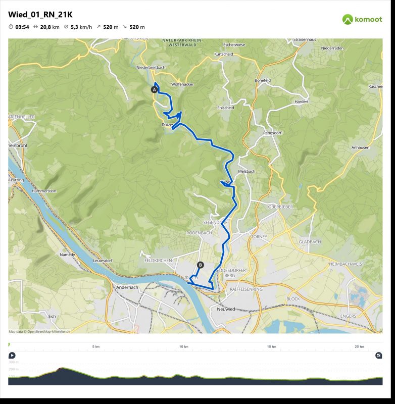 Wie schon bei der Planung zu sehen, nutzt der Wiedweg im engen Wiedtal auf den 20 Kilometern vor der Mündung in den Rhein Pfade an den Talhängen, die auf Abschnitten als Trail zu bezeichnen sind. Immer wieder werden Aussichtspunkte erreicht oder der Weg führt kurz auf die landwirtschaftlich genutzten Hochflächen oberhalb des Tals. Die Strecke bis Altenahr könnte mal als Trailläufer wirklich genießen, wenn denn da nicht an jedem Anstieg die Schnappatmung einsetzen würde. So hatte ich mir das nicht vorgestellt. Laufen war nur in Ansätzen bergab möglich. Im flachen Teil ab Altenahr wurde es dann ein Spaziergang entlang der Wied mit einem Abstecher auf die zum Rhein abfallende Hochebene mit Blick auf Neuwied und das Rheintal. Die Wiedmündung ist jetzt nicht gerade das ökologisch wertvolle Flussdelta, aber ich war da. Dann noch zurück zum Auto, umgezogen und dann das Rad abgeholt. Ging eigentlich problemlos.