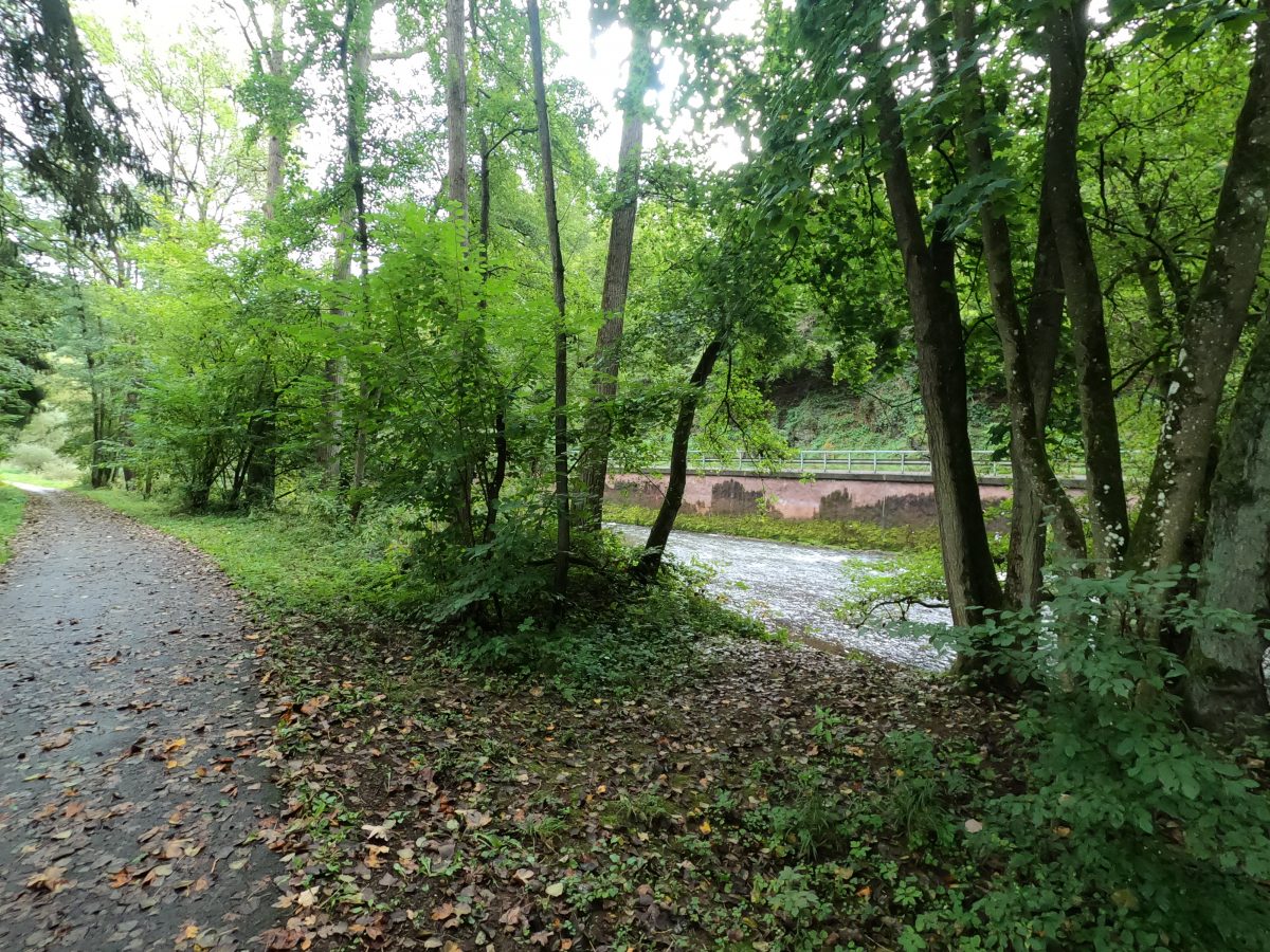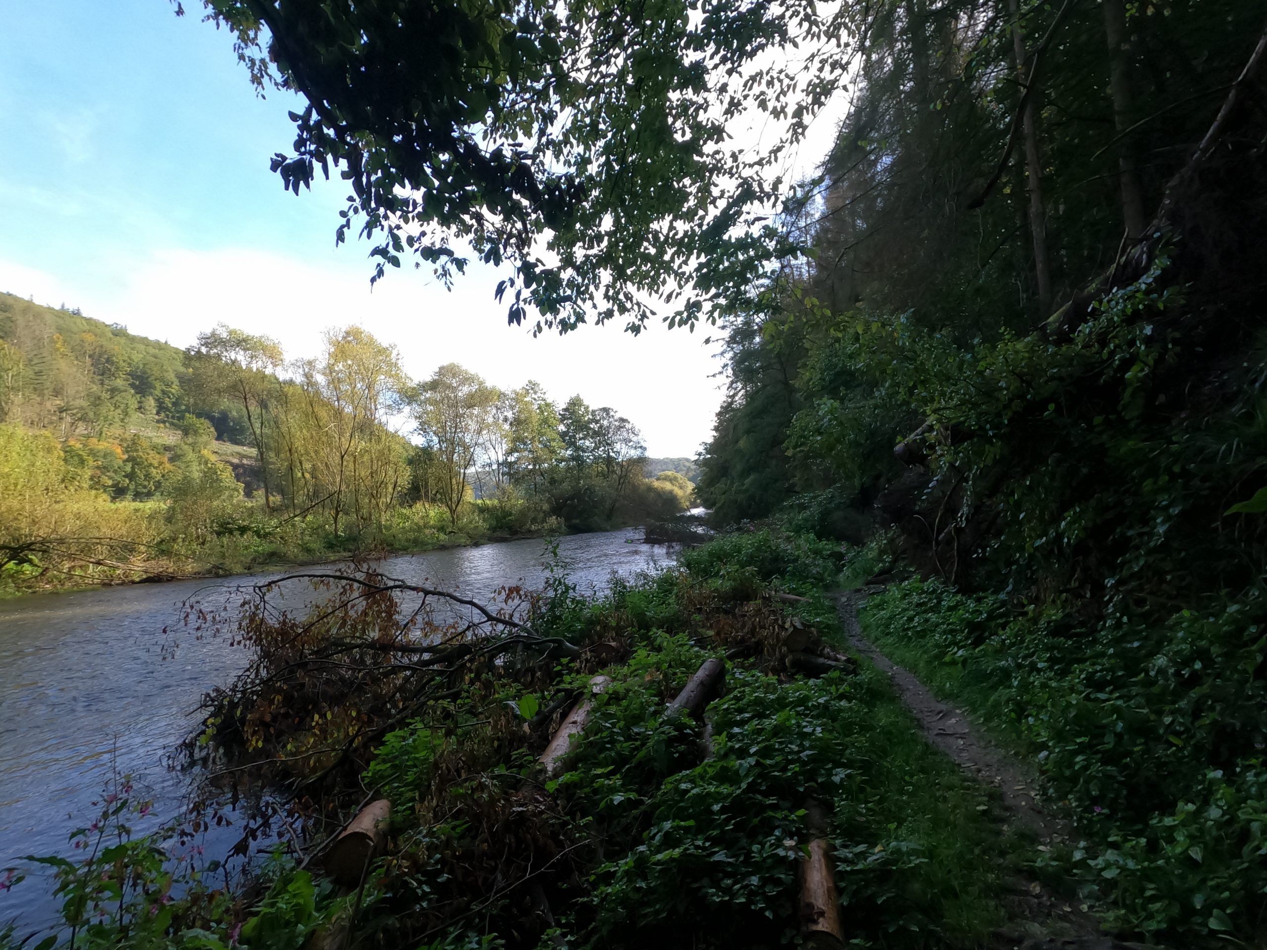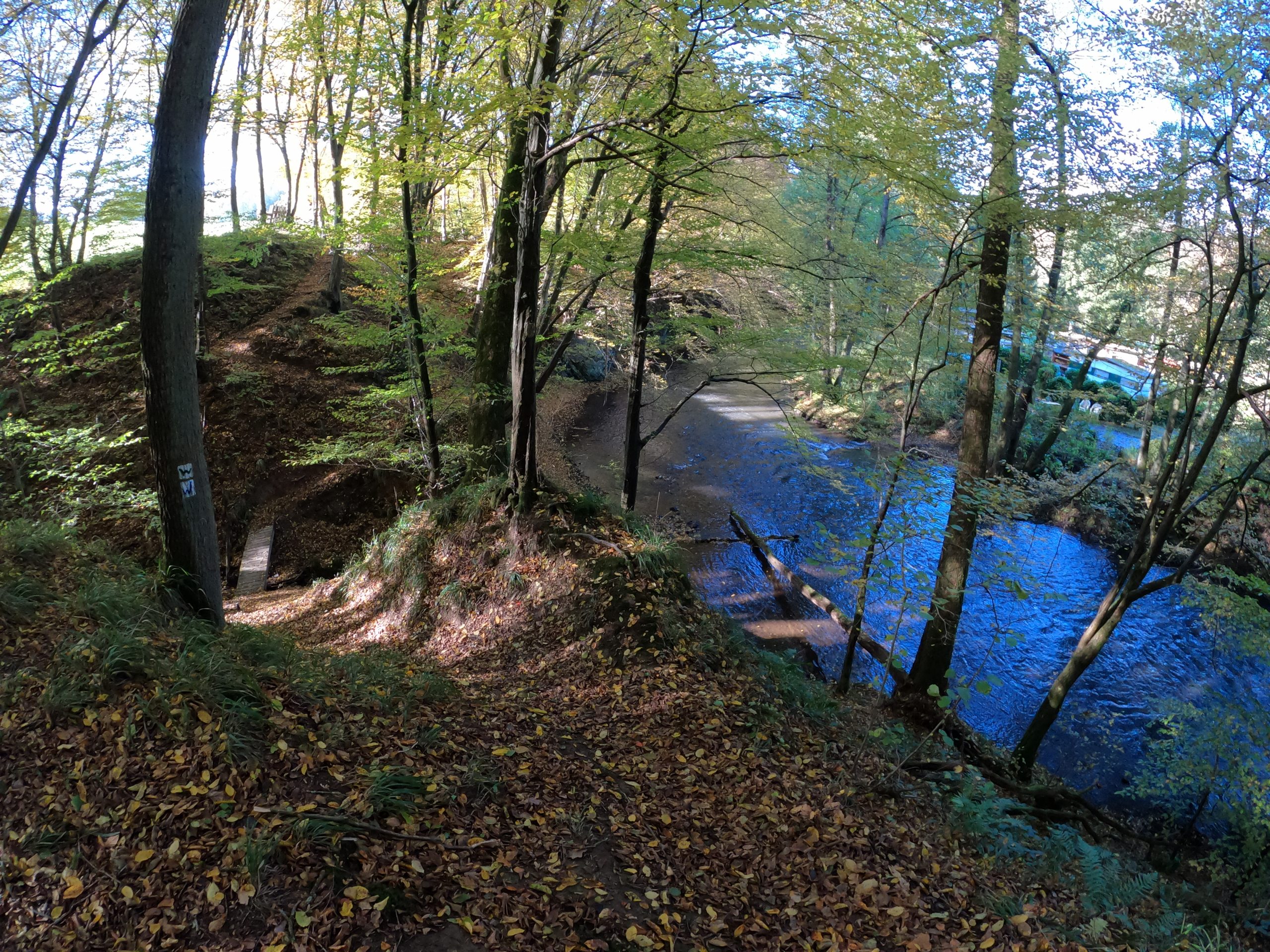 Wieder eine schöne Trailstrecke mit Baumverhau. Wenn man erst mal geschnallt hat, dass der Einstieg in den Trail über die Terrasse des Restaurants führt, begleitet man die Wied auf ihrem Weg. Die alten Knochen wollen nicht so recht die Nase auf Kniehöhe absenken. Bergauf wird wieder geschnauft, sonst ist die Streckenführung abwechslungsreich und liefert das gewünschte Outdoorerlebnis.