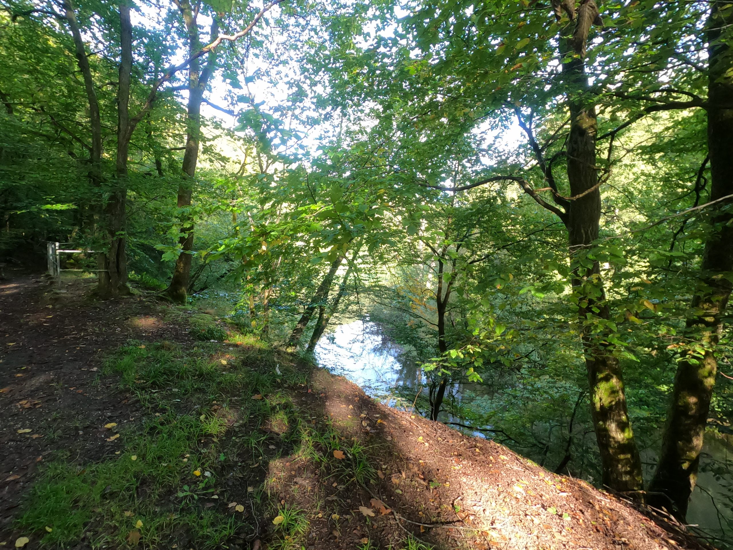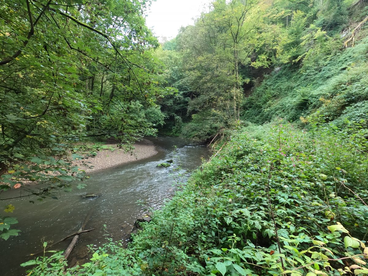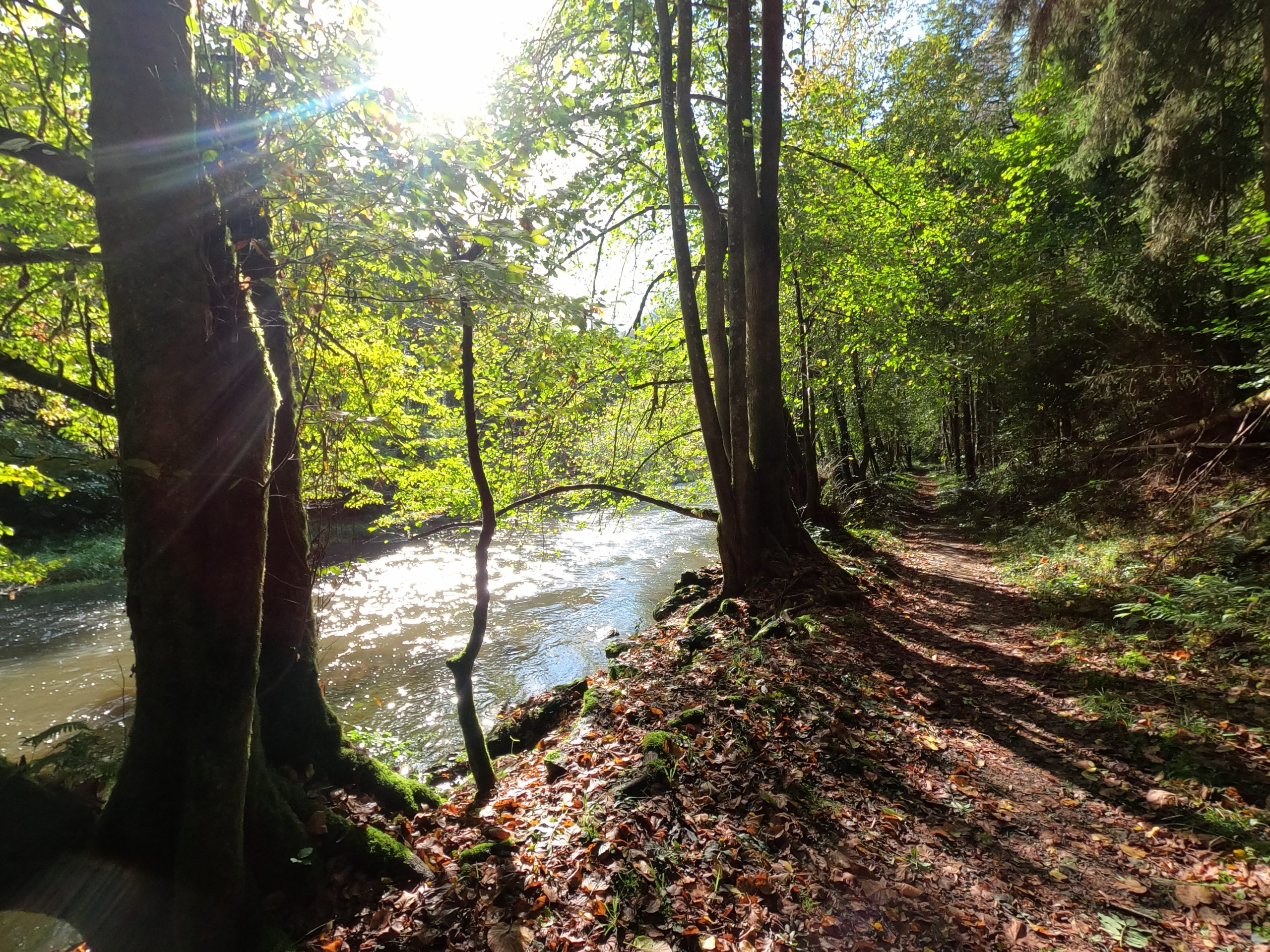 Wieder eine schöne Trailstrecke mit Baumverhau. Wenn man erst mal geschnallt hat, dass der Einstieg in den Trail über die Terrasse des Restaurants führt, begleitet man die Wied auf ihrem Weg. Die alten Knochen wollen nicht so recht die Nase auf Kniehöhe absenken. Bergauf wird wieder geschnauft, sonst ist die Streckenführung abwechslungsreich und liefert das gewünschte Outdoorerlebnis.