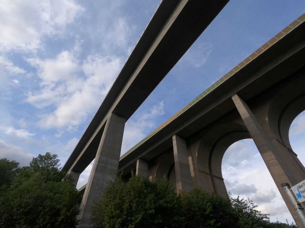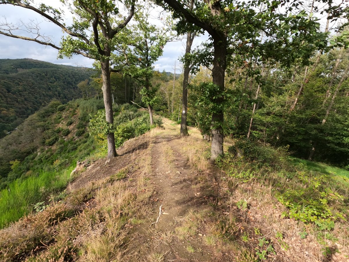 Der Wiedweg bleibt erst auf den Höhen der östlichen Hügel des Wiedtales und bietet Aus- und Einblicke. Ein paar Kilometer vor der ICE/A3 Grenze geht es erst mit dem Wied Radweg, dann über einen von Zuwachsung bedrohten Pfad zur Talbrücke.