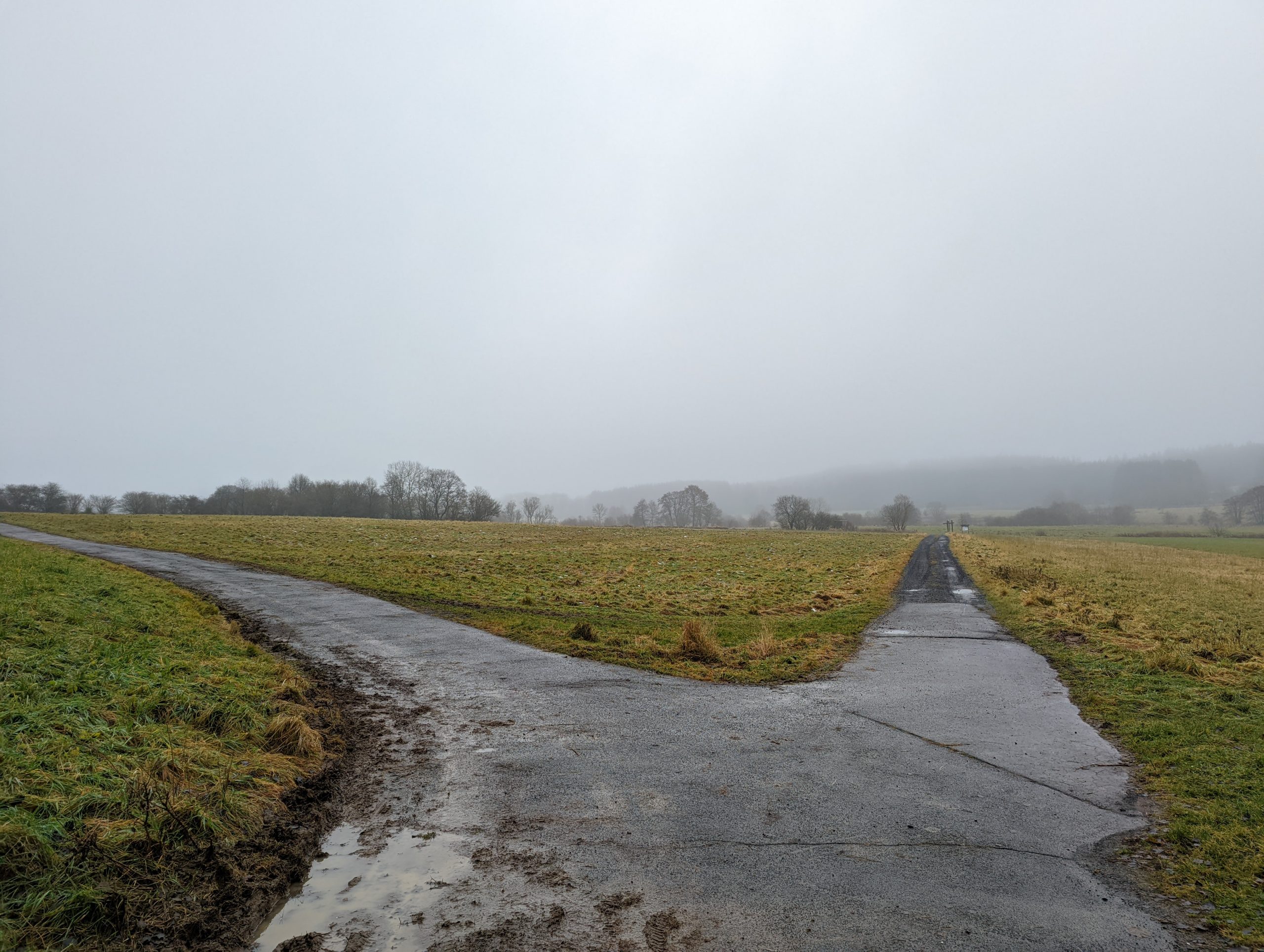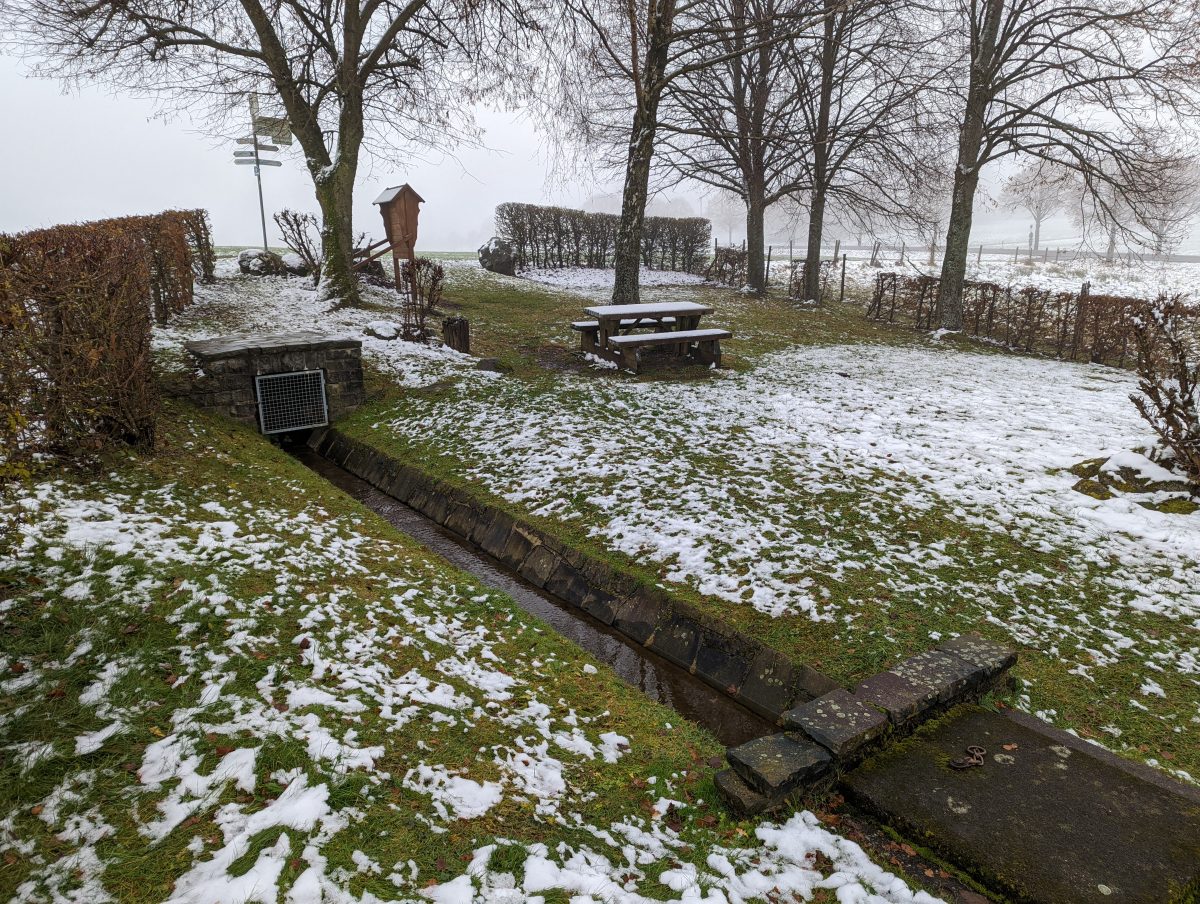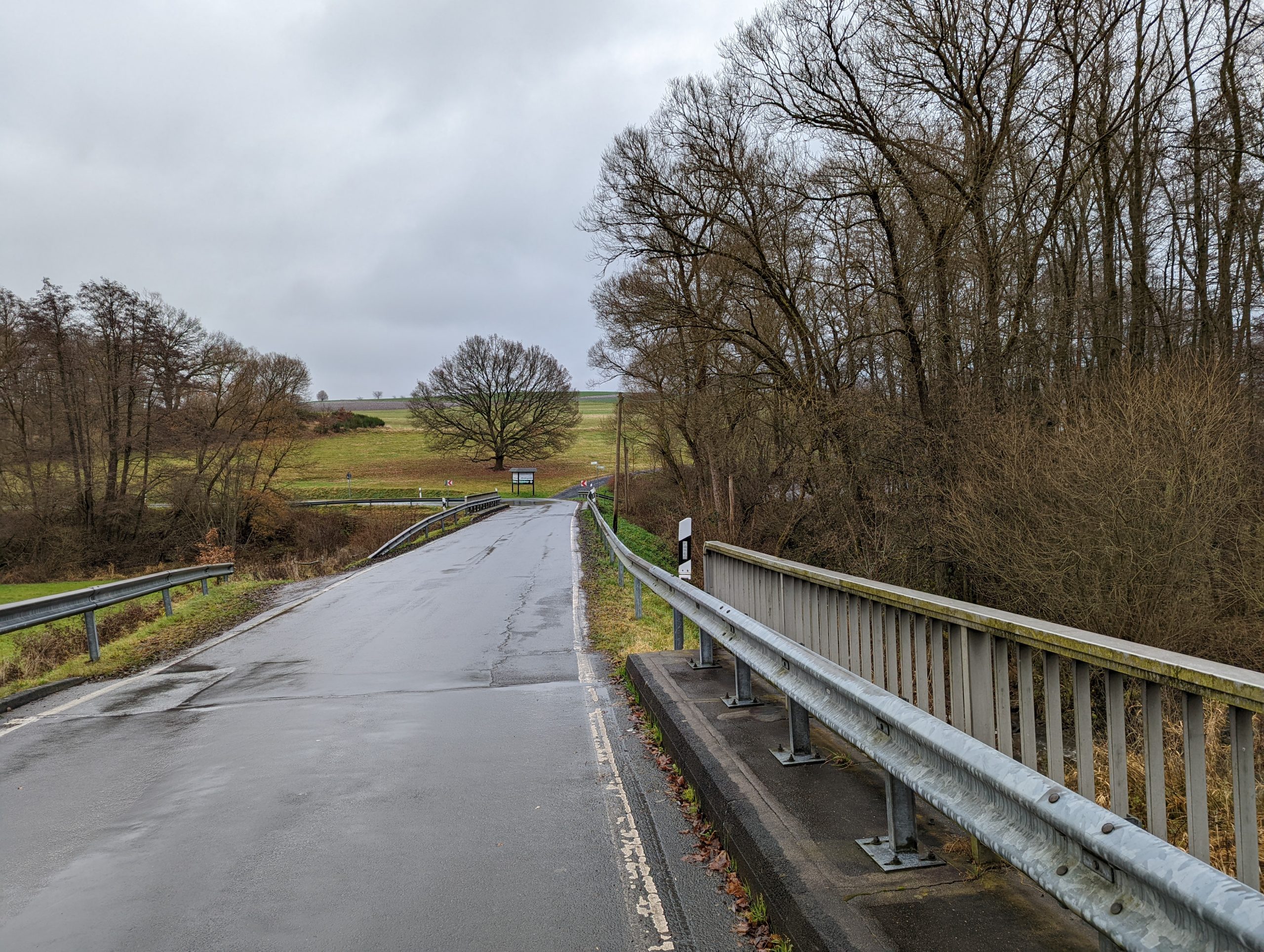 Der Radweg ist unspektakulär, auch bei besserer Sicht geht der Blick nicht viel weiter als über die Wiesen rechts und links des Wirtschaftswegs und der Kreisstraße. Zwei Westerwälder Dörfer im Samstagsschlaf, dann ist die Quelle mit Bank und Bett erreicht.