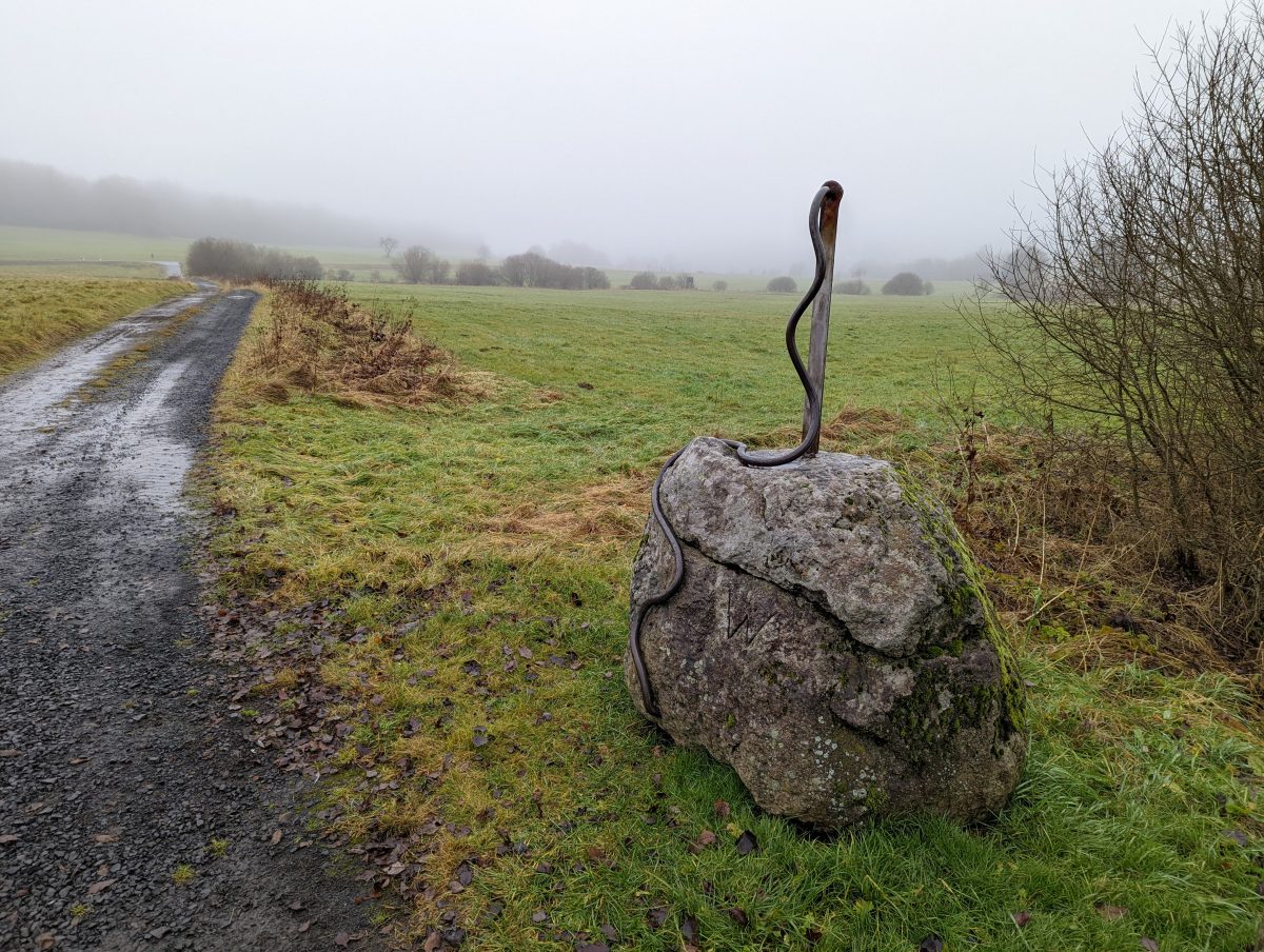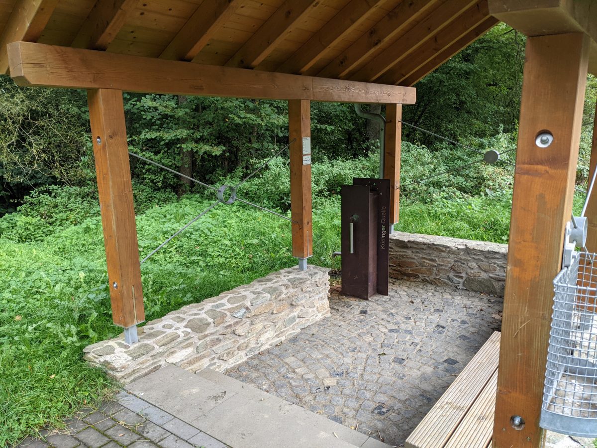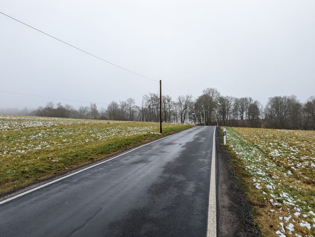 Der Radweg ist unspektakulär, auch bei besserer Sicht geht der Blick nicht viel weiter als über die Wiesen rechts und links des Wirtschaftswegs und der Kreisstraße. Zwei Westerwälder Dörfer im Samstagsschlaf, dann ist die Quelle mit Bank und Bett erreicht.