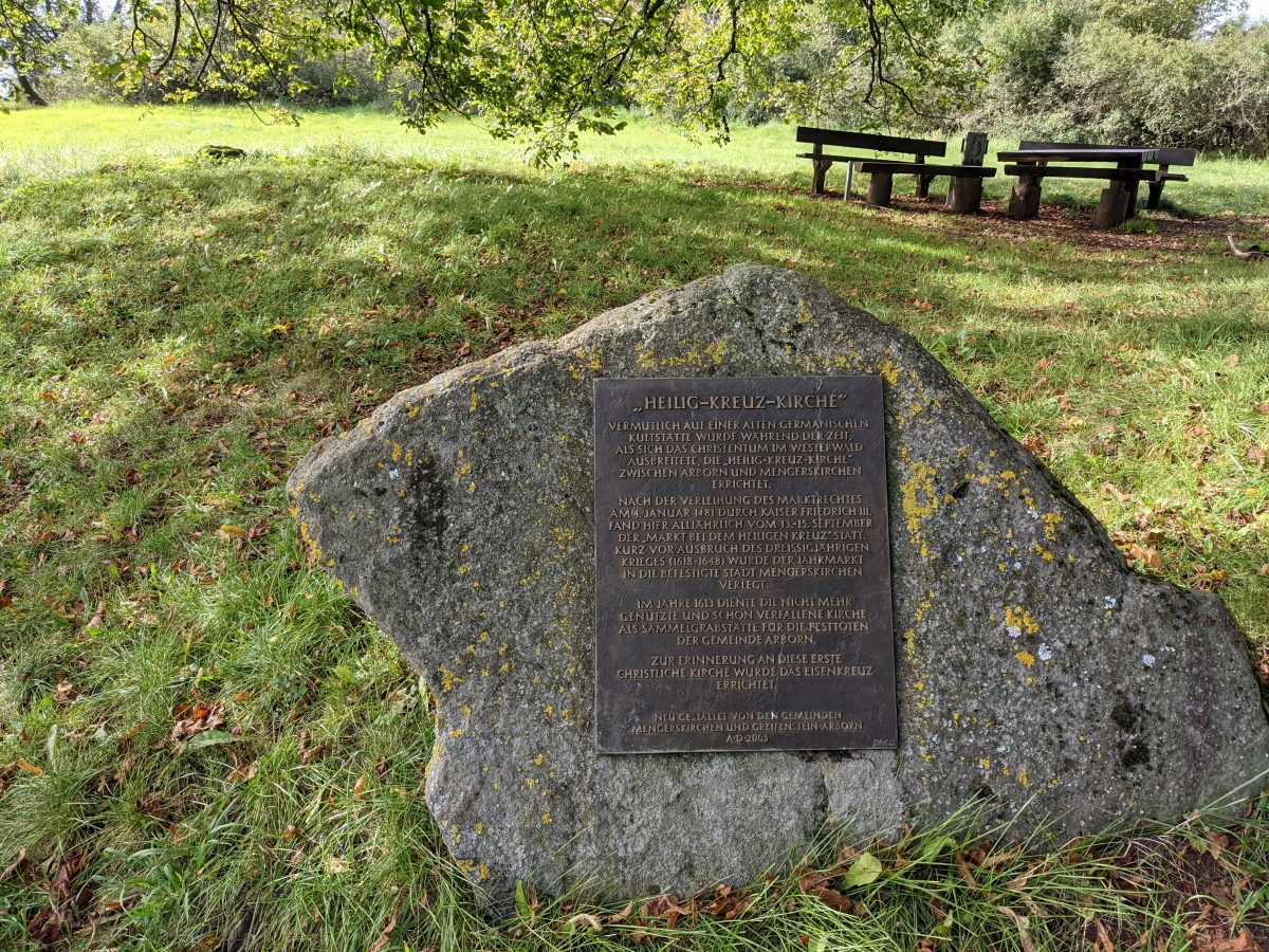 An dieser Stelle befand sich die “Heilig-Kreuz-Kirche”, an der das Eisenkreuz erinnern soll. Eine weitere Infotafel dazu findet man in der unten angefügten Bildergalerie.