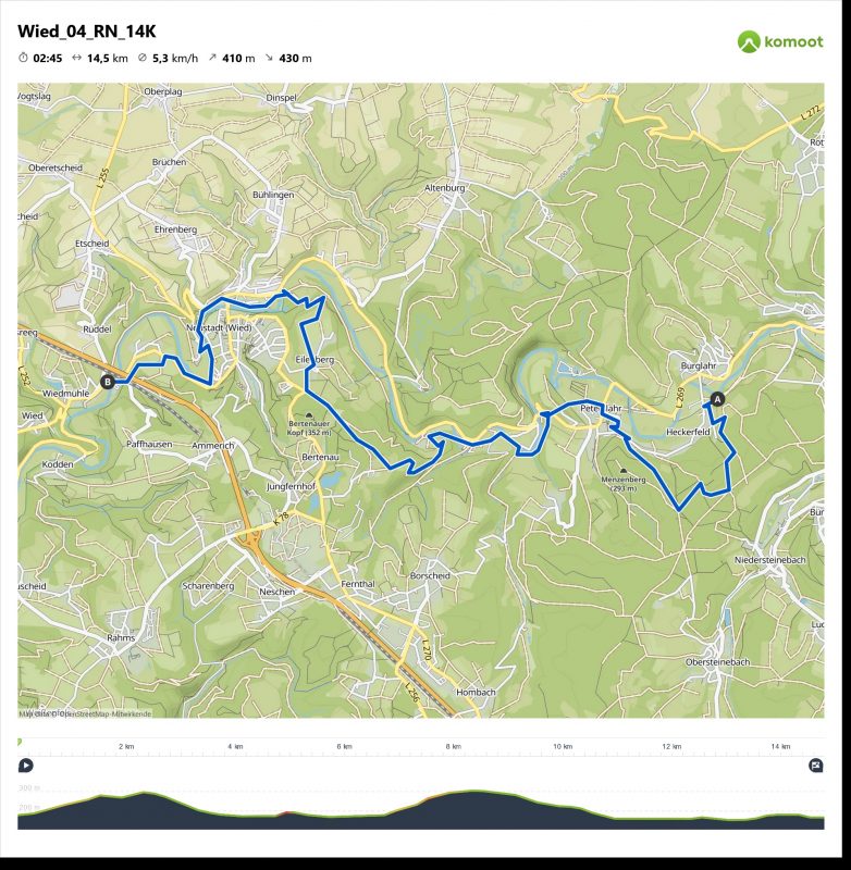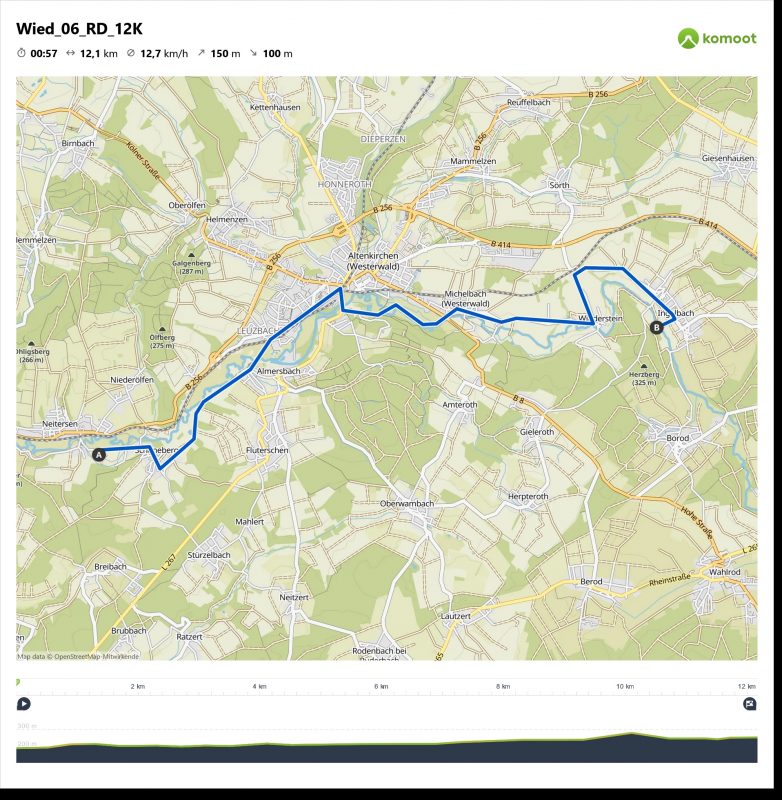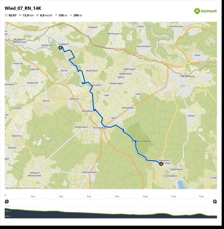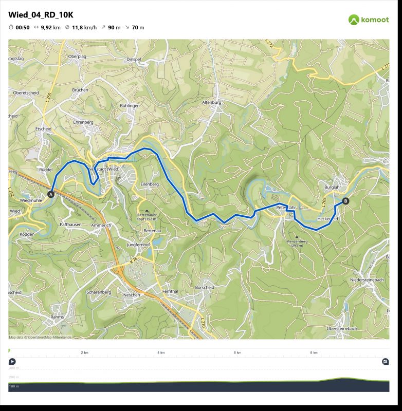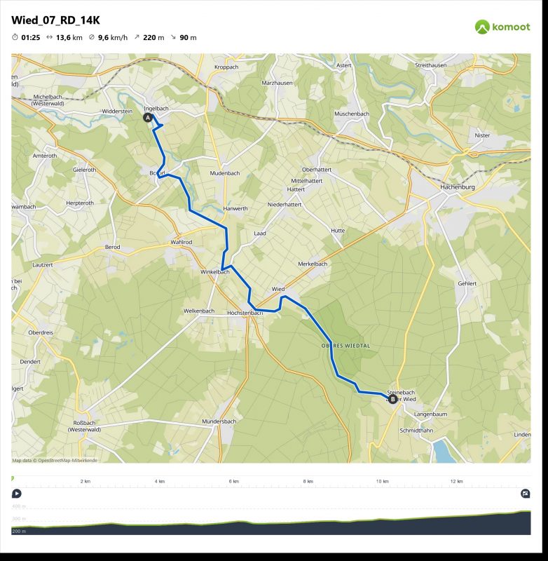 Die Streckenführung zur Planung der Etappen wurde mit den Tracks von GPS Wanderatlas unter https://www.ich-geh-wandern.de/wiedweg und dem Tourenplaner Rheinland-Pfalz unter https://www.tourenplaner-rheinland-pfalz.de/de/tour/radtour/auf-dem-wied-radweg-durch-herrliche-flusstaeler-radeln/7751131/ entnommen.