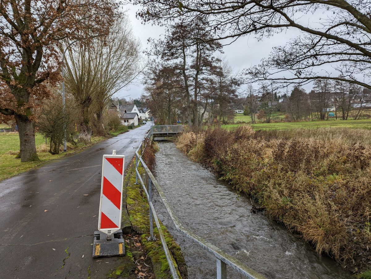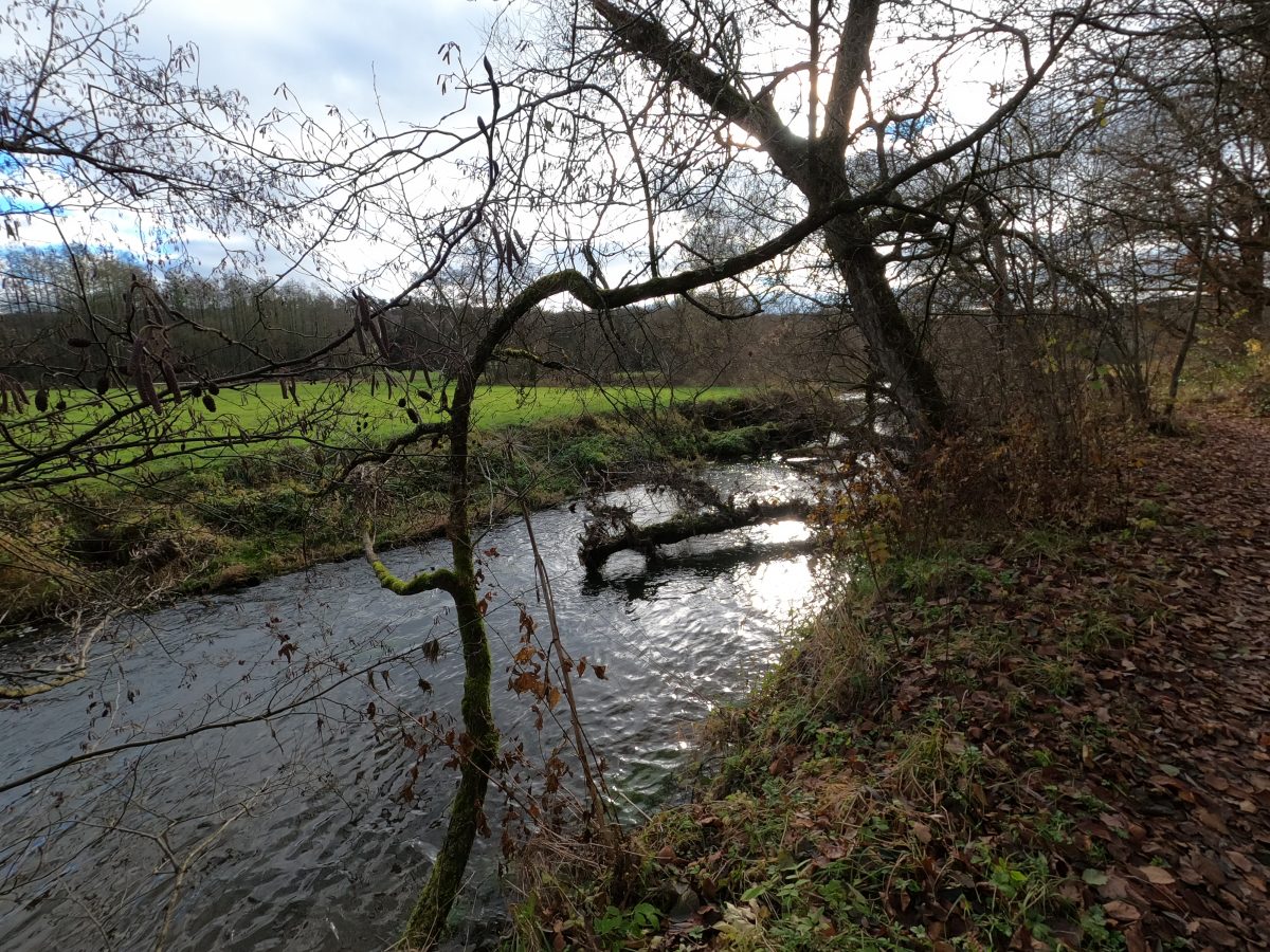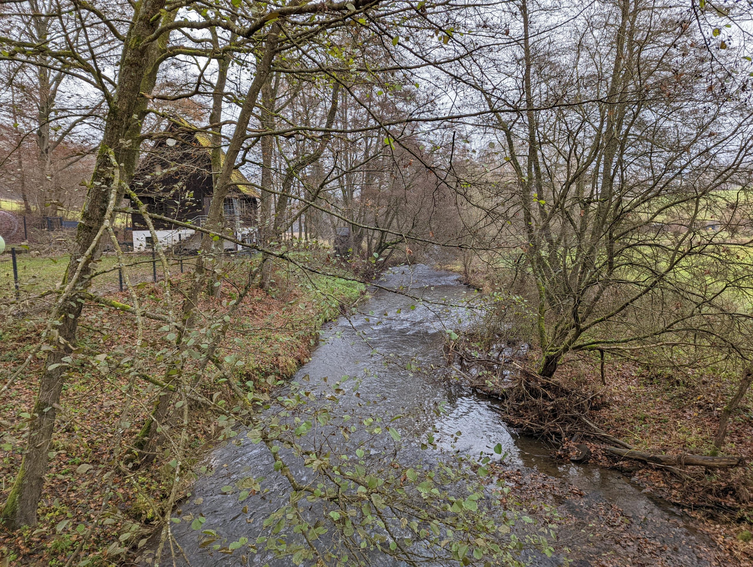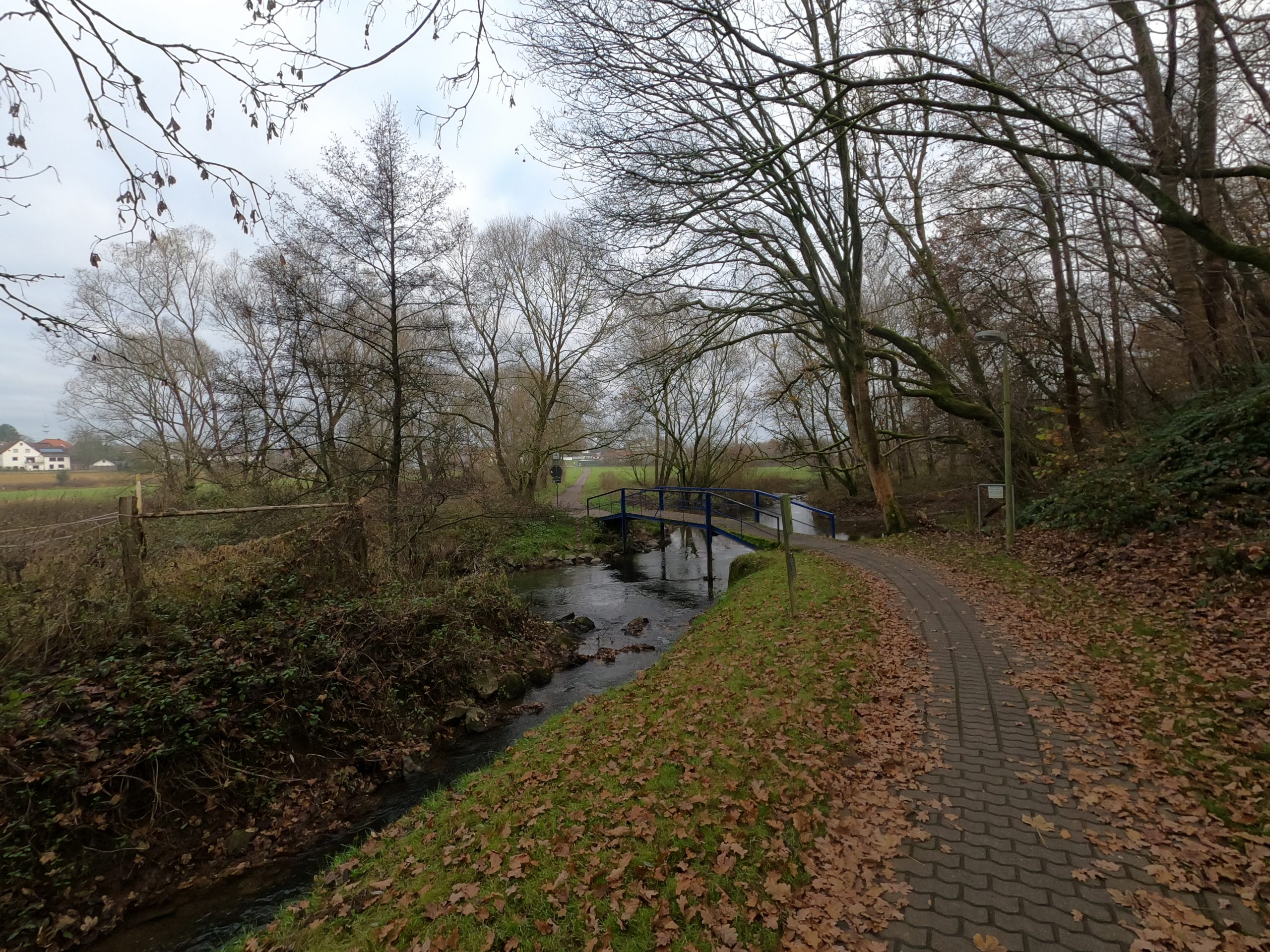 Ein kleines Stück an einem kleinen Bach. Es ist nasskaltes Novemberwetter an diesem Tag, der die Reihe der Wiederlebnistage abschließt. Die Stelle ist von vielen Rad-, Wander- und Lauftouren bekannt und für eine Minute tauchen die Bilder der Touren entlang der Wied wieder auf. Es sind wohl die Steigpassagen im unteren Drittel des Wiedlaufs im engen Tal und auf felsiger Höhe, der Blick bleibt im Tal gefangen. Die Welt ist die Wied.