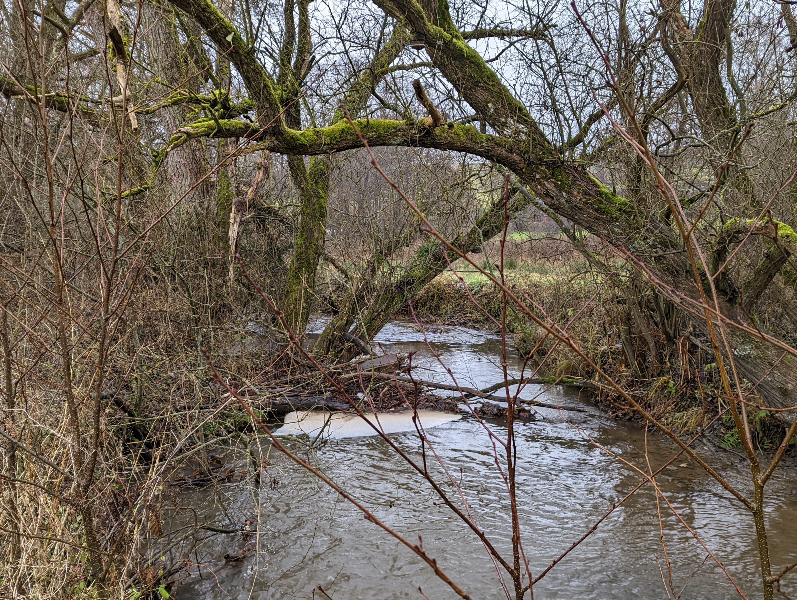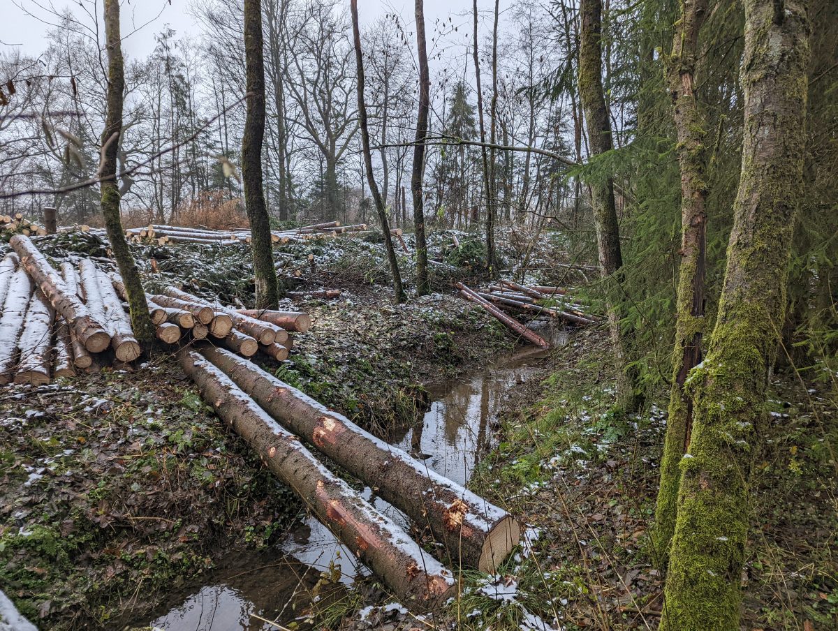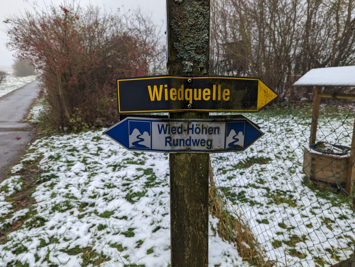 Die Schneekristalle brennen in den Augen und die Kameralinse blickt durch Wassertropfen auf die Landschaft. Von Ingelbach bis Höchstenbach ist das Wiedtal noch breit und der Wied zu folgen ist noch leicht. Über Wirtschaftswege geht es weitgehend autofrei bis Höchstenbach. Der Blick auf den Wind beräderten Hügel macht klar, dass jetzt wieder einem Tal gefolgt wird. Aber nicht als Auf und Ab des engen Wiedtals vor der Mündung, jetzt reicht ein Forstweg ein paar Meter neben dem Bachbett.
