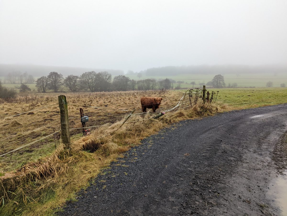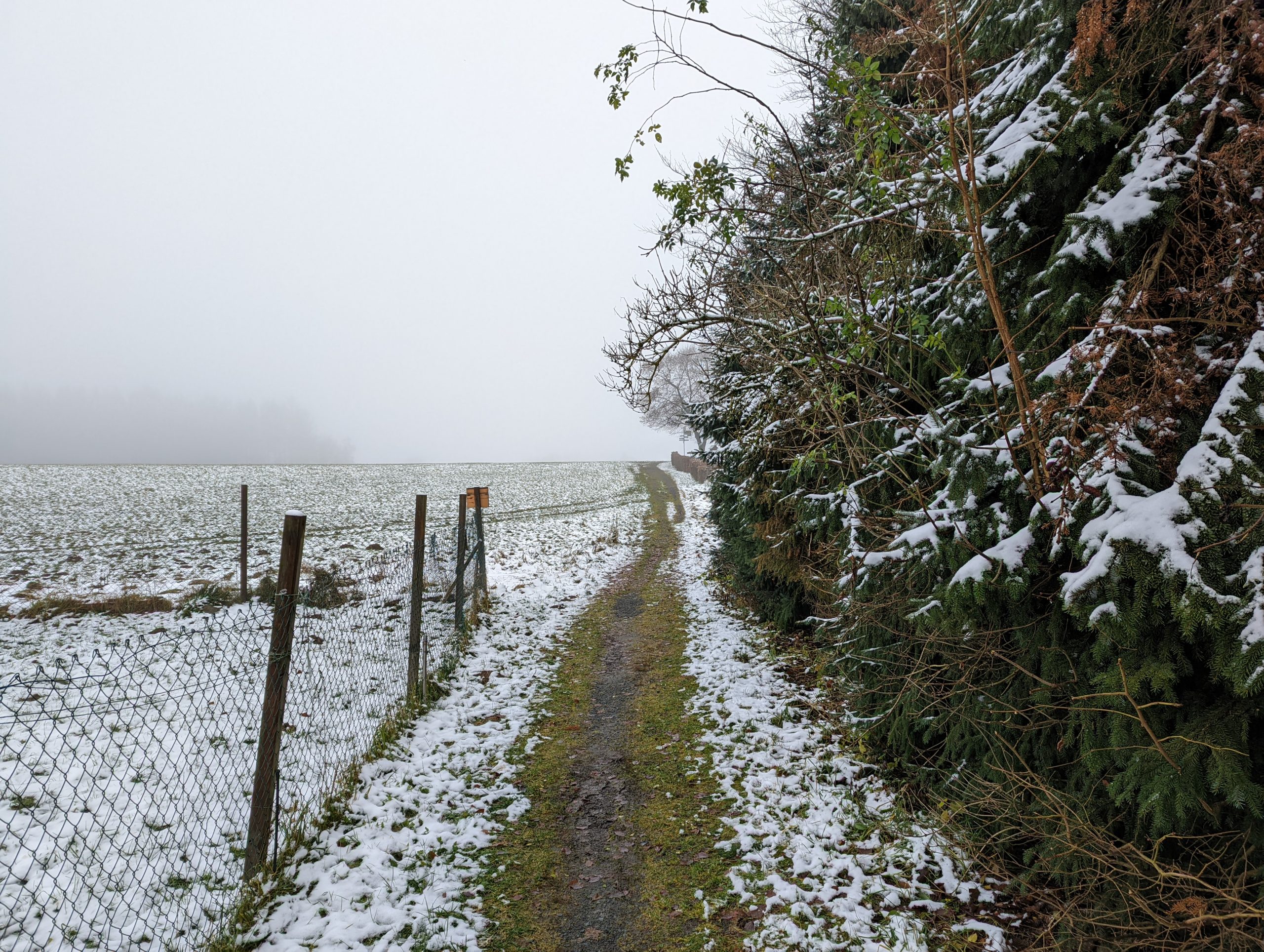 Die vorletzte Etappe führ in bekanntes Gebiet hinein. Es sollte eigentlich trocken sein, aber Schneeschauer und Wind von Nord machen die Strecke nicht einfacher. Das Wiedtal ist jetzt breit und der Rand erhebt sich in sanften Wellen entlang der Talaue. Ab Höchstenbach wird die Wied endgültig zum Bach mit Bachtal im Wald.