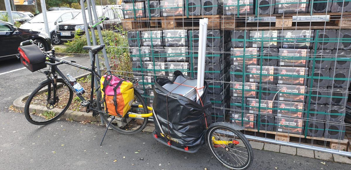 Das Einkaufsgut wird mit einem Fahrradanhänger transportiert. Für Lebensmittel kommt der Weber monoporter mit wasserdichter Tasche zum Einsatz. Die entsprechende Kupplung ist an zwei Rädern verbaut, einem schwarzen Rixe Alurad mit Kettenschaltung und Scheibenbremsen und dem auf Basis eines Edelstahlrahmens selbst zusammengeschraubten Trekkingrad mit Kettenschaltung und hydraulischen Magura Felgenbremsen. Im Winter bekommt das Rixe Spikereifen.