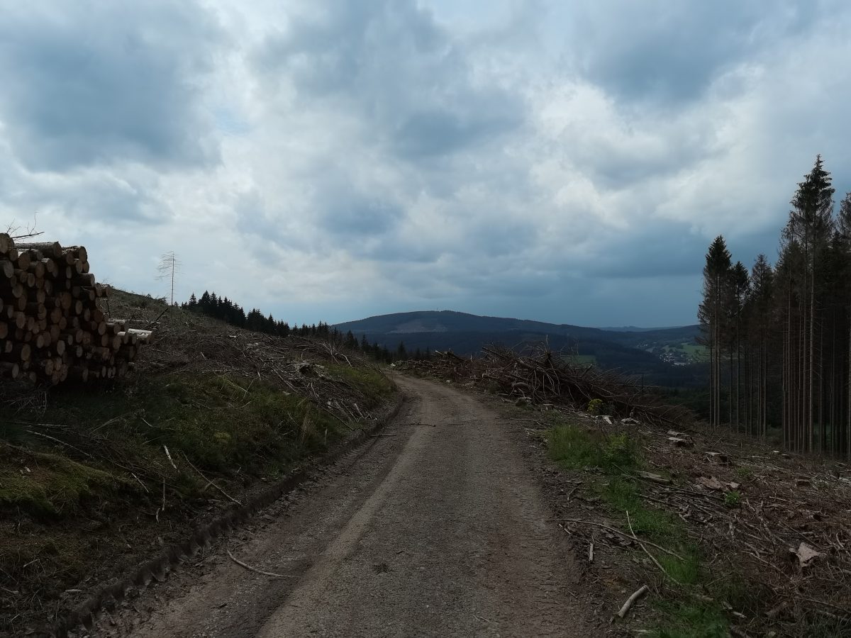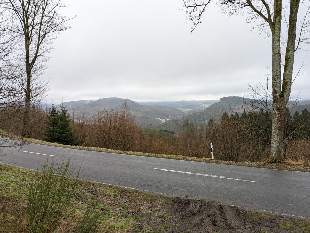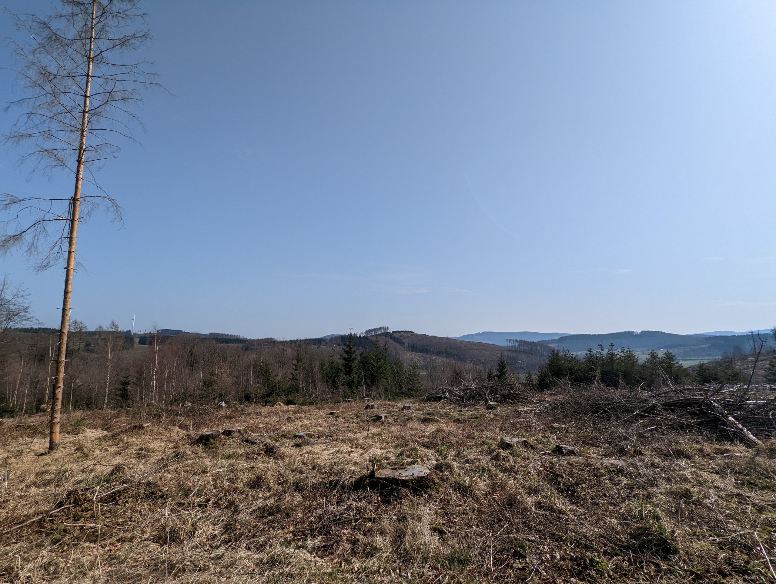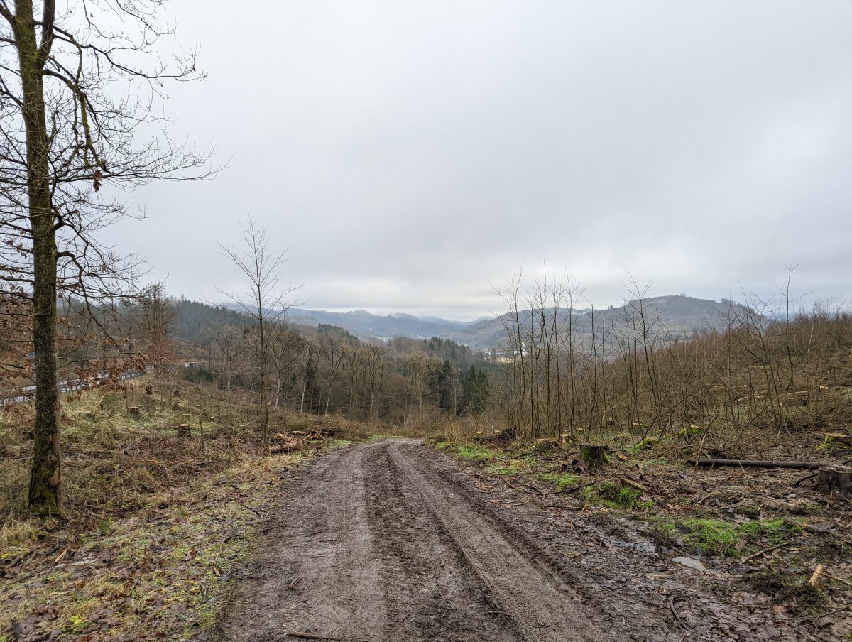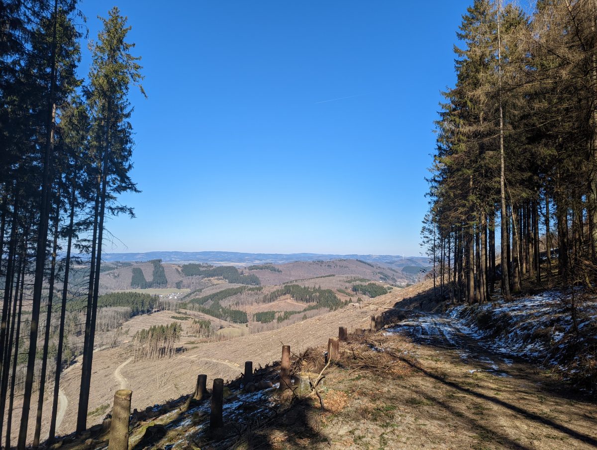 Diese Etappe schließt im Süden eigentlich an der 2. Etappe des Weges an. Wir sind auf dem Hinweg zu Biggesee und haben somit dieses Teilstück gewählt. Es ist der erste Tag im Jahr 2022 und wir wandern bei relativ warmen Wetter mit etwas Sonnenschein. Durch die riesigen Abholzungsflächen gibt es immer wieder weite Aussichten ins Land hinein.