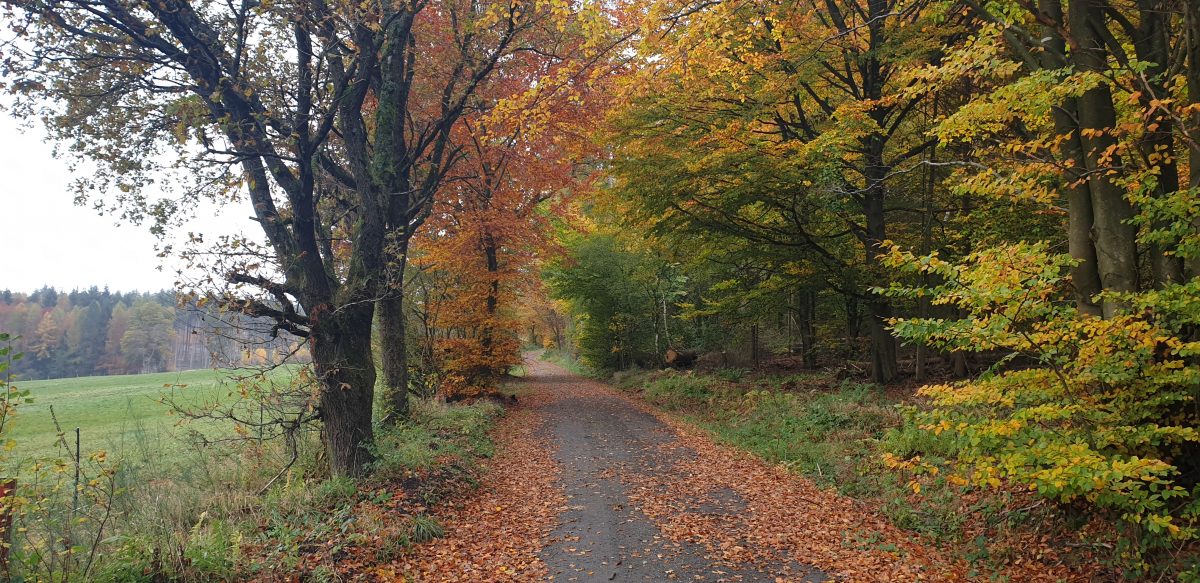Nauort ist auf Wald- und Wiesenwegen und mit dem Rad auf ähnlicher Strecke (ca. 26 km) erreichbar. Unser Nissan Evalia kann problemlos ein normales Rad oder zur Unterstützung beim Laufen einen Tretroller transportieren. Die Bilder entstanden beim Rollern von Nauort nach Kunidorf an einem Herbsttag 2021.