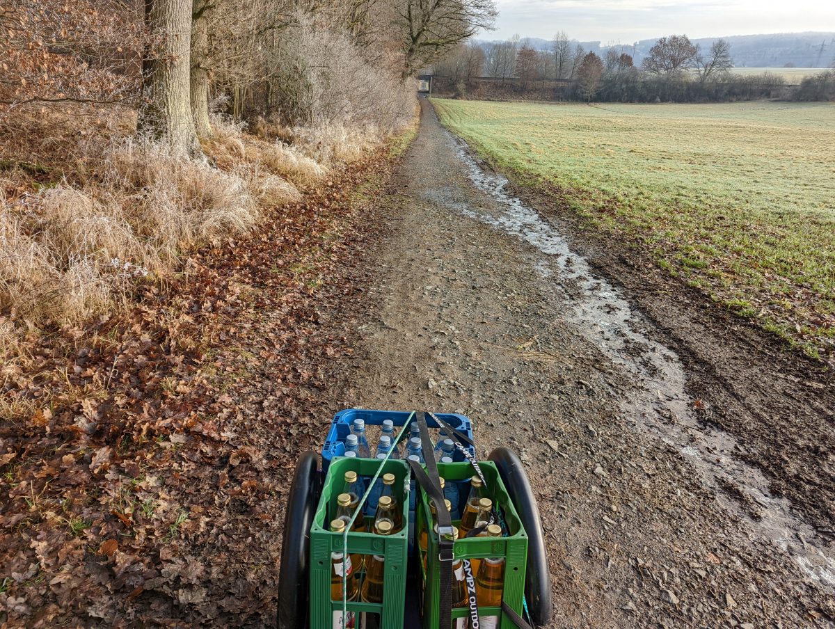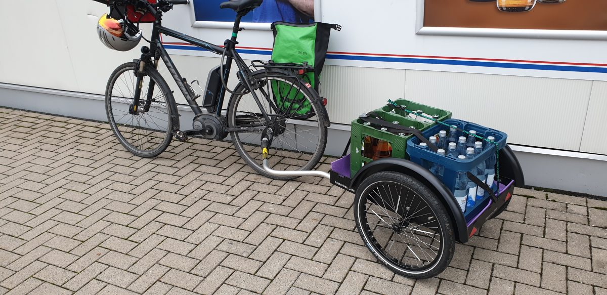 Mit 12×1 Liter Wasser und 2x6x1 Liter Saft ist der Anhänger gut beladen. Das E-Bike ist dabei bergauf eine unverzichtbare Hilfe.