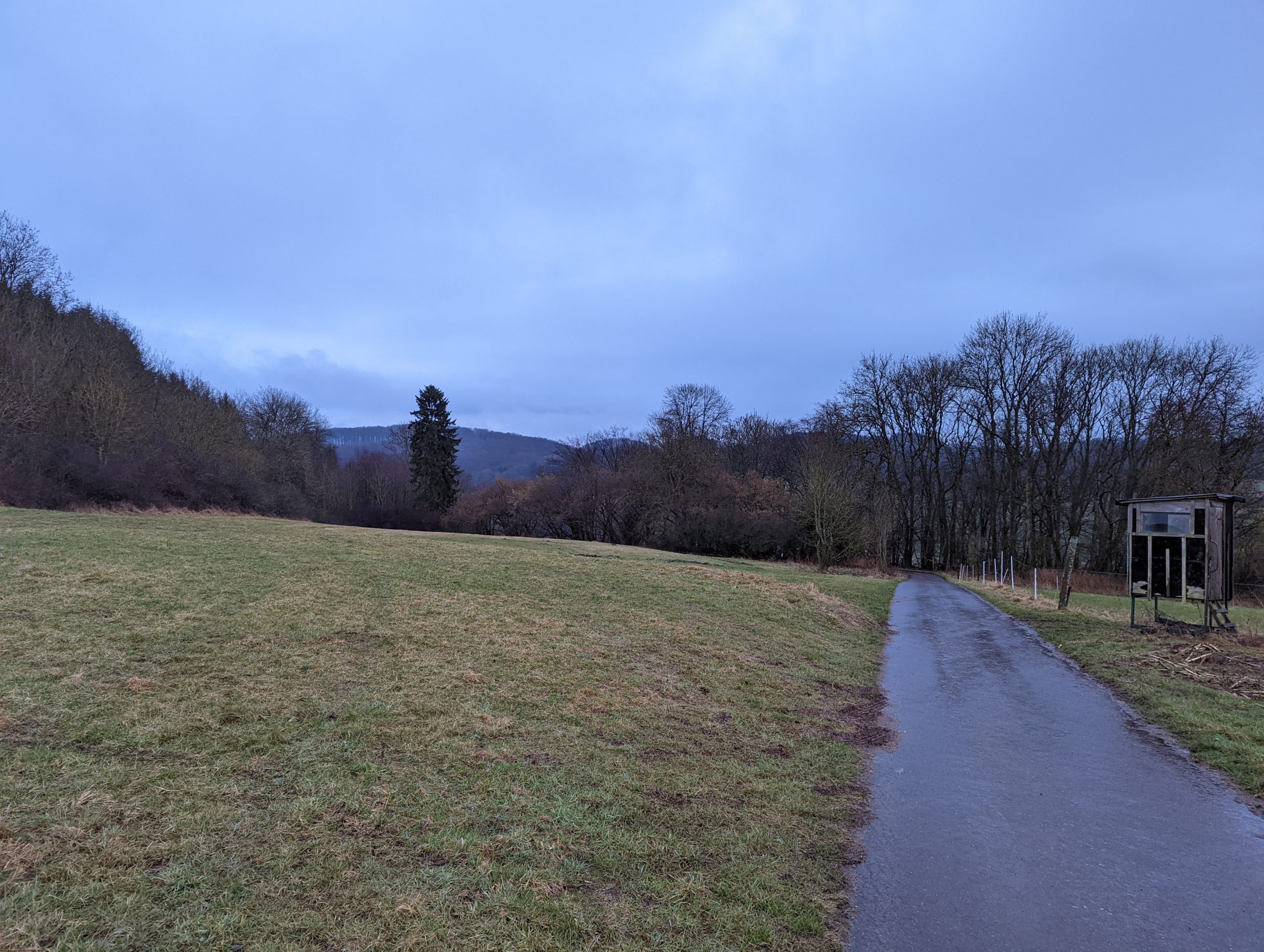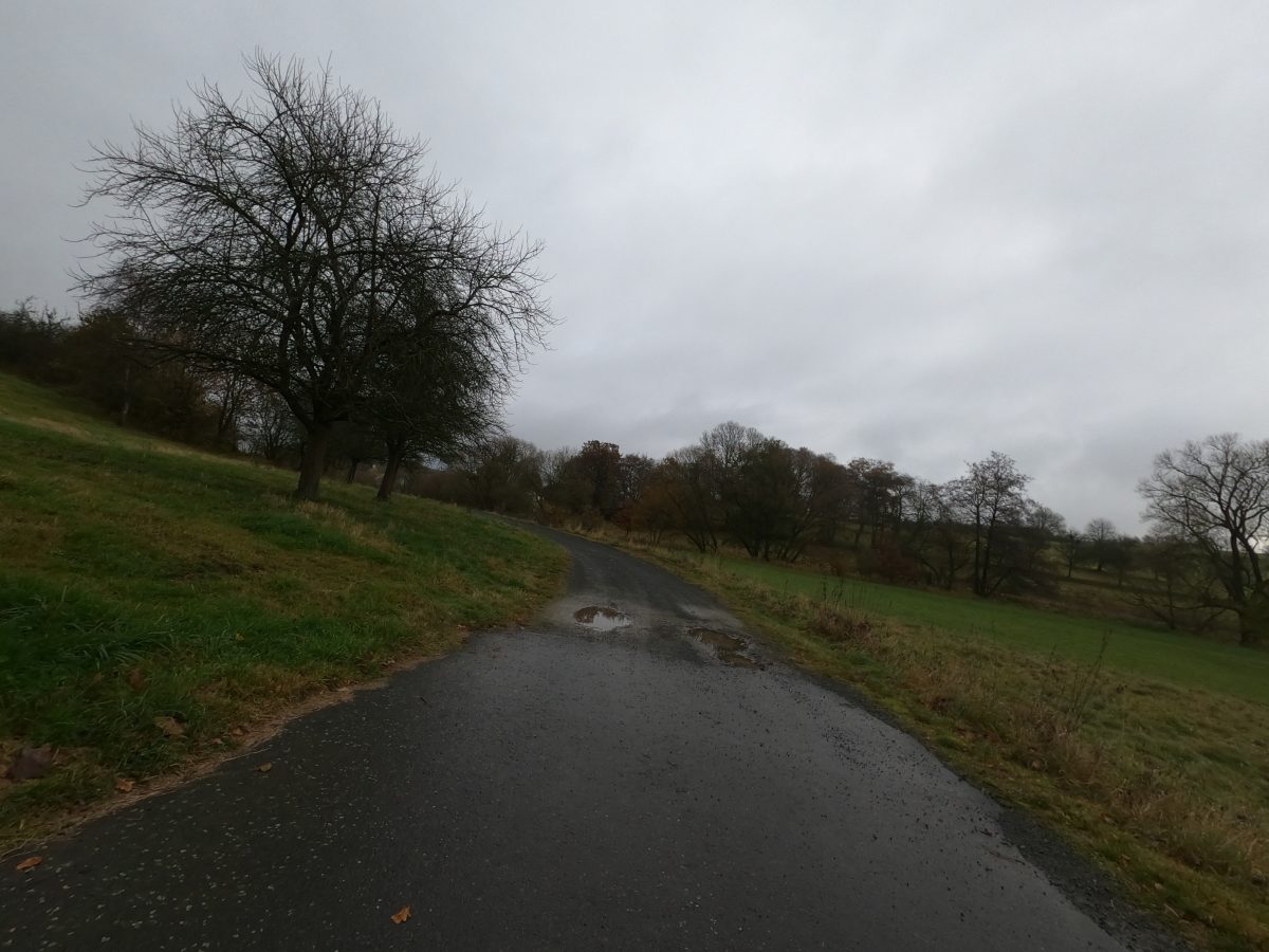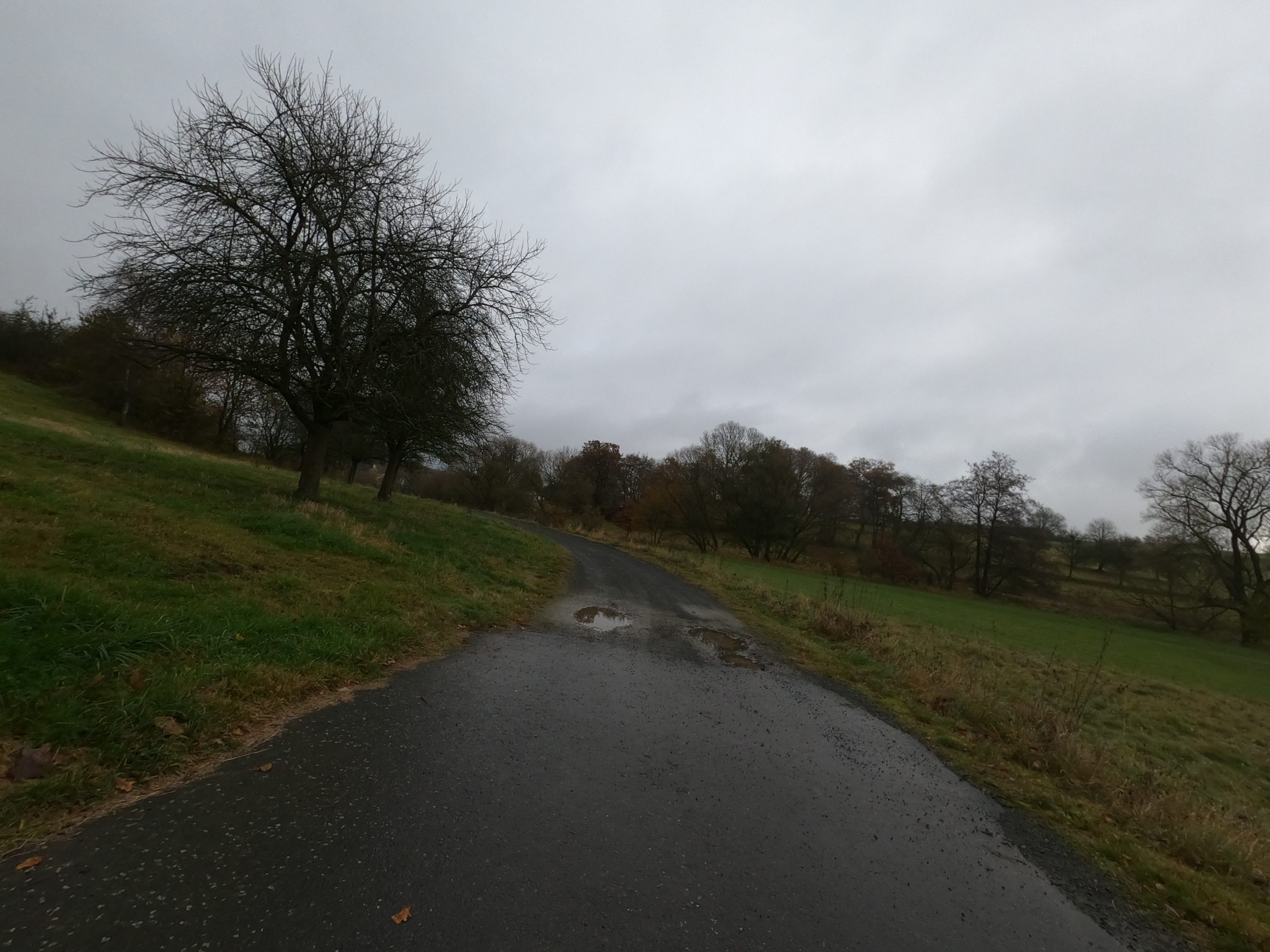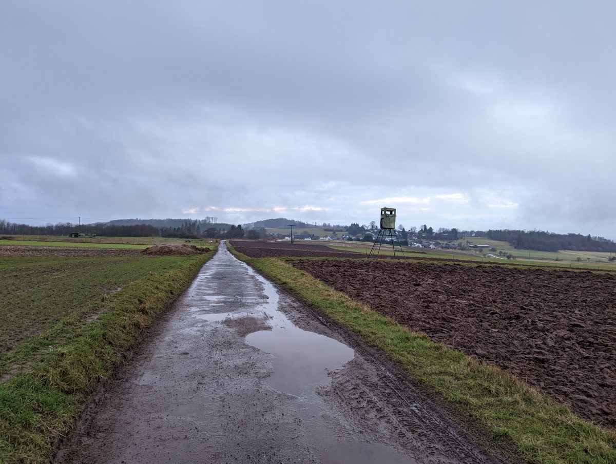 Die Alternativstrecke mit 250 Höhenmetern ist bis auf ein Stück Kreisstraße gut zu laufen, nur mittelschlammig in diesem feuchten Winter.
