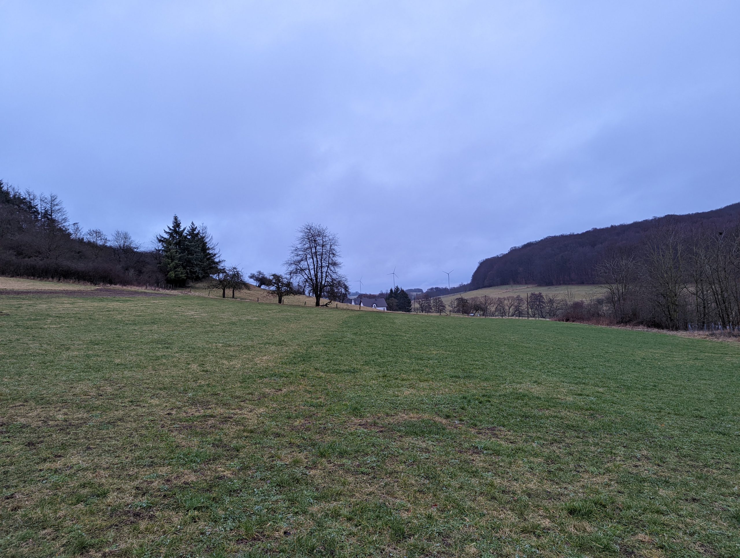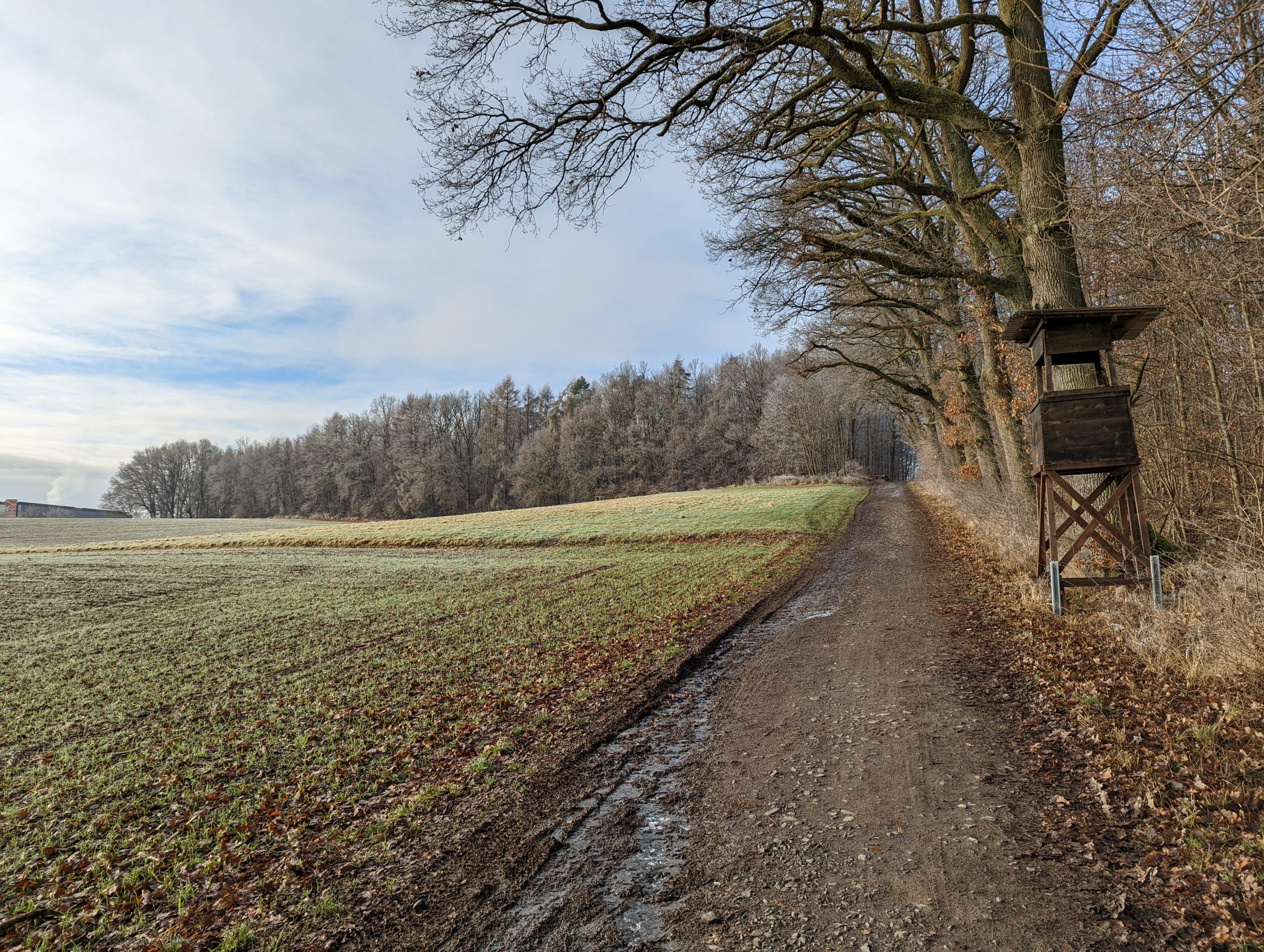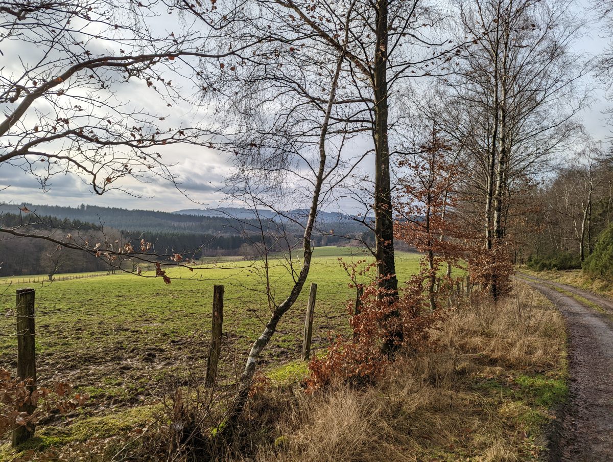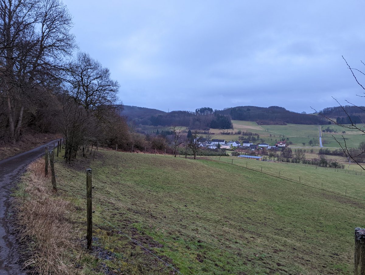 Die Alternativstrecke mit 250 Höhenmetern ist bis auf ein Stück Kreisstraße gut zu laufen, nur mittelschlammig in diesem feuchten Winter.