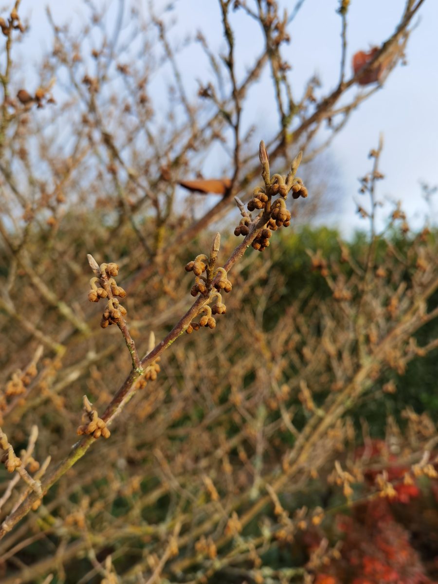 Schön findet es Kunigunde, wenn sie jetzt schon die Knospen der Frühjahrsblüher entdecken kann. Zum Beispiel die Knospen der Zaubernuss, der Kornelkirsche und sogar die ersten Blütenansätze beim Winterschneeball.