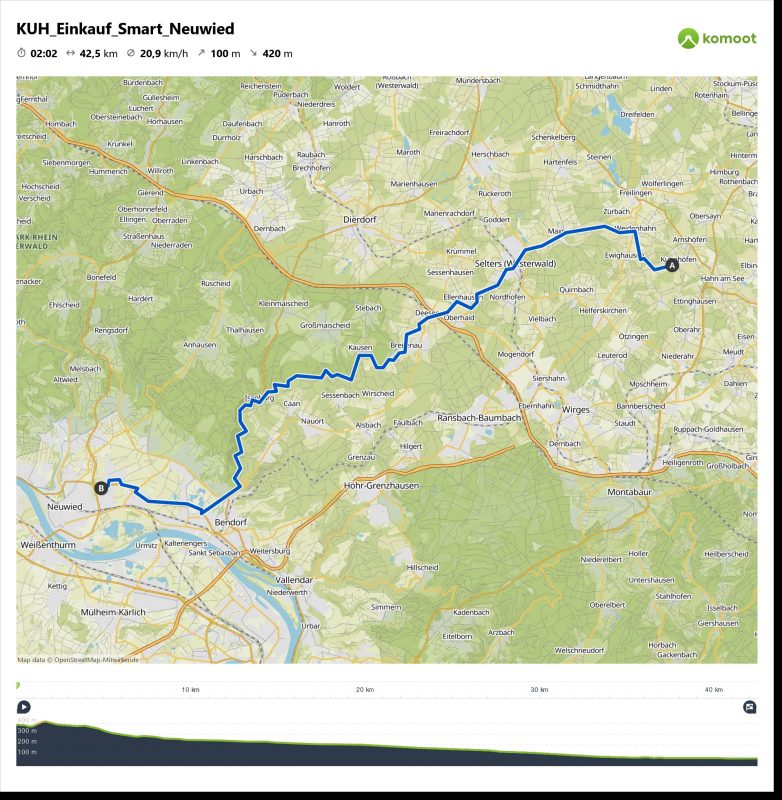 Wegen der 42 Kilometer Anfahrt kommt und der eingeschränkten Transportmöglichkeit unseres Smart ED kommt dafür nur das Tern Faltrad in Frage. Die Fahrtstrecke ist nicht autofrei, aber bis auf einen Abschnitt zwischen Maxein und Selters relativ stressfrei zu befahren.