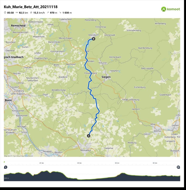 Die Strecke vom 12.11.2021 vom Biggesee nach Kunidorf. Erst kalt mit Sonne, ab Bad Marienberg kalt ohne Sonne mit Nebel. Die Umgehung Tunnel Freudenberg war gut mit Aussicht und fahrbaren Wegen an den Windrädern vorbei. Die Nebelstrecke in der Dämmerung zog sich dann. Steil bergauf bis Langenhahn, dort kein Radweg an der B255 mit dem Nadelöhr Bahnübergang.