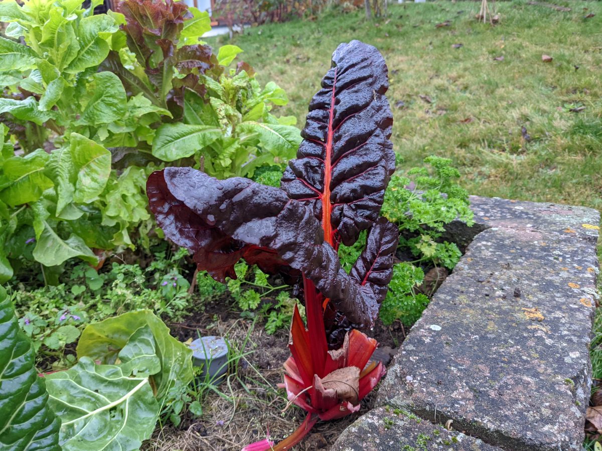 Die Mangoldpflanzen können ebenfalls in den Hochbeeten stehen bleiben. Die äußeren Blätter hat Kunigunde abgeerntet und in der Küche verarbeitet. Solange es noch keinen Schneeeinbruch gibt und die Temperaturen nicht so stark absinken, werden nach und nach noch einzelne Blätter geerntet.