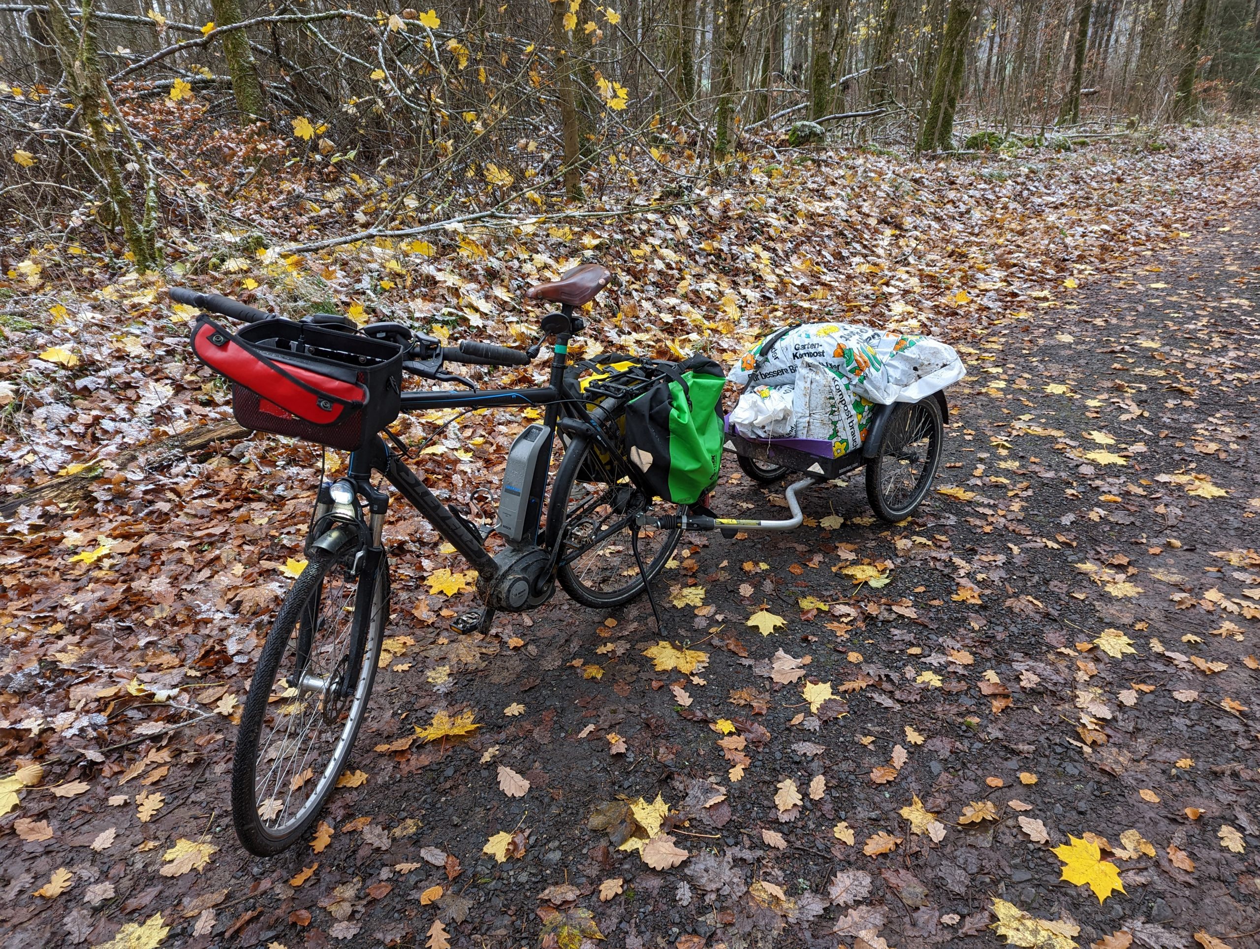Mit E-Bike und Anhänger werden bei einem ersten Besuch 3 Säcke je 40 Liter aufgeladen. Das ist bei dem schweren nassen Material aber eher zu viel für den Anhängerbetrieb. Die erste Fahrt bei erstem Schneefall im Dezember 2022 war auch der erste Einsatz der Heizsocken und Handschuhe. Die Strecke führt über noch gut befahrbare Waldwege, die Leerfahrt geht mehr bergauf als bergab, was bei der Vollfahrt auf dem Rückweg hilft. Der Hinweg über Hellenhahn-Schellenberg ist wegen des letzten Kilometers vor der Deponie (Schlammstrecke) im Winter nicht zu empfehlen.
