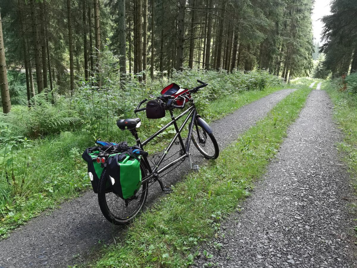 Um eine größere Strecke zu bewältigen wurde dieses Mal das Tandem mitgenommen. Dabei gingen wir aber auch davon aus, dass bei größeren, steilen und unwegsamen Abschnitten das Tandem geschoben werden muss. Startpunkt war der Wanderparkplatz am Rhein-Weser-Turm. Von dort ging es bis zum Dreiherrnstein.