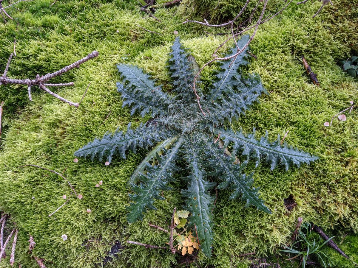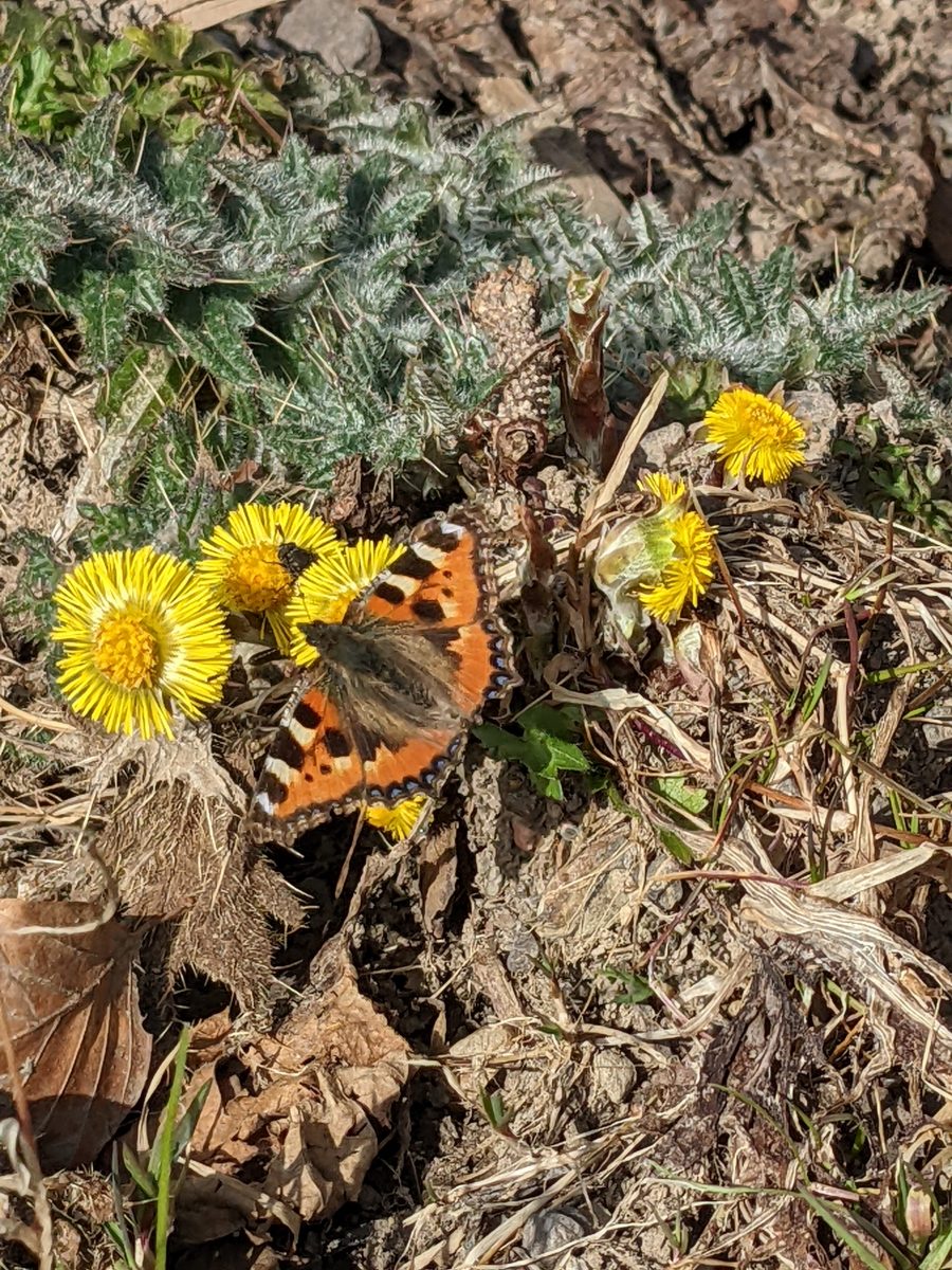 Vom Wanderparkplatz am Skilift verläuft der Weg nun in die andere Richtung. Die erste Wegstrecke ist dabei noch gut zu erwandern. Auf dem Rückweg, der über dem Wanderweg X8 verläuft müssen wir aber über viele umgestützte Fichten klettern oder umgehen. Schön ist es, die ersten Schmetterlinge (kleiner Fuchs) zu sehen, die an den Huflattichblüten Nektar saugen.