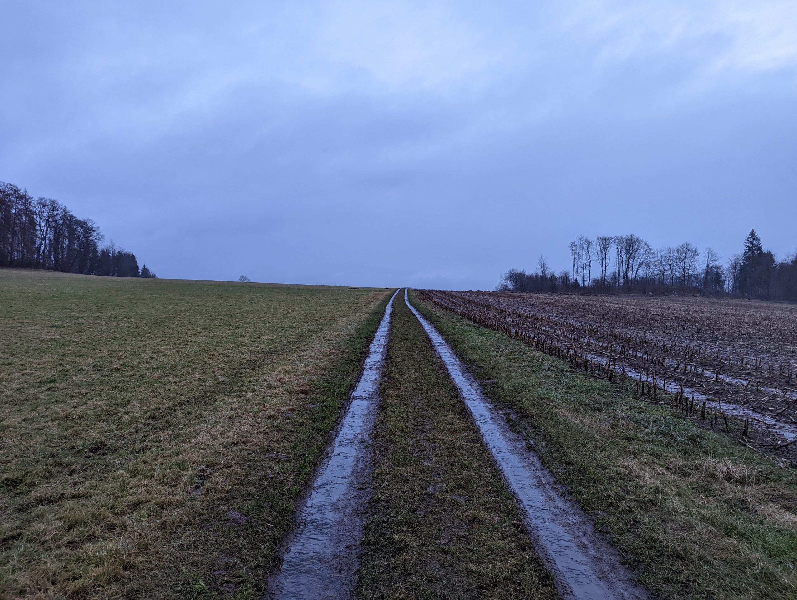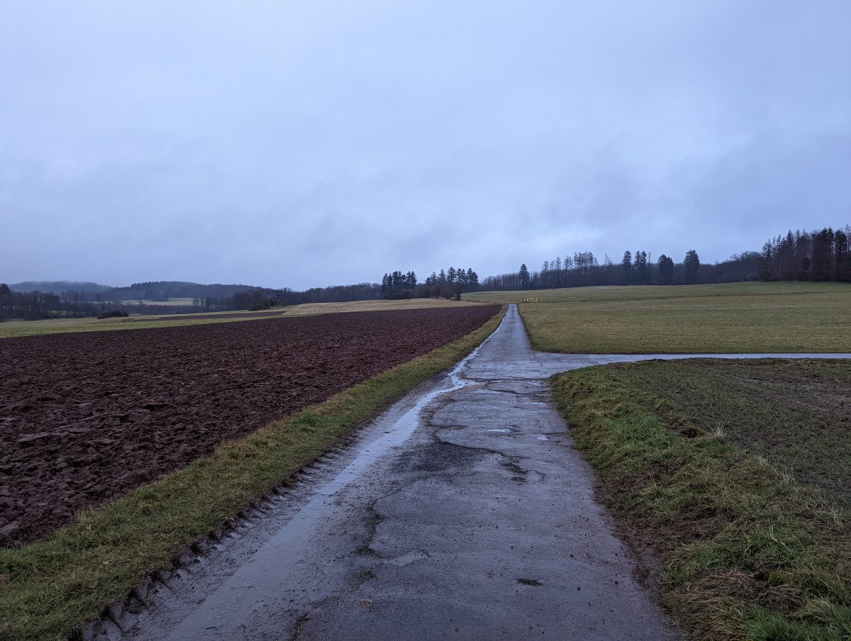Der Weg in den Osten ist eine autofreie Rad- und Laufstrecke mit festem Untergrund und auch im Winter gut zu fahren und zu laufen, wenn nicht gerade gefrorener Schnee aufliegt. Leider ist der nächste Bäcker in dieser Richtung jetzt 11 statt 8 Kilometer entfernt und ein paar Höhenmeter kommen auch noch dazu.