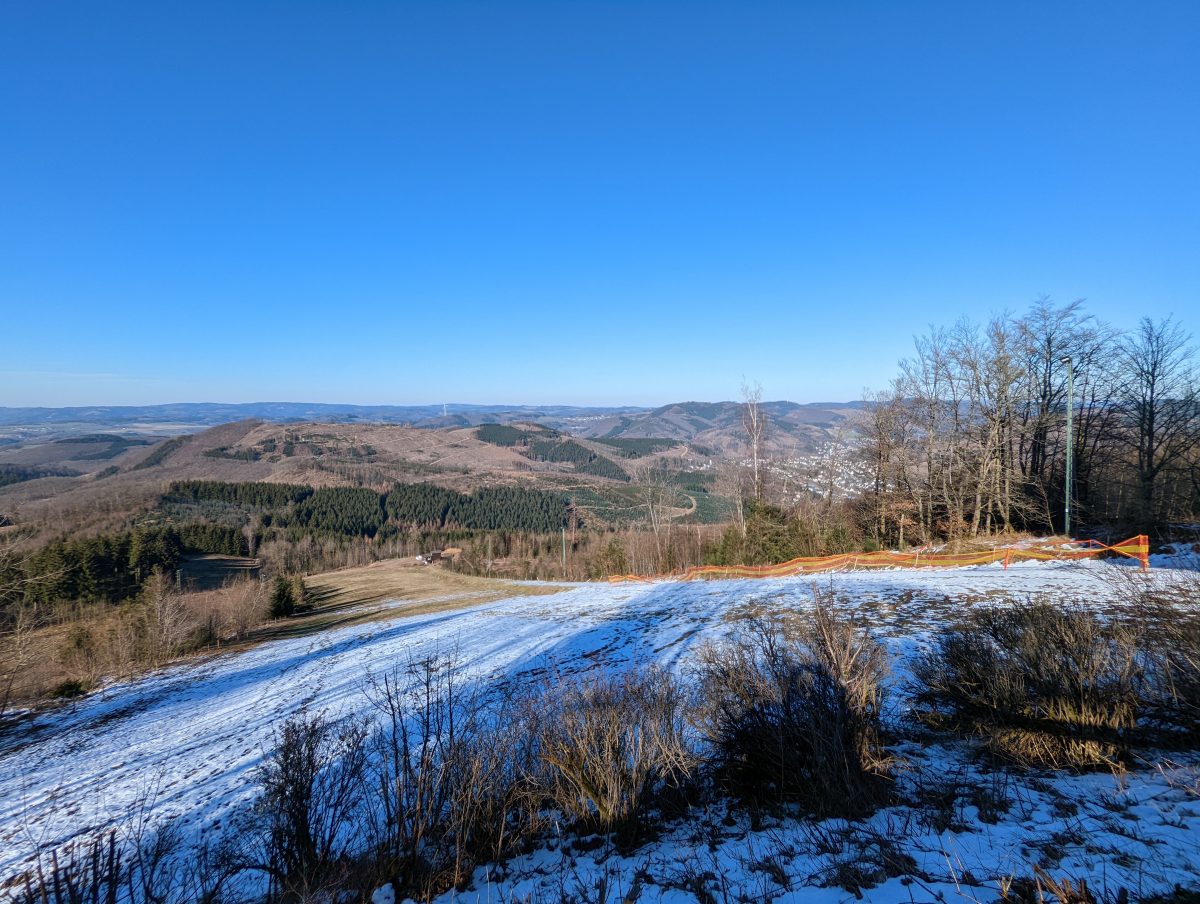 Nach einer längeren Pause im Winter, die wir in Kunidorf verbracht haben, sind wir wieder zum Biggesee gefahren. Nachdem das Wetter nun längere Zeit kalt aber sonnig war, sind die Wege wieder besser zu begehen. Allerdings gab es in der Zwischenzeit einige Winterstürme. Dadurch sind nochmals viele Bäume umgestürzt und liegen auf den Wanderwegen. Aber immer wieder gibt es weite Fernblicke ins Land, besonders natürlich auch von Start und Zielpunkt der Tour, die “Hohe Bracht”.