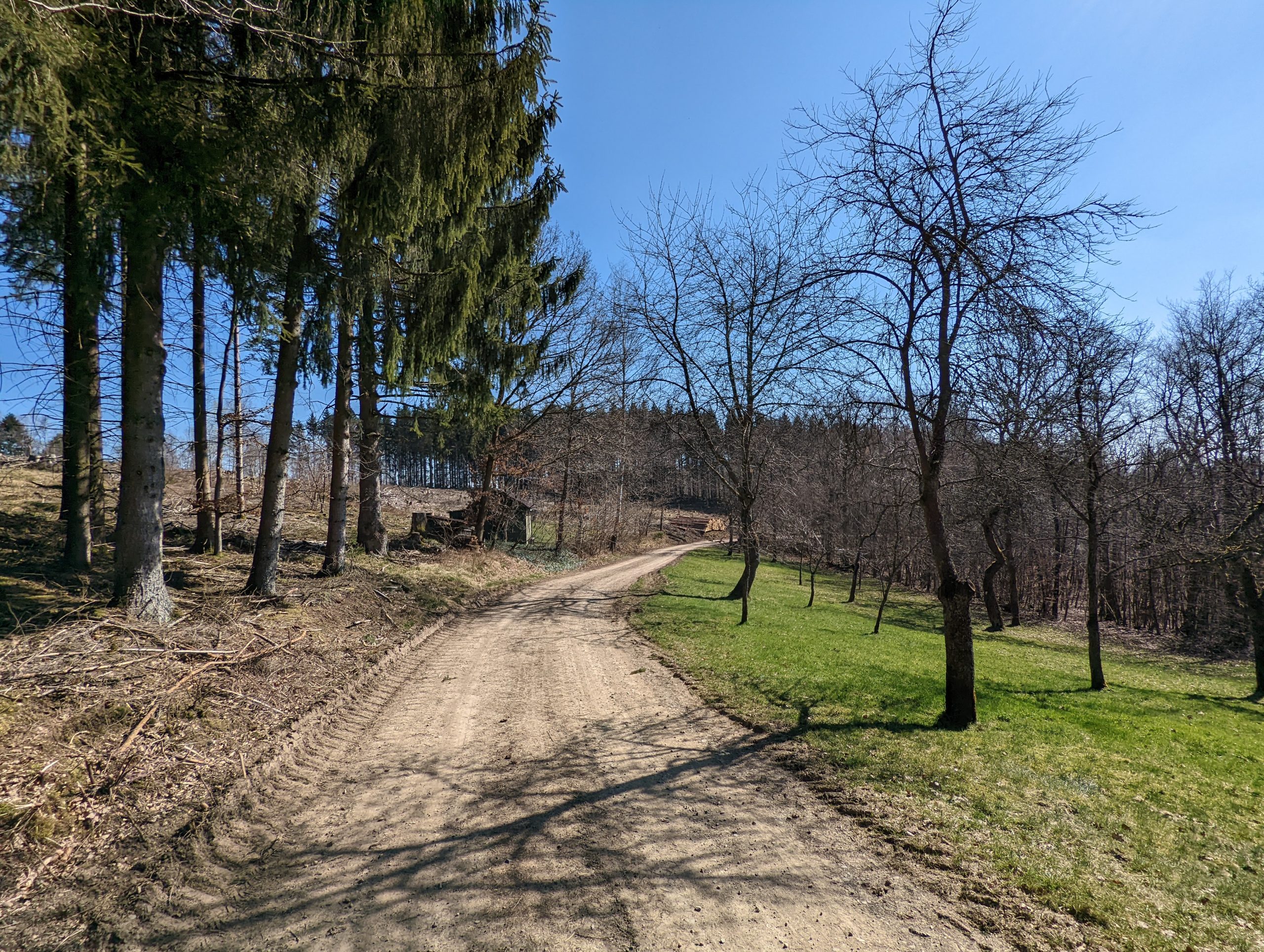 Es gibt einen Waldweg, über den man von Norden die K103 erreichen kann. Also typisches Westerwälder Radwegplanungsdesaster. Stört aber keinen.