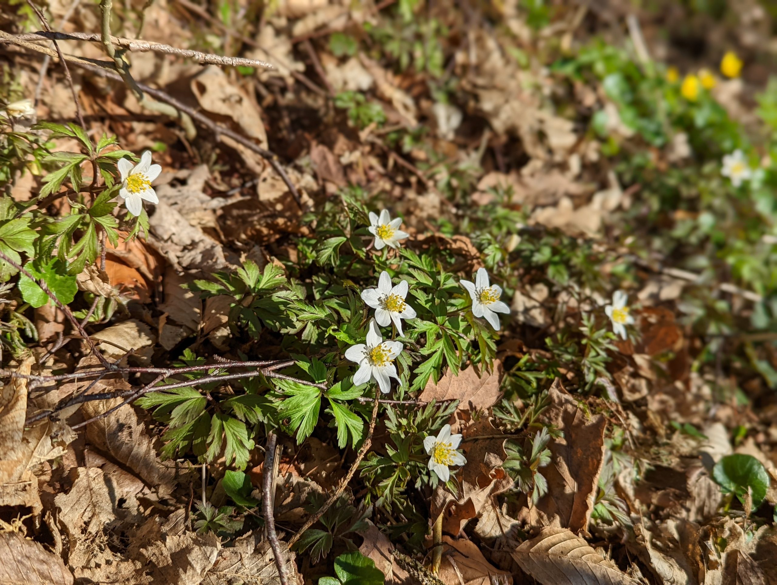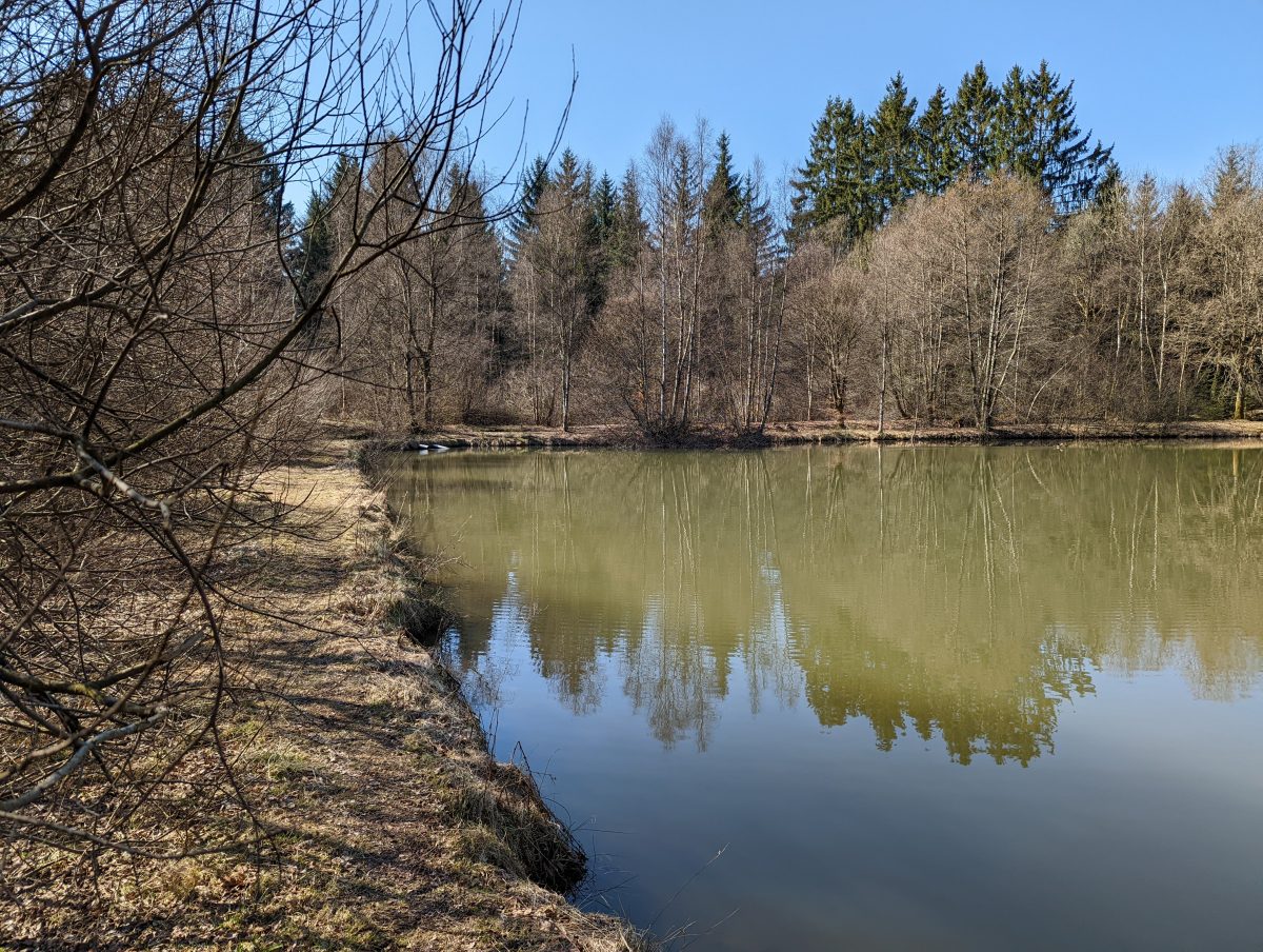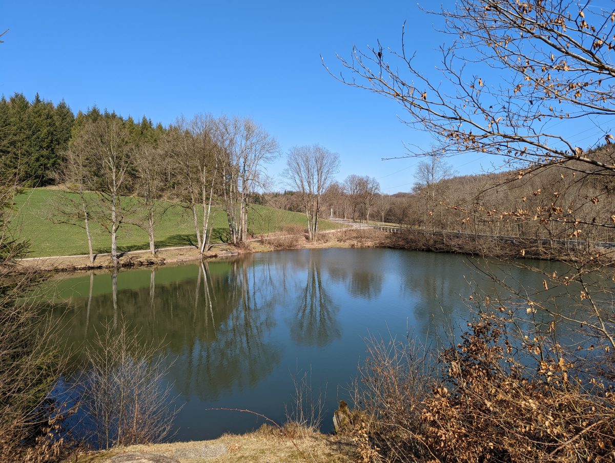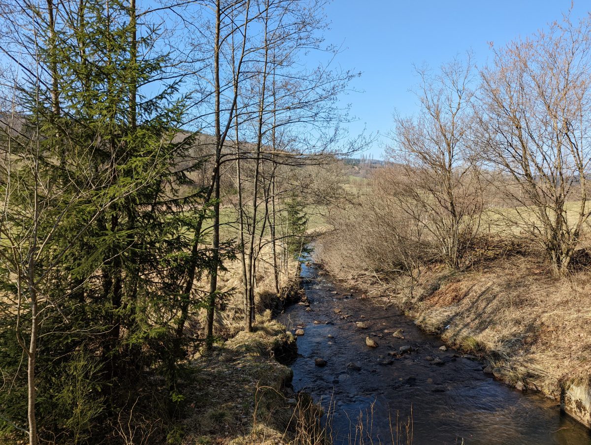 Das Wetter ist Ende März 2022 immer noch sonnig, trocken und nun schon sehr warm. Somit sind die Wegstrecken sehr gut zu begehen und es gab auch nur wenig neue Windbruchstrecken. Insgesamt eine sehr abwechslungsreiche Wanderung mit vielen traumhaften Aussichten aber auch romantischen Strecken an Flußläufen und vorbei an einem Angelteich. Dazu blühten sogar die ersten Buschwindröschen und das Scharbokskraut. Viele Schmetterlinge wie Zitronenfalter und Kleiner Fuchs suchten nach dem ersten Nektar, zumeist immer an Huflattichblüten.