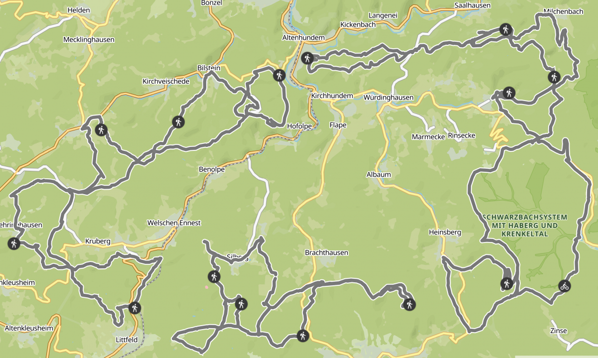 Nach ersten Erfahrungen mit Etappentouren auf Fernwanderwegen (Valberter-Rundweg, Odenwälder Burgenwanderweg) haben wir uns für unsere Tage mit Aufenthalt am Biggesee den Hundem-Paad ausgewählt, der im südlichen Sauerland zwischen Lennestadt und Hilchenbach Kirchhundem umrundet.