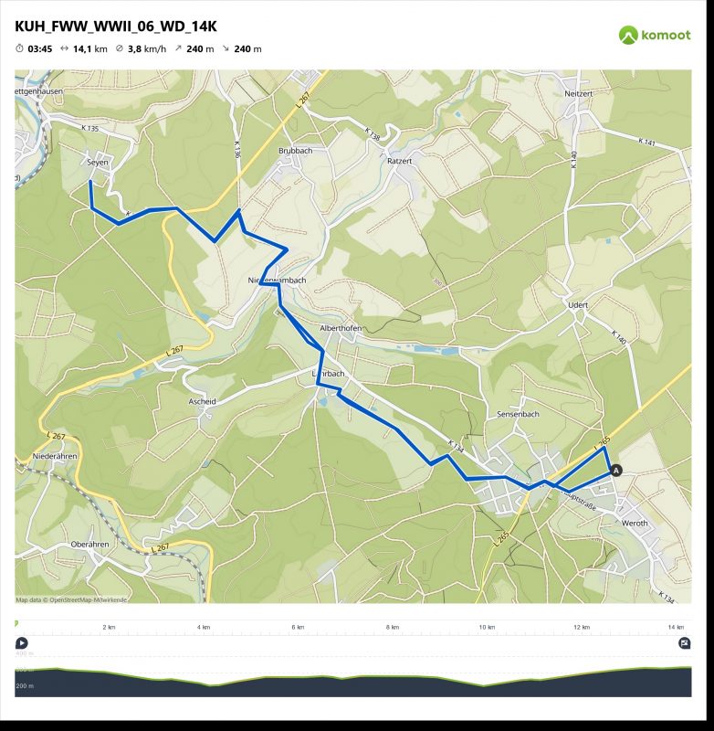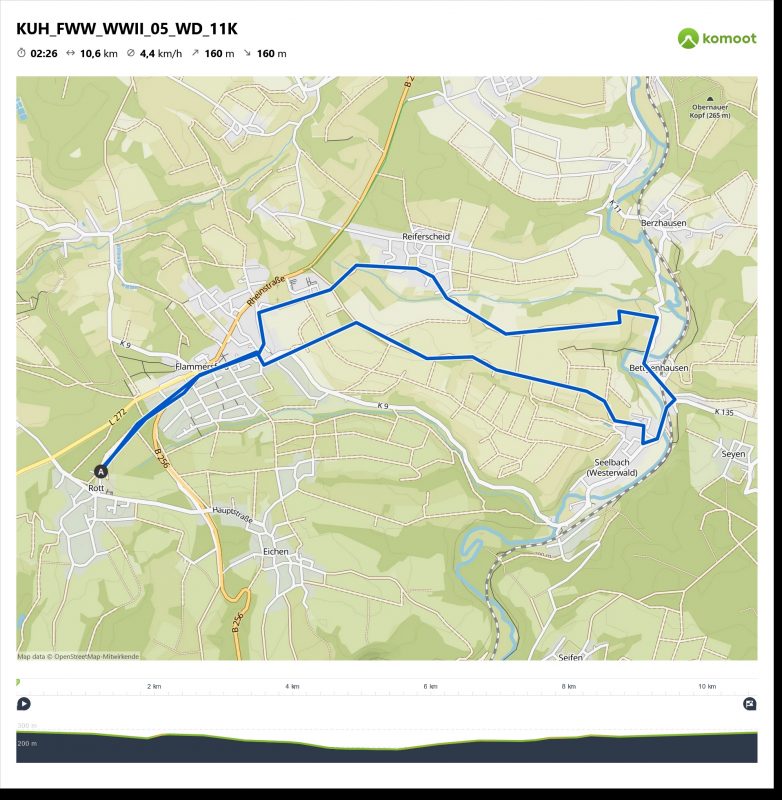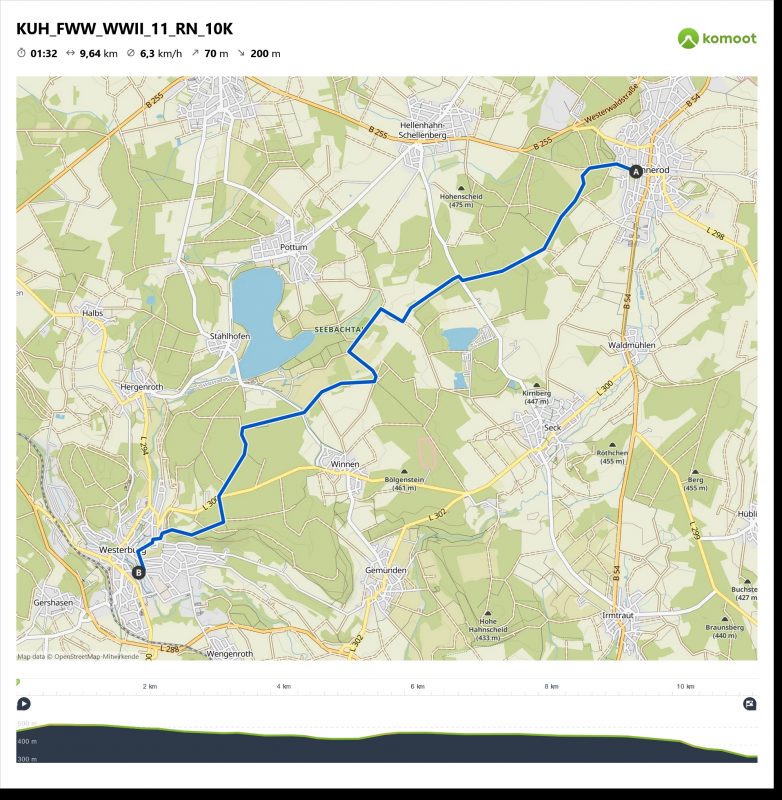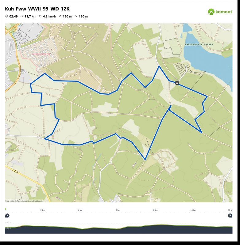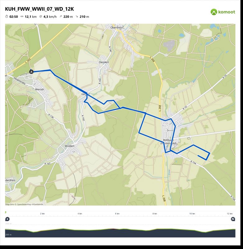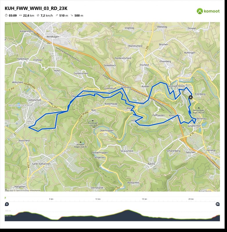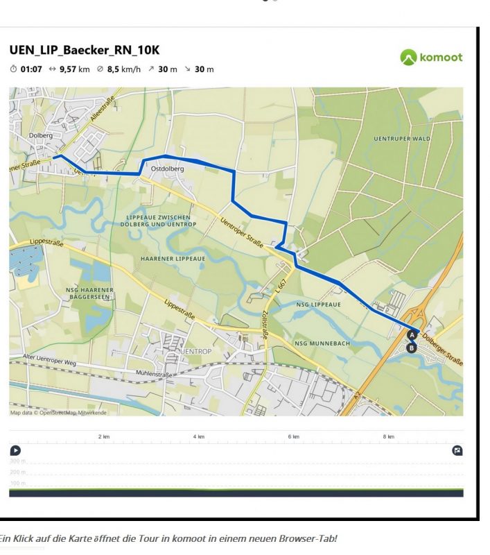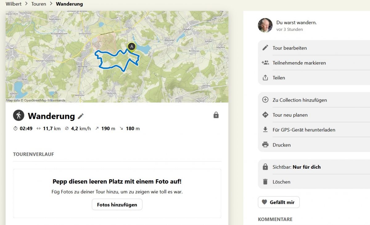 Die Strecke wird in komoot gespeichert und veröffentlicht. Es wird ein Bild der Tour aufgenommen und als Medium hochgeladen und auf der Webseite zur Darstellung des Tracks angezeigt. Ein Klick auf das Streckenbild öffnet die komoot Webseite in einem neuen Tab.