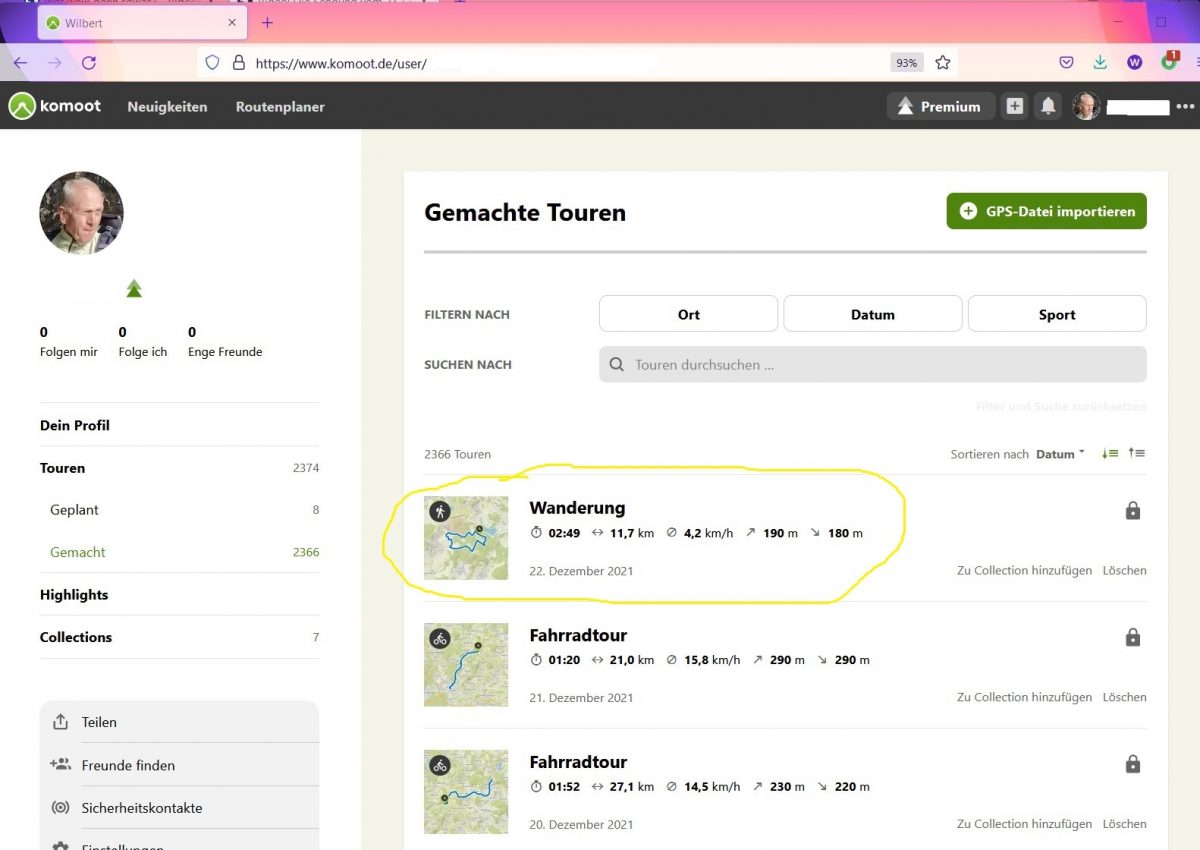 1. Unsere Tourdaten landen nach der Aufzeichnung über eines unserer Garmin GPS Geräte und eine unter Garmin Connect eingerichteten Weiterleitung im Tourenportal Komoot in der Tourenliste “gemacht”.