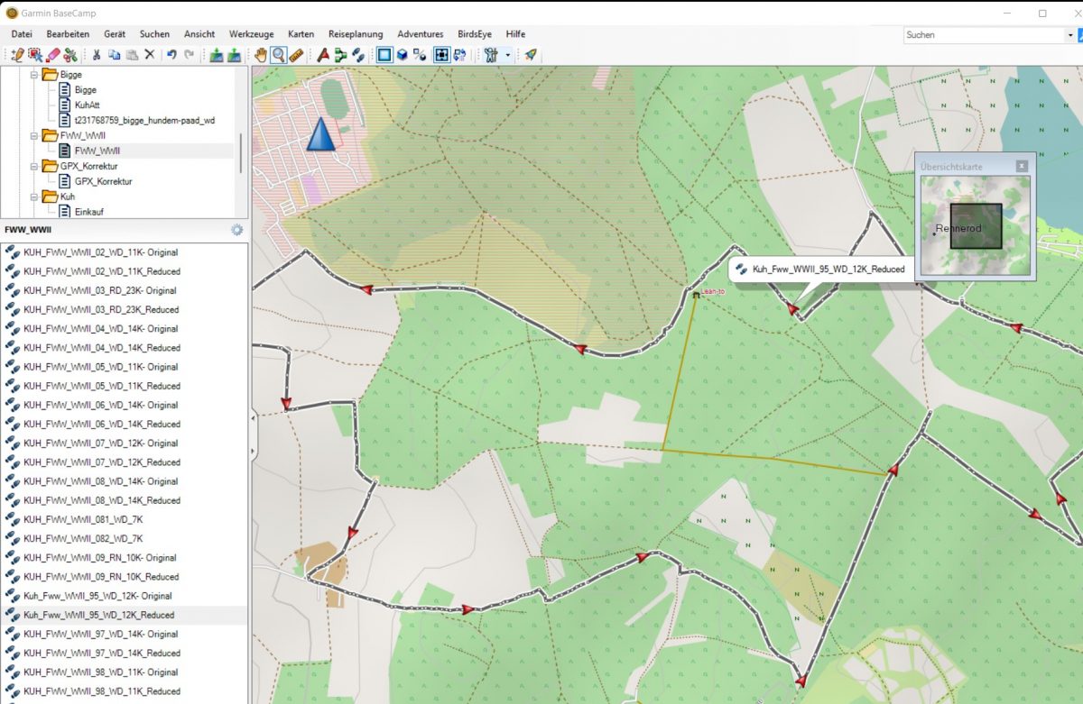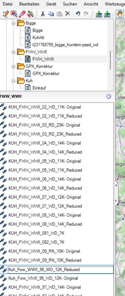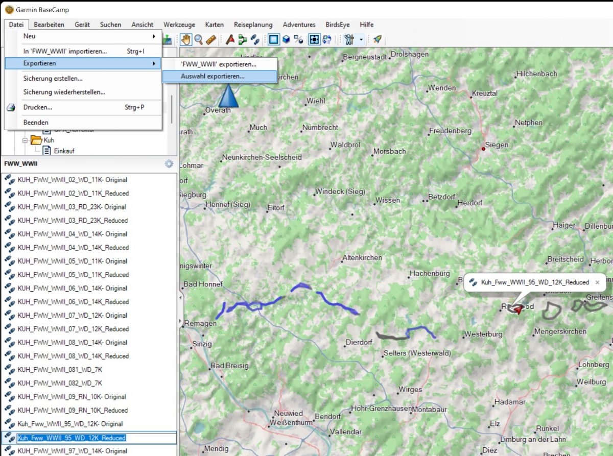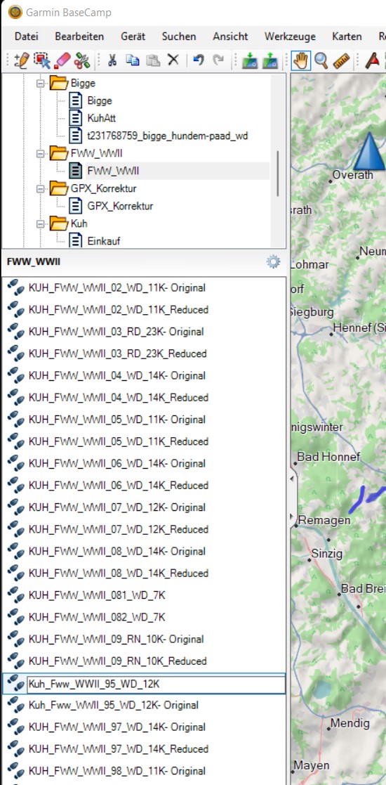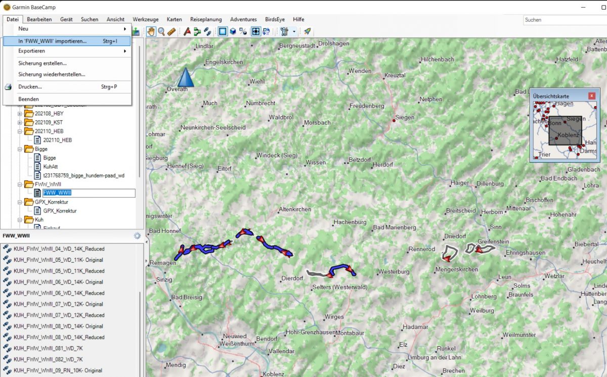 6. Mit dem auf dem lokalen PC installierten Garmin Programm Basecamp wird der GPX Track importiert. Die dazu verwendete Ordnerstruktur orientiert sich an der Gliederung der Tourdaten, im Beispiel gibt es einen Ordner für alle GPX Tracks der Touren auf dem Westerwald Hauptwanderweg Nummer II. Die hier schon vorher eingefügten Tracks werden im Kartenfenster angezeigt.