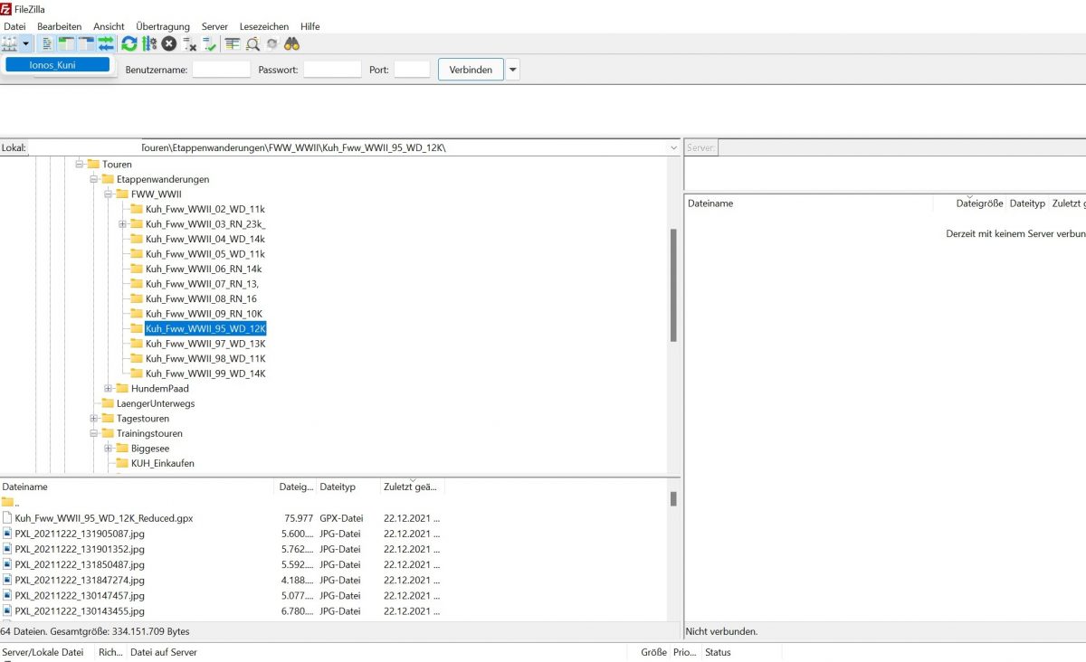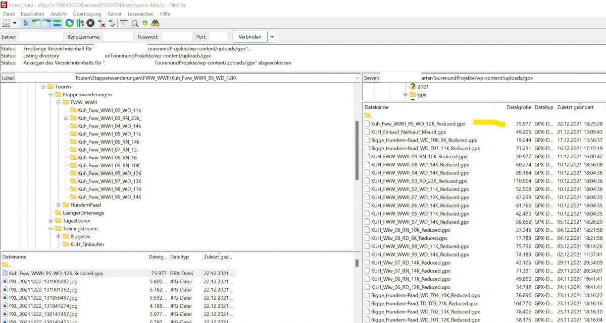 Nach der Anmeldung muss auf der rechten Seite der Ordner /clickandbuilds/GartenTourenundProjekte/wp-content/uploads/gpx angewählt werden. Die neue gpx-Datei wird dann per DragAndDrop von links nach rechts in diesen Ordner kopiert.